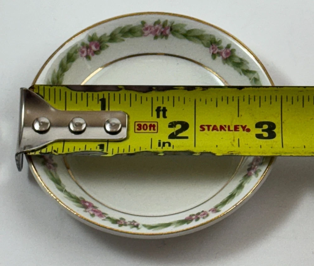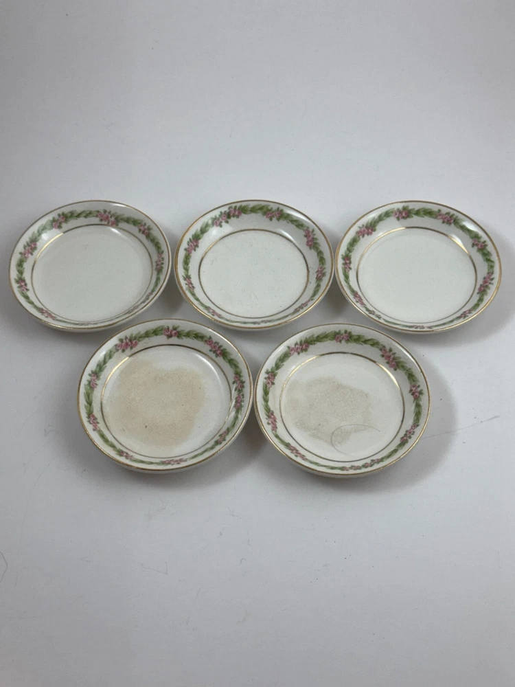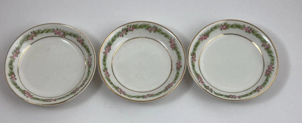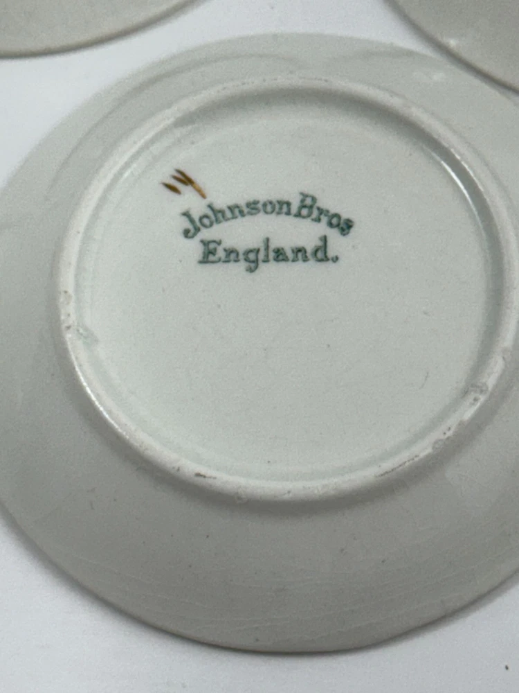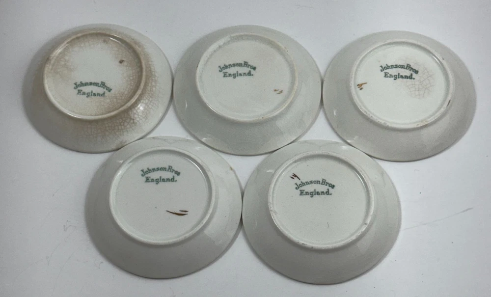 Elegant butter pat plates with a floral pattern and gold rim, made by Johnson Bros. • Made of fine porcelain • Floral motif with gold rim • 3-inch diameter • Vintage design by Johnson Bros • Made in England 2 plates show discoloration and crazing on front and 1 has crazing on the bottom as shown in the photos. I have adjusted the price accordingly. Diameter = 3 inches