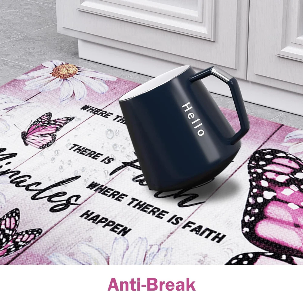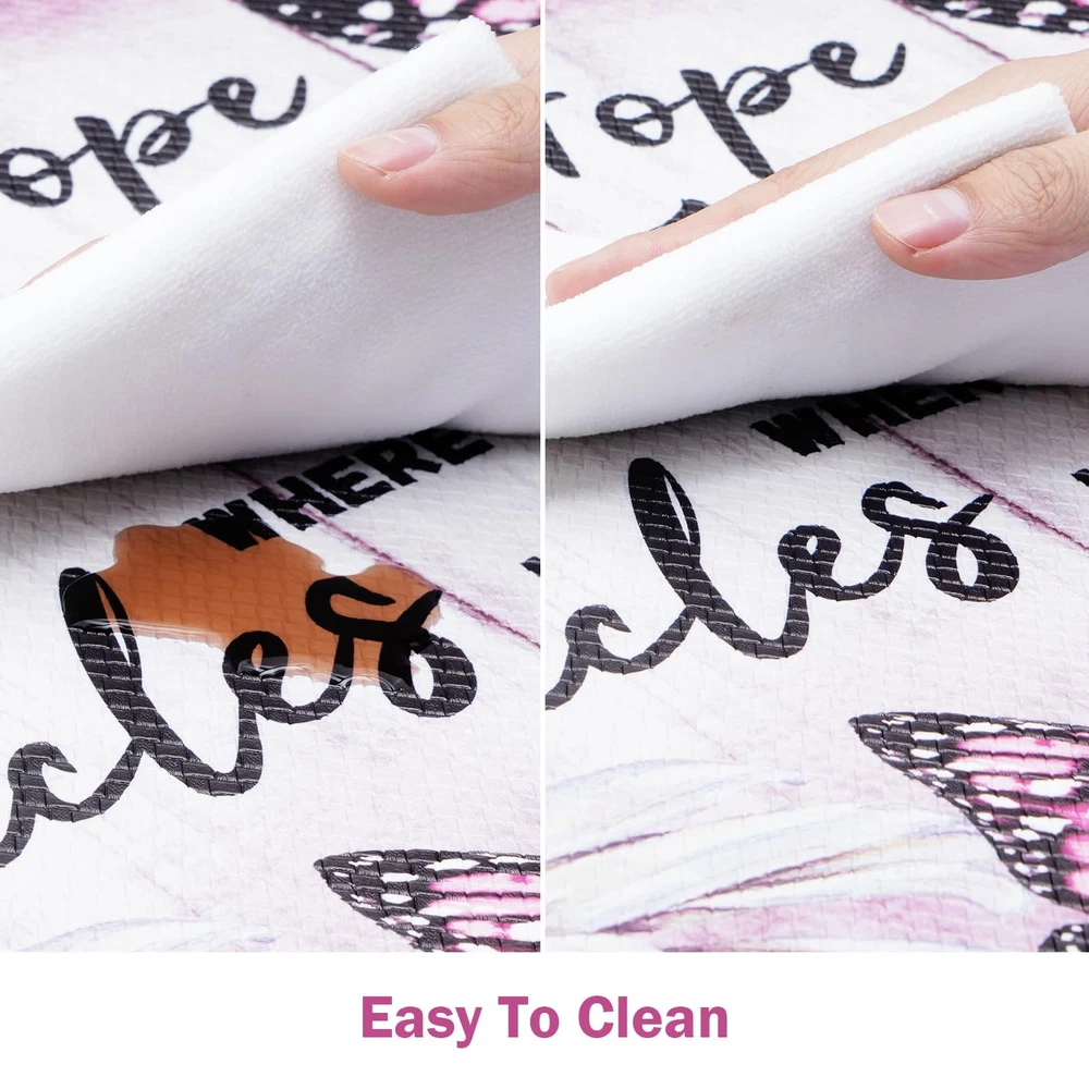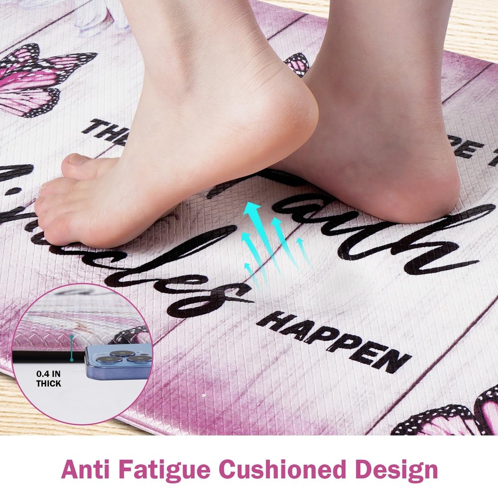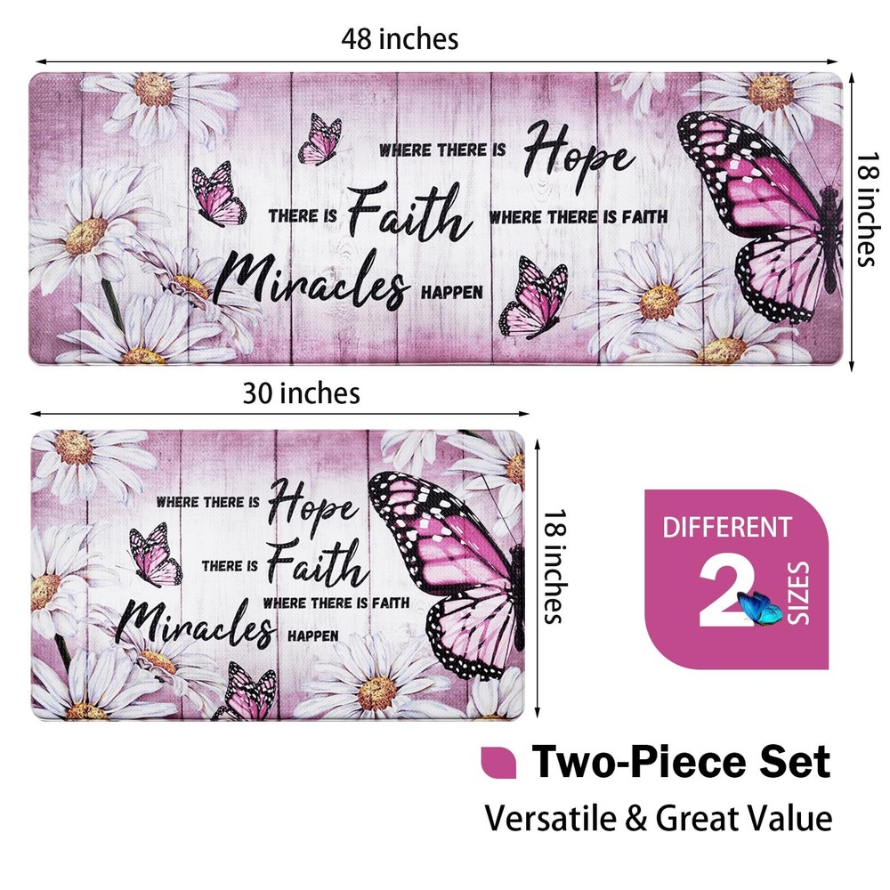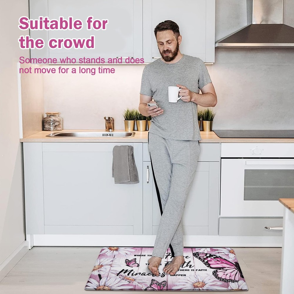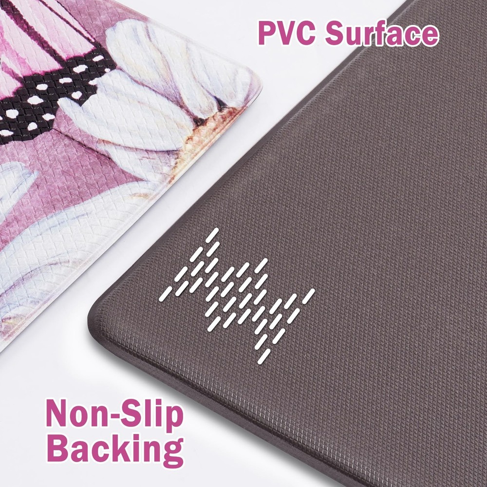1 ๐๐ซ๐๐ฆ๐ข๐ฎ๐ฆ ๐๐๐ญ๐๐ซ๐ข๐๐ฅ: This butterfly floral kitchen mats for floor is made of soft, comfortable and high quality PVC material and memory foam. It is environmentally friendly, durable and will not deform after long-term use. ๐๐จ๐ฆ๐๐จ๐ซ๐ญ & ๐๐ง๐ญ๐ข ๐ ๐๐ญ๐ข๐ ๐ฎ๐: Standing on the floor for a long time often causes foot pain and fatigue. Our farmhouse kitchen rugs have 0.4 inch thick memory foam, providing enough softness and support, which helps relieve foot pressure. ๐๐จ๐ง ๐๐ฅ๐ข๐ฉ & ๐๐๐ญ๐๐ซ๐ฉ๐ซ๐จ๐จ๐: This white daisy kitchen floor mats are designed with anti-skid backing rubber and special water repellent treatment. It helps to keep the mat in place, prevent it from sliding, which provides safety for your family. ๐๐ข๐ณ๐ ๐๐ง๐๐จ๐ซ๐ฆ๐๐ญ๐ข๐จ๐ง: Pink non slip kitchen mat set measure 48" L x 18" W and 30" L x 18" W, which both share a thickness of 0.4 inch. This standard size is suitable for most home kitchens. Please confirm whether the size is suitable for you. ๐๐๐ฌ๐ฒ ๐ญ๐จ ๐๐๐ซ๐: Our butterfly anti fatigue mats for kitchen floor are easily cleaned. It can be cleaned by a damp cloth, sponge or vacuum, saving you a lot of cleaning time and energy. Do not bleach them.