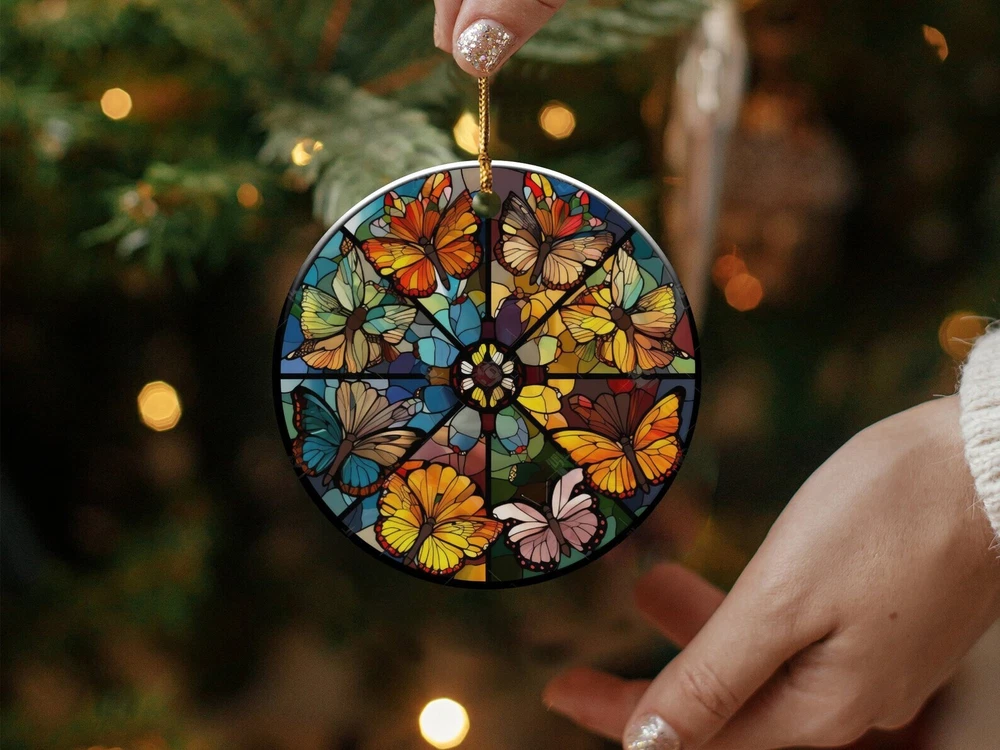 Butterfly Ornament Colorful Window Decoration Nature Inspired Home Decor Vibrant Hanging Car Accessory Artistic Gift Material: Ceramic Color: White Shapes: Circle, star, heart and oval Can be printed on both sides Imprint full-color artwork, photos, or logos Hole for hanging string and hanging string included Printed in the USA