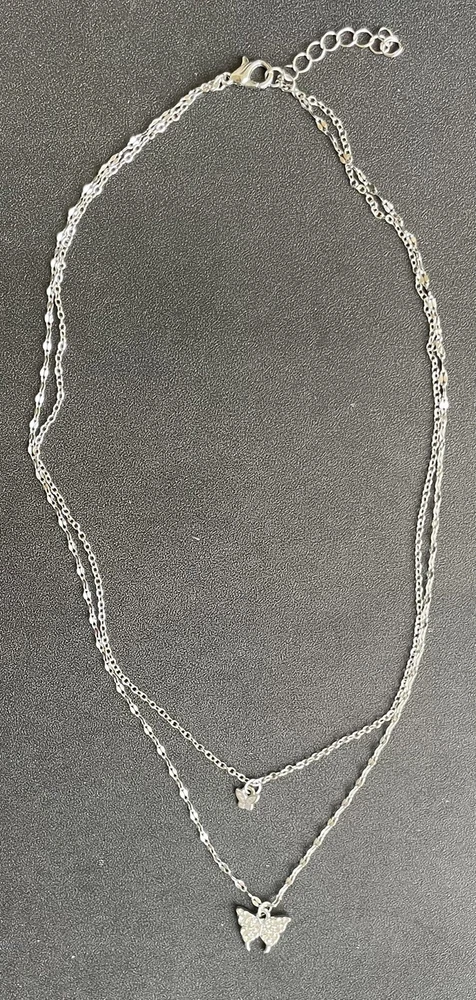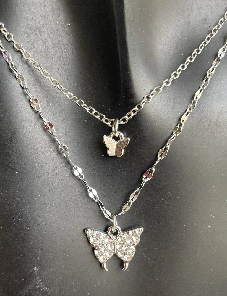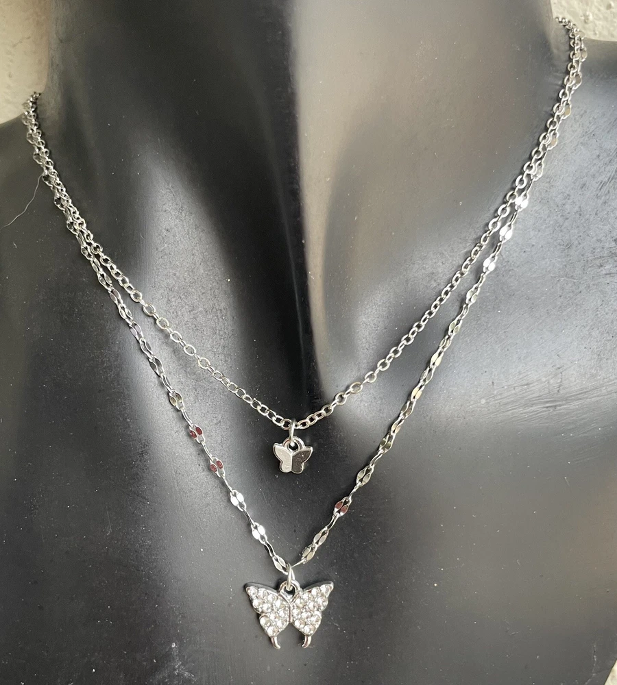 This necklace features a double chain design with a butterfly pendant adorned with rhinestones. It has a lobster closure and is made of silver-colored zinc alloy. The necklace is adjustable in length and is designed in a dangle/drop style, inspired by beauty, nature, and animals & insects. The main stone used is white/colorless rhinestone, adding a touch of elegance to the piece. 6-ne-butter2-1