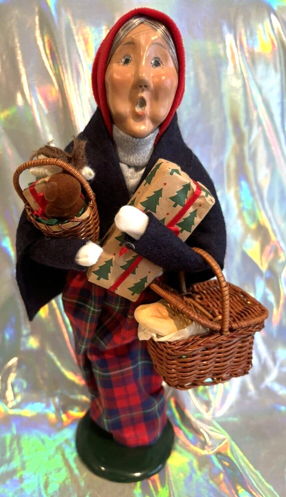 This beautiful Byers' Choice figurine lot features three Victorian ladies with gifts, including one with a muff. From the Carolers collection. The intricate details and original design make this a perfect addition to any Christmas decor or collection. The figurines are perfect for collectors or as a special holiday gift. Tallest is 13.5" high. Made in the U.S.A. Good previously owned condition. Woman with muff has some wear on bottom of stand, just slightly seen when on display - please see last 3 photos. Woman with package and baskets made in 1997, woman with bag - 2001.