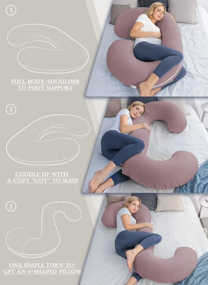 Cover Material: 95% Cotton + 5% Spandex Comfortable Pregnancy C Shaped. INSEN 58’’ Pregnancy C-shaped pillow comfort follows the contour and shape of your body and helps you relieve back pain, neck stiffness, and lower back pain. C-shaped is perfect for pregnant women with a full body surrounding support such as back, lower back, hip, leg, and feet support. This pregnancy C-shaped maternity support can relieve your pregnancy pain and pressure and improve sleeping and feeding. Premium fiber Filling. High-density soft fiber is not like other filling. We use long silk fiber that will stay smooth and stable inside the pillow providing comfort for side sleeping. Soft and full support pregnancy body pillow is based on a premium fiber filling. The breathable and hypoallergenic material cover is easy to clean and machine washable. Maternity Multifunctional Pillow. The flexible shape is adjustable when reading, watching TV/Movies, or playing games. You can fold it into a wedge pillow that helps you relax and elevate your leg to improve blood circulation. Relieving pregnancy swelling is so important for pregnant women. Full Body Support Pillow for Your Family. This C-shaped pillow is not just for pregnant moms or women. It can be widely used. Men or children who have experienced a day's work or cannot sleep stably. They need full relaxation and body support. Surrounding support is great for their sleeping to relax their work or study pressure Warmly Tips: Both outer and lining case have independent zippers to unpick and wash. Product Description C-Shaped Massage Pillow with Full Body Support. Fits your body curved shaped The C-shaped pillow provides more tight support as increasing a body shape design. Total body support replaces the need for multiple pillows and supports your head, neck, spine, belly, back, hips, and legs. Multi-purpose use Position this pillow in a number of configurations on your bed, couch, sofa, or even the floor! Your family would like to stay on the full-size pillow and feel very comfortable. Also, you can fold it into a wedge pillow for back support and elevation. Belly and hip support Keeps the perfect balance between comfort and support for your belly and hips. Surrounding support is great for back and side sleeping. Full body support You can also use this pillow to sit upright in bed to read, watch TV, or work on your laptop. Keep you asleep and sleep longer You can hug the C-shaped pillow to keep you asleep. Embracing the pillow to sleep makes you feel more secure and you can sleep longer than before. C-shaped pillow You can only use the C-shaped pillow to support your head, neck, and back. It gives you whole back support and allows you to sleep on your own side.