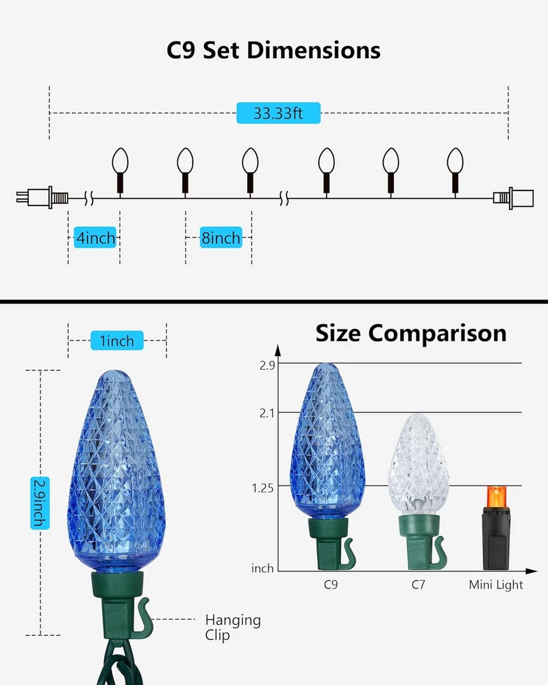 Store New Arrivals Add to Favorite View Feedback Contact C9 LED Christmas String Lights, 33.33Ft 50 LED Outdoor Indoor Decorative Light Strand, Xmas Holiday Lights for House, Christmas Tree, Patio, Party Decoration, Turquoise & Ice Blue, UL Listed Description Item model number I1-50-2-C9 Light Source Type LED Style C9-1 Pack, Turquoise & Ice Blue Power Source Corded Electric Number of Light Sources 50 Control Method Remote Light Direction Adjustable Theme Christmas Batteries Included? No Maximum Compatible Wattage 216 Watts Controller Type Remote Control Batteries Required? No Bulb Shape Size C9 Average Life 50000 Hours Seasons Christmas Package Dimensions 14.53 x 6.89 x 4.09 inches Included Components C9 LED Christmas String Lights, 2 Extra Replacement Fuses Indoor/Outdoor Usage Outdoor Light Color Turquoise & Ice Blue Water Resistance Level Waterproof Item Weight 2.35 pounds Specific Uses Outdoor, Indoor Occasion Christmas Decoration Special Features IP44 Waterproof, End to End Connectable, Super Brightness & Energy Saving Special Feature IP44 Waterproof, End to End Connectable, Super Brightness & Energy Saving Part Number I1-50-2-C9 Color Turquoise & Ice Blue Wattage 4.8 watts Shape Strawberry Voltage 120 Volts Size 1 Pack 【C9 Turquoise & Blue LED Lights】25 count C9 turquoise LED bulbs and 25 count blue bulbs. Illuminate your Christmas display with the vibrant and enchanting glow, creating a unique and eye-catching color combination. 33.3 feet total length, 8” evenly-spaced bulb apart on green wire, 4” lead in length; 【Super Brightness & Energy Saving】Brighter than traditional incandescent string lights, steady on lighting, beautifully bright, emits vivid & brilliant light through the bulb’s core. The LED bulb stays cool when touched, reduces power consumption, and saves money. 【Durable and Waterproof】With quality LEDs and weatherproof construction(IP44 waterproof), Don’t worry about using it in heavy rain and snow. (The plug is not waterproof and you need to do some protection or keep them away from water). The strong LED string lights provide years of high-quality long-lasting lighting, not easy to break apart. 【End to End Connectable】Simply, plug in and go! you can connect up to 45 sets together, and connect easily to your previous lights, end-to-end up to a maximum 216Watts(1.8Amps) total. It can meet your desired length and make your decoration more convenient. Each set comes with 2 extra fuses. 【Wide Application】UL listed. These lights are suitable for indoor and outdoor displays, a timeless classic on your house, and ideal decoration lights for room, roofline, garden, balcony, Christmas tree, party, and holiday decorations. Light up your holiday to enjoy Christmas! 【Customer Satisfaction】We offer 12 MONTH for all products and kind service, providing a 100% satisfaction experience is our main priority to our customers. Feel free to message us through “contact sellers” if products don't meet your expectations. Product Description Make Your Life Bright and Colorful with C9 Led Christmas String Lights 50-Count LED Christmas String lights with green wire use high-brightness LED bulbs, which can add light to your dark environment. The light creates a cheerful atmosphere when it's turned on and instantly brightens your mood. FEATURES: Vivid & Brilliant: C9 faceted bulbs look amazing and stand out in your home, bright enough to light up the outside of your house, creating color combinations and unique color patterns to give your light display a unique look. IP44 Waterproof: Durable for indoor and outdoor use, like home, patio, garden, and balcony, typically you can use these on your house roofline, on your Christmas tree, or wherever decoration lighting is needed, and any decorative project. 50000 Hours Longevity: The LED string lights provide years of high-quality long-lasting lighting, better construction and quality, not easy to break apart, NON-REMOVABLE bulb construction seals out moisture, eliminating corrosion for longer bulb life. Energy Efficient: These light sets use so little power (only 4.8 watts per set), energy-saving LED bulbs, budget-friendly, so you won’t spend as much money on your electrical bill. Allow you to decorate your lighting area with the desired length, making your decoration more convenient. Connected easily to your previous lights! Diamond Faceted 25-count C9 turquoise LED bulbs and 25-count blue bulbs. Beautifully bright, emits vivid & brilliant light through the bulb’s core. Package includes: 1 x 50 led string lights 2 x fuses per set 1 x user’s manual C9 LED String Lights, Multi-colored A set includes 50 LEDs These light sets feature non-removable bulbs, which means you don't have to screw in any light bulbs. Simply, plug them in and they are ready to go! Bulbs CANNOT BE REMOVED or REPLACED. Comes ready to install right out of the box. Also, they will still be cool-touch after lighting for a long time. Specification: Total Length: 33.3ft/set Lead Wire Length: 4inch Bulbs Spacing Length: 8inch Mode: Steady On Expandable: 45 Sets Application: Indoor/Outdoor Light up the upcoming Christmas! IP44 Waterproof Perfect for indoor & outdoor decoration. Lights can be utilized both indoor and outdoor without worry of rainy weather. High Brightness Brilliant, natural-looking glow that fills the bulb with vibrant color. Wide Range of Applications Widely apply for Christmas trees, Christmas, Party, Wedding, Home, Window, Bathroom, Festival, Holiday, Shows, etc. ABOUT US We offer the best prices around on high quality products. Our E-store includes media such as books, movies, music and games while offering electronics, toys, sporting apparel, clothing, tools, general home, garden items and more. SHIPPING We are always working hard to ensure your package arrives as soon as possible. Please understand that some factors like weather, high postal traffic, and the performance of shipping companies are outside of our control. We of