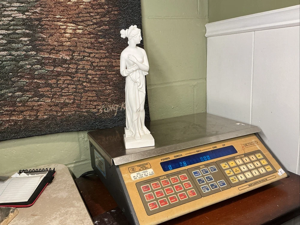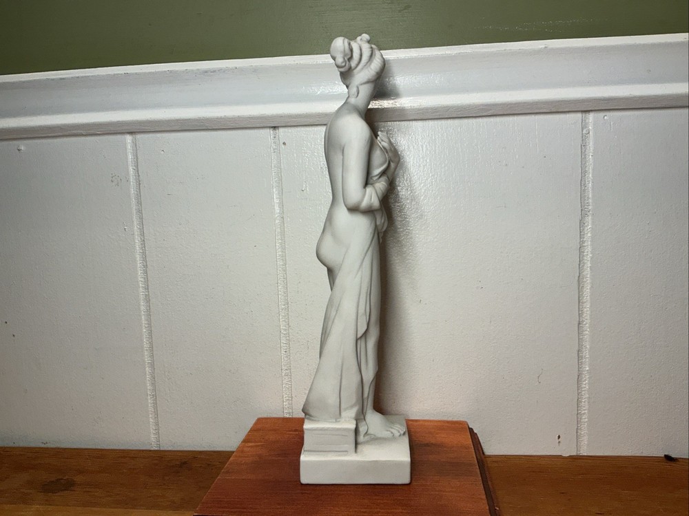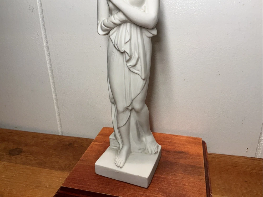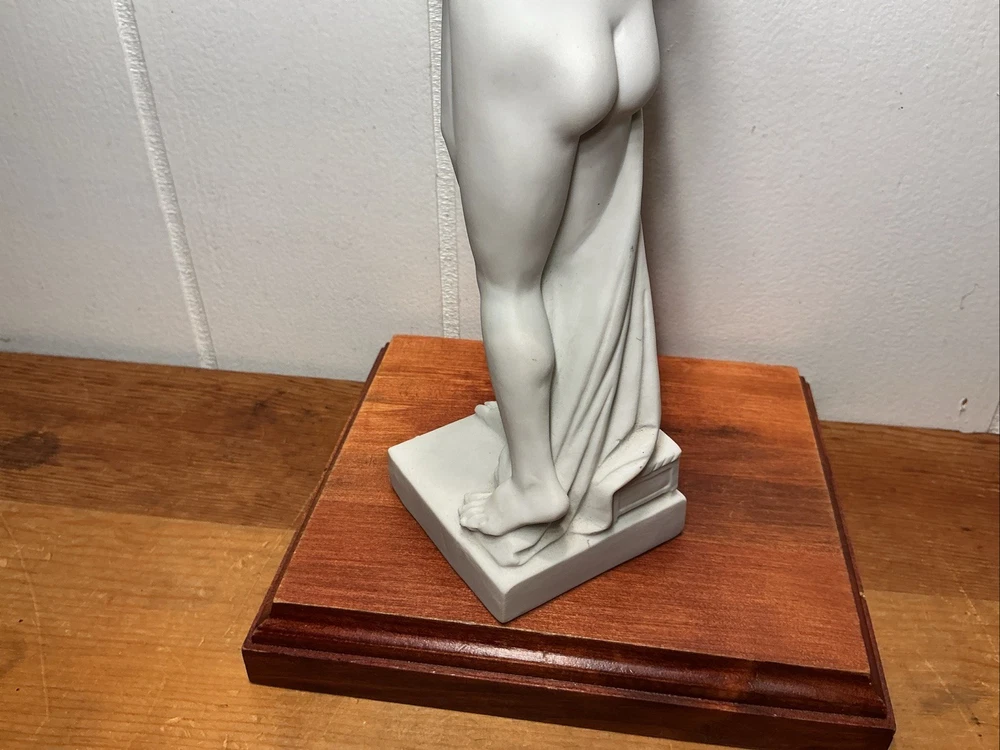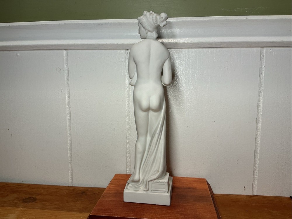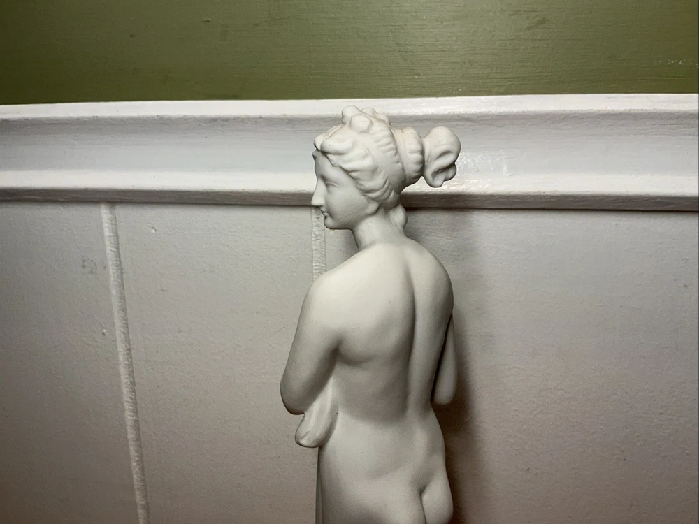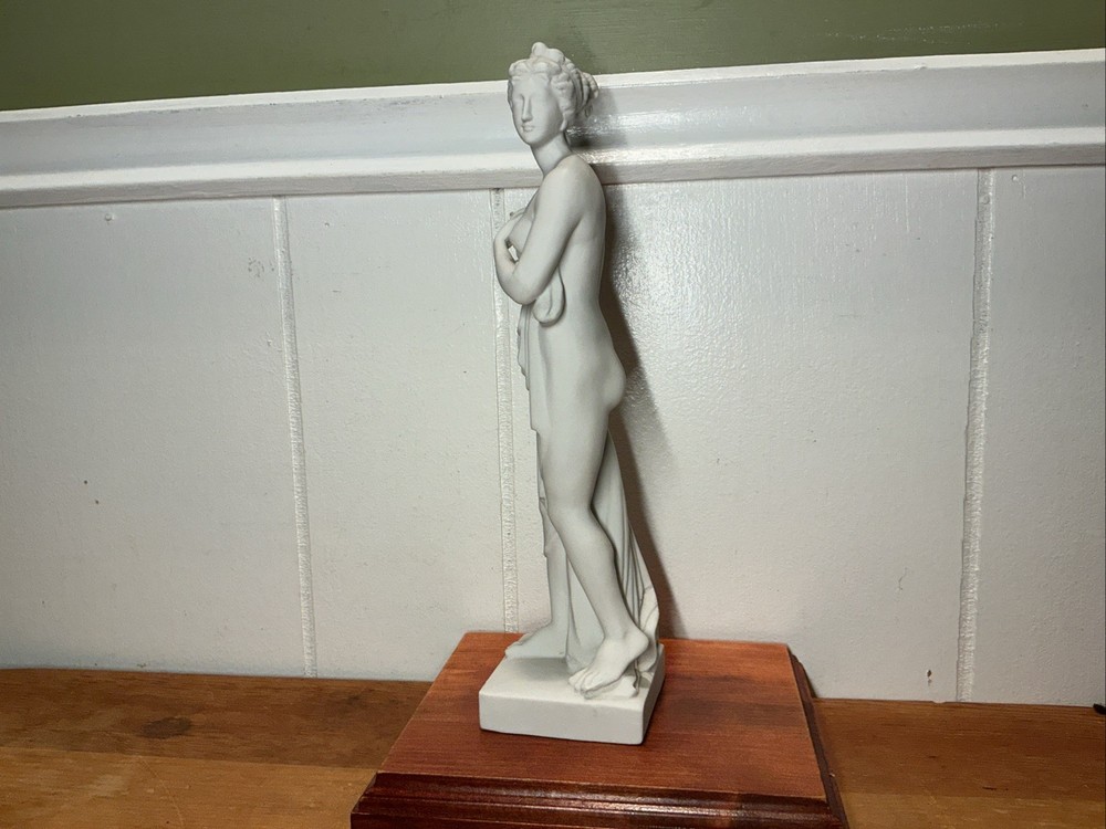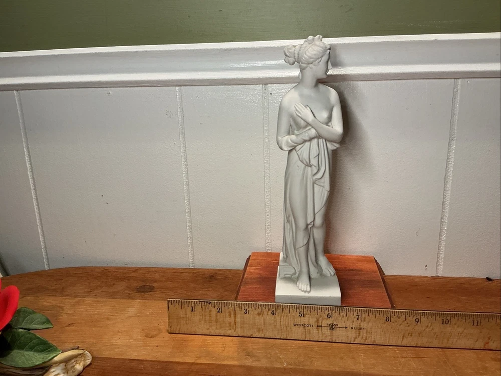 The Canova Classical Sculpture Venus Italica is a small Museum reproduction sculpture measuring 9.8 inches in height. Made of plaster, it features a figurative art style with elements of Realism and Classical themes. This statue is a replica of the original work by artist Canova, depicting the subject of Venus Italica with a focus on Egyptian, Religious, Mythology, Roman, History, and Greek influences. Produced using pottery techniques in Japan, this sculpture captures the essence of timeless artistry and craftsmanship.