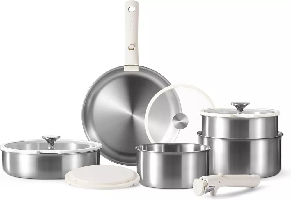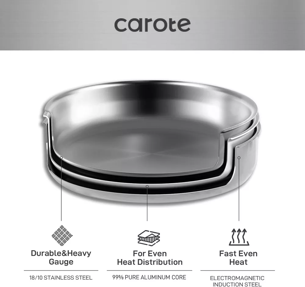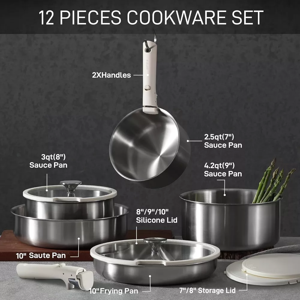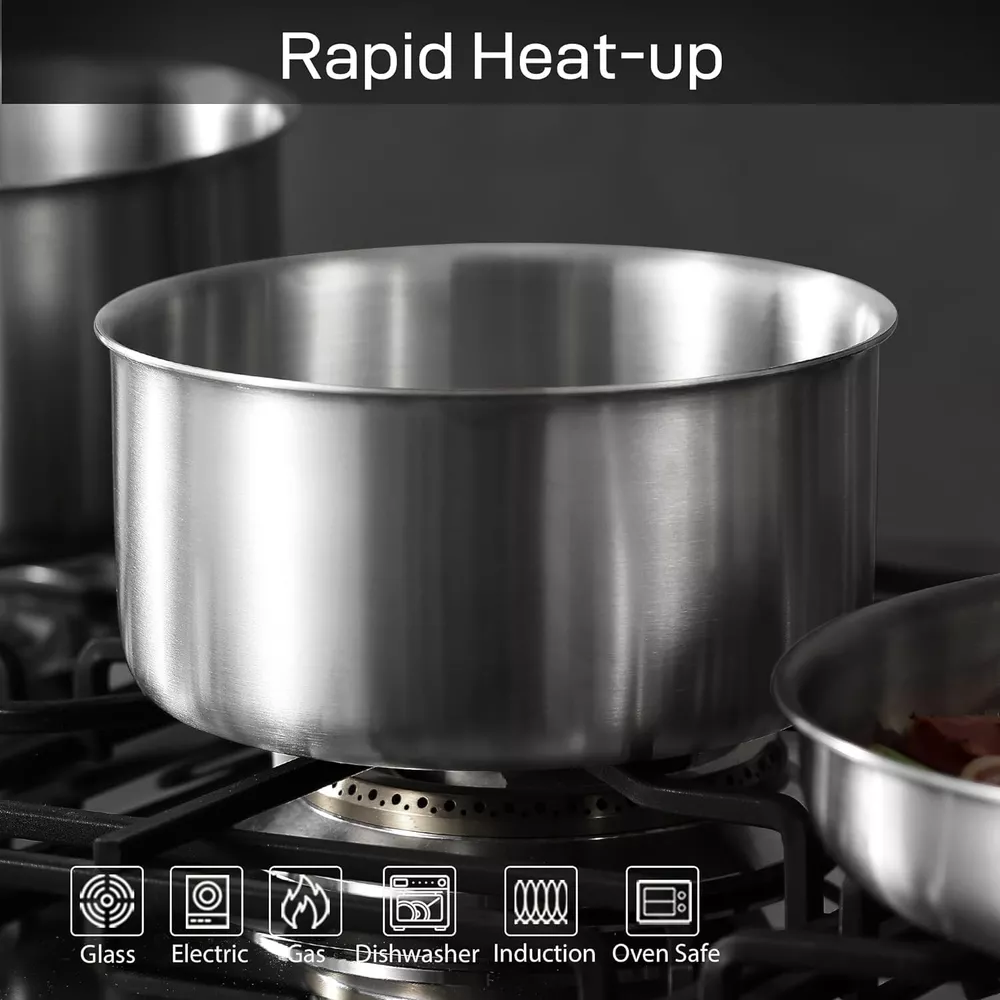 Exclusive Triple-bonded Stainless Steel: Long-lasting stainless steel base for enhanced durability and optimized for induction efficiency. Kitchen Storage Hack: Ideal for stacking and nesting, optimal storage solution. Quick Heating: A wider 3-ply stainless steel base design delivers efficient heat conductivity, and faster & more consistent heating. Chef Use & Chef Abused: High Heat Tolerant 600°F, harder stainless steel material making it resistant to scratching, staining. Long Lasting: Longer lifespan of the cookware set, designed with a wider base for efficient heating and stirring, and sealed, flared rims for precision pouring. Optimizing for Dishwasher: Dishwasher friendly to save your cleaning time. Versatile Stoves Use: From all kinds of stovetops to Oven, to Table, to Dishwasher, this multi-functional pots and pans is the perfect set. Set Includes: 10'' skillet, 10' saute pan, 9''/8''/7'' sauce pan, 10''/9''/8'' silicone lid, 8''/7'' storage lid, 2*handles.