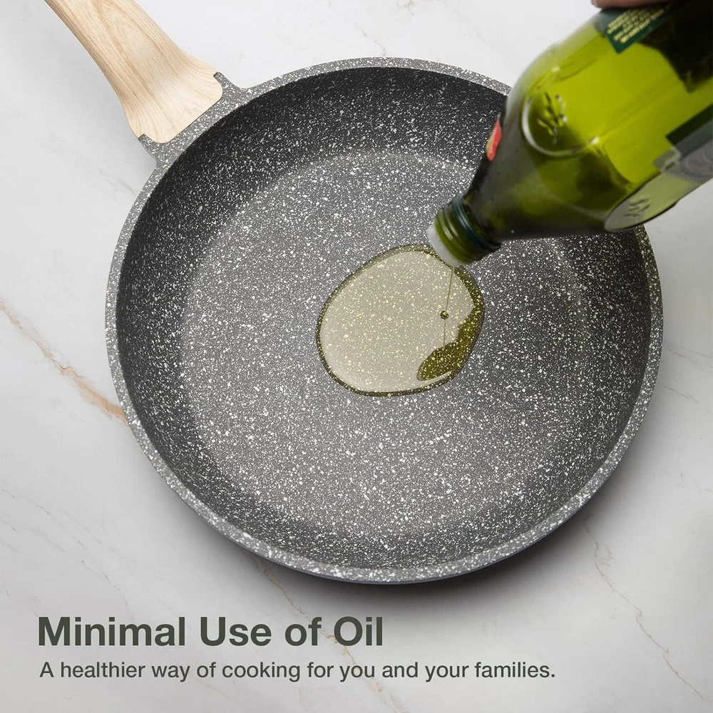 CAROTE Non Stick Frying Pan Skillet, 8" 8" frying pan w/lid, Black Product Details Brand: CAROTE Material: Non Stick Granite Special Feature: Non Stick, Easy to clean Color: Black Capacity: 1.1 Liters Compatible Devices: Smooth Surface Induction, Gas Product Care Instructions: Avoid Dry Heating Maximum Temperature: 180 Degrees Celsius Handle Material: Stainless Steel Item Weight: 1 Kilograms Is Oven Safe: No Model Name: Omelette Pan Has Nonstick Coating: Yes Is Dishwasher Safe: Yes Recommended Uses For Product: Frying Shape: round Product Dimensions: 6.69 x 7.87 x 1.77 inches Item Weight: 2.2 pounds Manufacturer: CAROTE Item model number: C00016-UAE Eco-friendly Granite Nonstick Material: Nonstick granite material. Less oil needed & less smoke released, our frying pan provides your daily cooking always safer and healthier. Excellent non stick performance keeps food sliding smoothly along the surface for easy clean. Heat Up Quickly and Evenly: The induction frying pan adopts large magnetized base and provides a larger heating area, which allow to distribute heat quickly and evenly resulting in no hot spots. Suitable for gas, electric, ceramic, glass, halogen and induction hobs. With extended bottom design, our cookware heats up faster compared with the traditional skillet pan. An Frequently-used Cooking Pan: Our nonstick frying pan can be used for any cooking needs : egg pan/ omelet pan/ grill pan ... a perfect fry pan is the best cooking partner for you, with heavy gauge and extra long-lasting die-cast construction, makes the skillet pan break resistant, anti-warping and chip-resistant. Heat-resistant Handle: All-in-one design, no rivets and installation-free, avoids rust and easy to clean. Bakelite handle is comfortable to grip and stay cool while cooking and prevent handle burning and discoloring. The sturdy handle aids in lifting, and provides a hole for hanging when not in use.