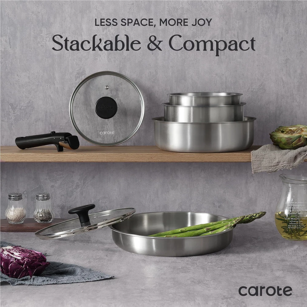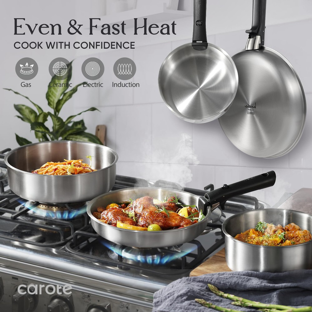๐๐ฑ๐๐ฅ๐ฎ๐ฌ๐ข๐ฏ๐ ๐๐ซ๐ข๐ฉ๐ฅ๐-๐๐จ๐ง๐๐๐ ๐๐ญ๐๐ข๐ง๐ฅ๐๐ฌ๐ฌ ๐ฌ๐ญ๐๐๐ฅ: Long-lasting stainless steel base for enhanced durability and optimized for induction efficiency. ๐๐ข๐ญ๐๐ก๐๐ง ๐๐ญ๐จ๐ซ๐๐ ๐ ๐๐๐๐ค: Ideal for stacking and nesting, optimal storage solution. ๐๐ฎ๐ข๐๐ค ๐๐๐๐ญ๐ข๐ง๐ : A wider 3-ply stainless steel base design delivers efficient heat conductivity, and faster & more consistent heating. ๐๐ก๐๐ ๐๐ฌ๐๐ & ๐๐ก๐๐ ๐๐๐ฎ๐ฌ๐๐: High Heat Tolerant 600ยฐF, harder stainless steel material making it resistant to scratching, staining. ๐๐จ๐ง๐ ๐๐ซ ๐๐๐ฌ๐ญ๐ข๐ง๐ : Longer lifespan of the cookware set, designed with a wider base for efficient heating and stirring, and sealed, flared rims for precision pouring.