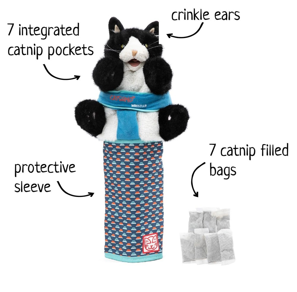 The Official Wrestler – The World’s First Cat Wrestling Puppet! Unleash your cat’s wild side with the Wrestler—an interactive puppet designed for safe, instinct-driven play. Created by a cat-loving engineer, this -of-a-kind toy lets you engage with your feline in a fun, natural way while protecting your hands and arms. Made with a double layer of durable oxford nylon and canvas, the inner sleeve shields your forearm and wrist from scratches and bites. On the outside, soft plush fur offers a cozy, familiar texture your cat will love to wrestle. The thick, PP cotton-filled backside cushions your hand and enhances comfort during play. The Wrestler’s intuitive finger-forward design mimics real prey movements, encouraging your cat to pounce, grapple, and kick—satisfying their hunting instincts while keeping your hands safe. By creating a clear distinction between toy and bare hand, it also helps reduce aggressive behavior outside of play. Make playtime smarter, safer, and more fun—for both of you. INTERACTIVE CAT PUPPET WRESTLER – Thoughtfully invented and designed by a cat-loving engineer to ensure quality, durability, and fun. Engage your cat with the original wrestler puppet; designed as a hand glove puppet for cat wrestling and kicking that makes playtime safe and exciting. SUPPORTS CAT AND EXERCISE – Encourages natural wrestling, pouncing, and kicking behaviors that help your cat stay active, burn energy, and maintain a healthy weight—all while reducing boredom and . To not be confused with a karate kitty. The cat sumo wrestler doubles as a cat wrestling puppet, allowing for dynamic play styles like stalking, pouncing, tugging, bunny kicking, biting, and more. This variety keeps cats curious, encourages exploration, and strengthens the bond between you and your pet. SAFE AND ENGAGING DESIGN CONSIDERATIONS: This cat wrestling toy puppet is reinforced with protective material and sleeve, helping to prevent the owner's hands from scratches when interacting, ensuring safe interaction; at the same time, the hand glove puppet is suitable for a variety of hand sizes and comfortable to wear, making it convenient for the owner to operate it easily. Crinkle material in the ears, integrated catnip bags, and four moveable legs and mouth make this glove puppet fun to manipulate while keeping cats guessing. HIGH-QUALITY & DURABLE MATERIALS: Soft plush exterior for cats, breathable material internally, midlayer of high density weave nylon, and a thick PP cotton filled body that cushions the hand. This cat wrestling glove is crafted from soft yet durable plush fabric that’s comfortable to the touch while tough enough to handle scratching, biting, and daily play. Its abrasion-resistant design ensures long-lasting use, giving your cat endless fun without the toy wearing out quickly. PERFECT FOR VERSATILE MULTI-CAT PLAY: Be it boxing, karate, wrestling, or even snuggling - this cat toy glove is adaptable and unpredictable and will stimulate your cat making it optimal for playing, bonding, training, and reducing boredom and territorial .