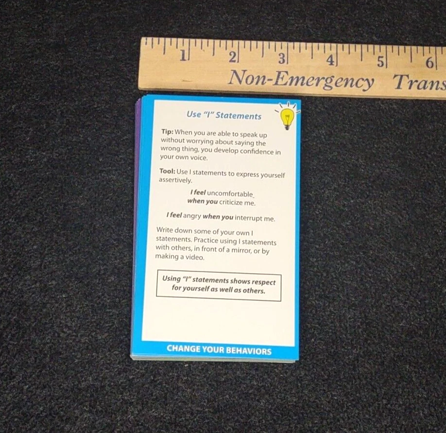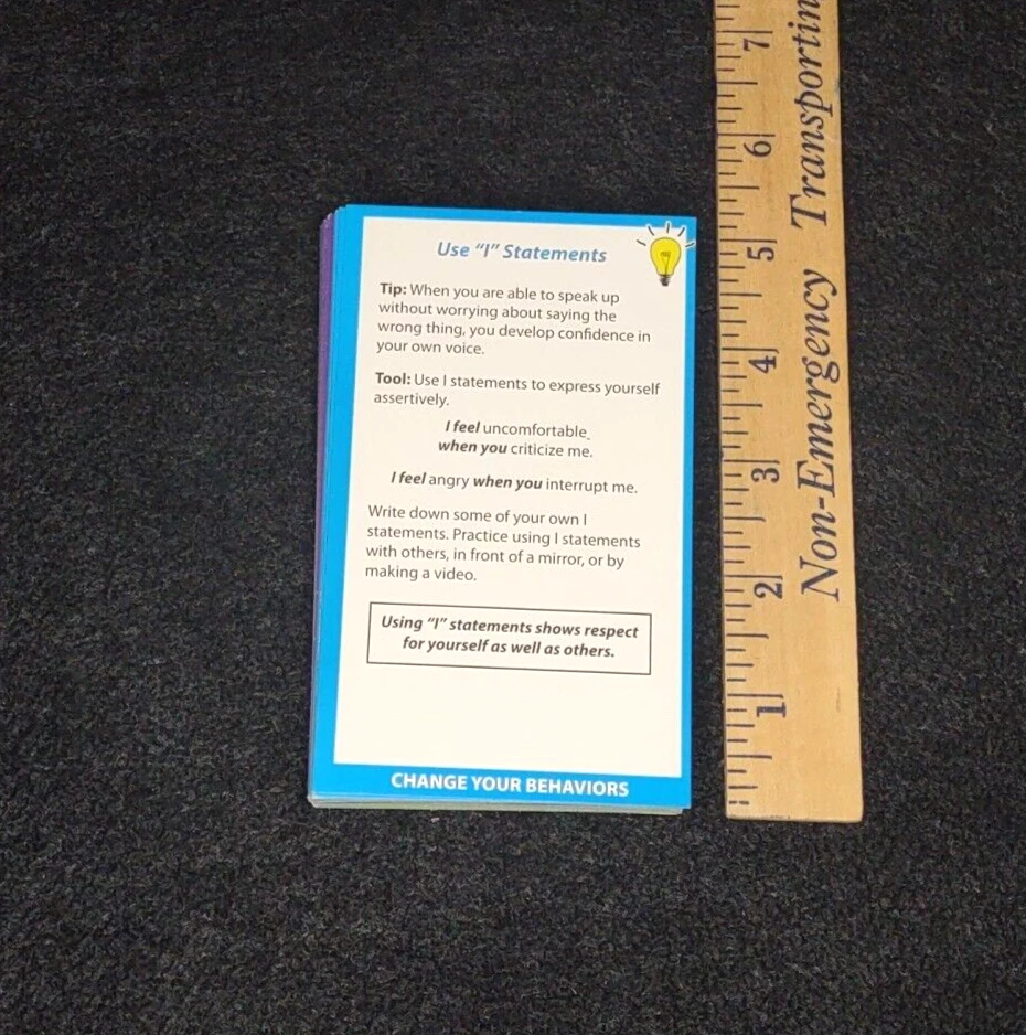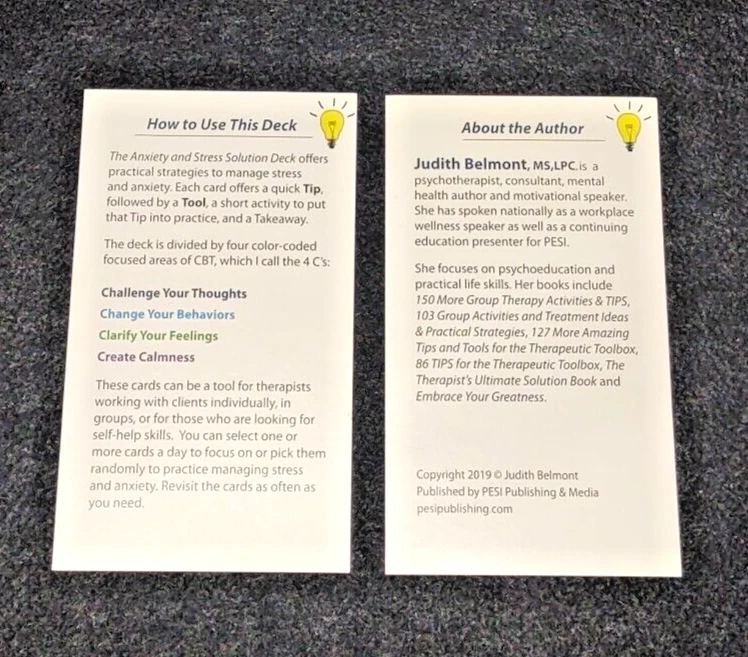 Relieve stress and calm anxiety with 55 quick and effective tips and tools. Each card features a short Tip, followed by a Tool, or short activity to put that Tip into practice. -Clarify Your Feelings -Challenge Your Thoughts -Change Your Behaviors -Calming Strategies