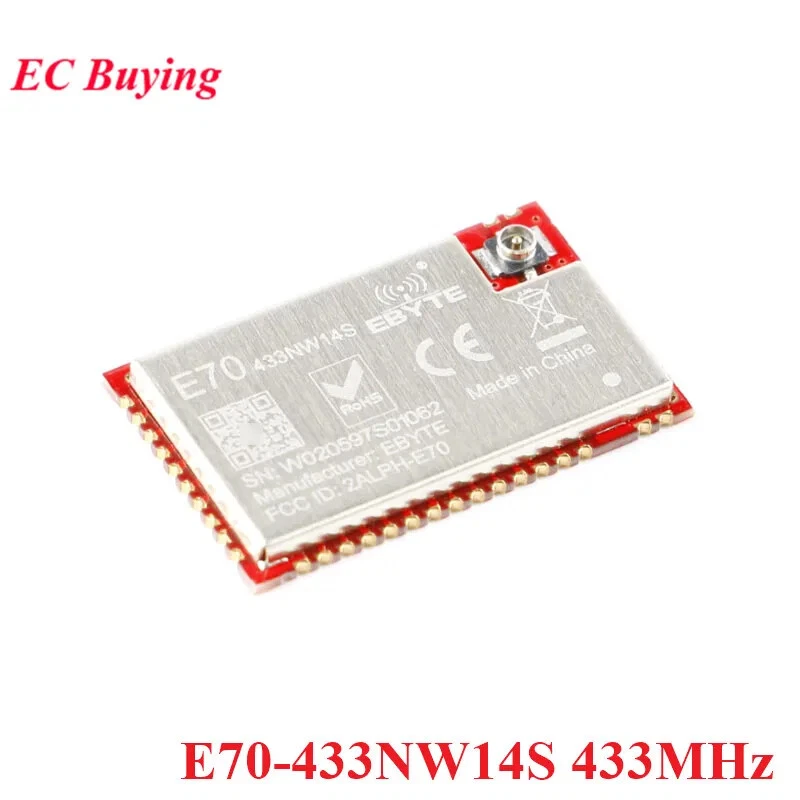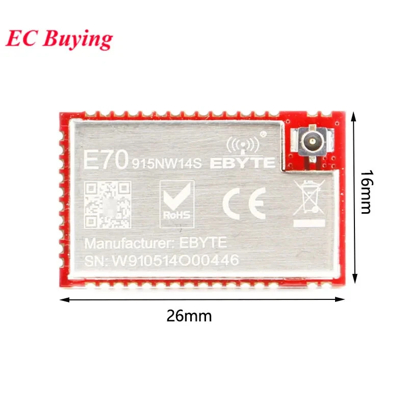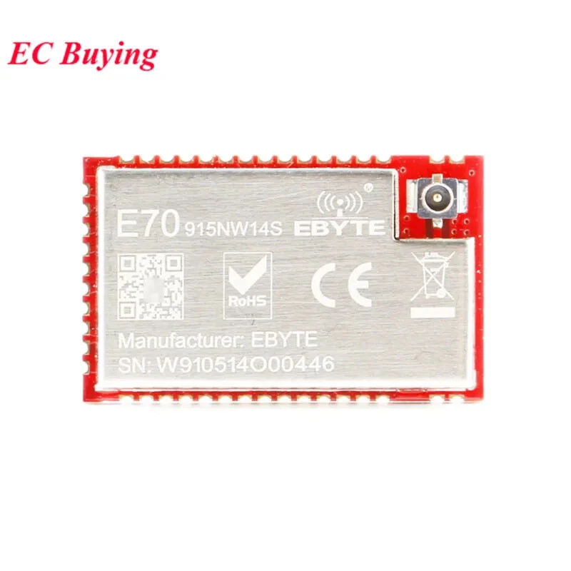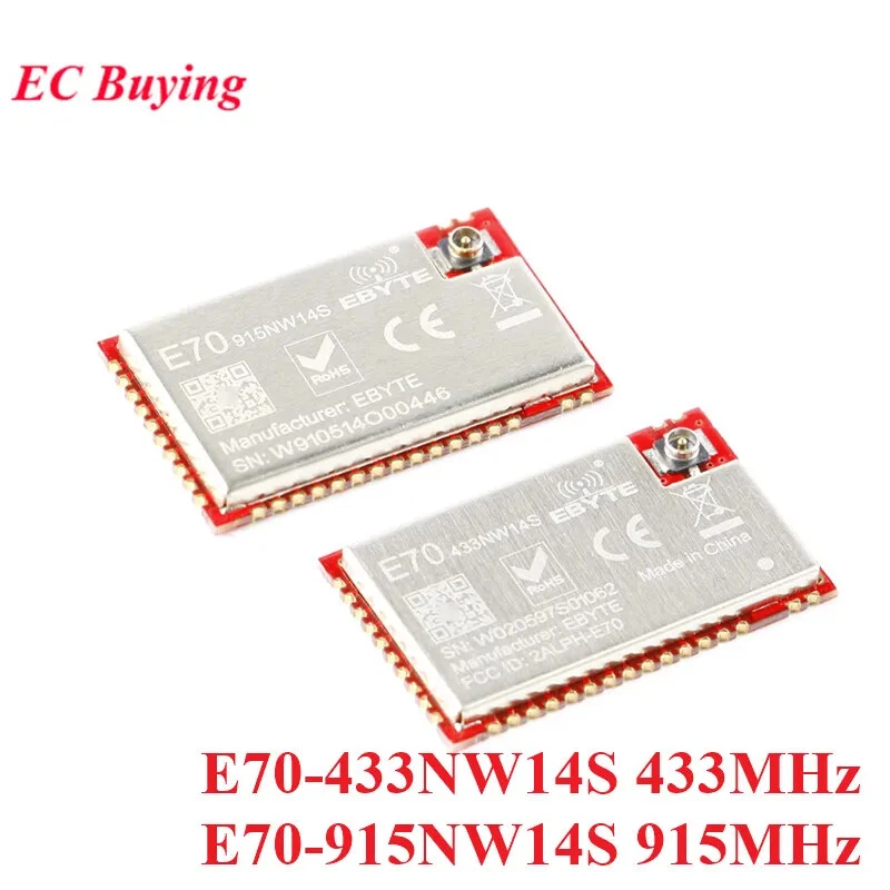 E70-433NW14S Working frequency 431~446.5 MHz Support ISM band Transmitting power 14 dBm - Receiving sensitivity -110 dBm Air data rate is 5kbps Air data rate 5k~50kbps Controlled via user’s programming Test distance 2500m Test condition:clear and open area, antenna gain: 5dBi, antenna height: 2.5m,air data rate: 5kbps Size 16 * 26 mm - Antenna type IPEX / Stamp hole 50 ohm impedance Communication interface UART - Buffer 512 byte A single packet may not exceed 128 bytes E70-915NW14S Working frequency 915 MHz Transmitting power 14 dBm Receiving sensitivity -110 dBm Reference distance(PCB/IPX) 2500m Transmit current - 27 - mA - Receiving current 7 8 10 mA - Sleep current 0.5 1 2 µA - Supply voltage 2.2 3.3 3.8 V DC - Communication level 2.5 3.3 3.6 V DC - Transmit power 13 14 15 dBm - Receiving sensitivity -109 -110 -111 dBm - Coverage 1200 1500 1800 m