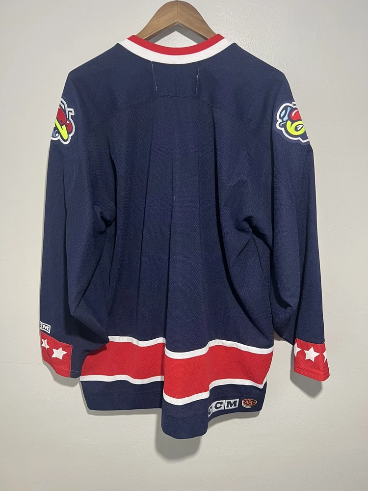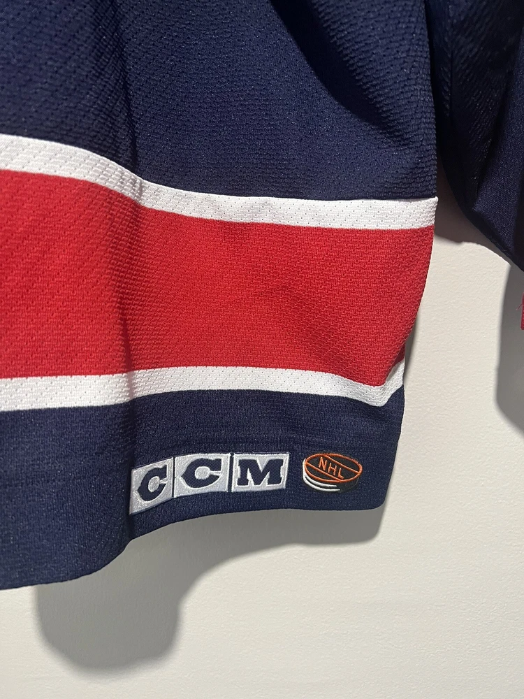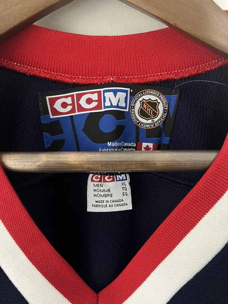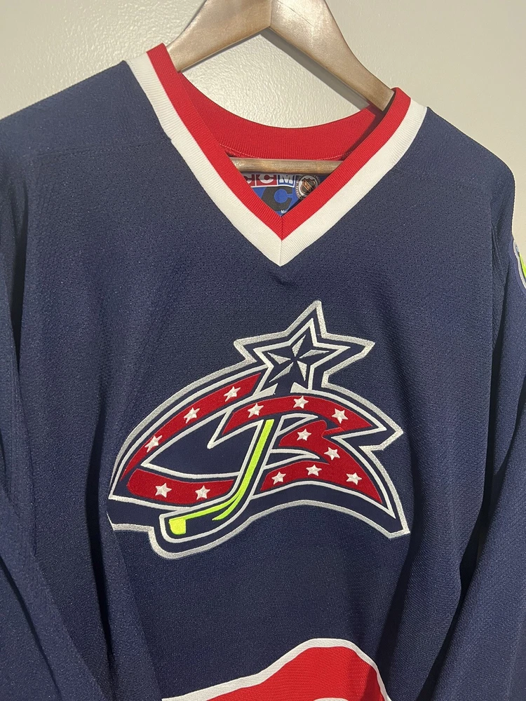 Show your support for the Columbus Blue Jackets with this vintage men's NHL hockey jersey by CCM. Made with high-quality materials, this jersey is perfect for any fan of the National Hockey League. The jersey features the team's iconic logo and comes in a size XL. Whether you're watching the game at home or cheering on the team at the arena, this jersey is sure to make a statement. It's officially licensed and perfect for regular season games. The 18 oz capacity ensures a comfortable fit, and the blue color is sure to turn heads. Don't miss out on the chance to own a piece of NHL history with this vintage hockey jersey.