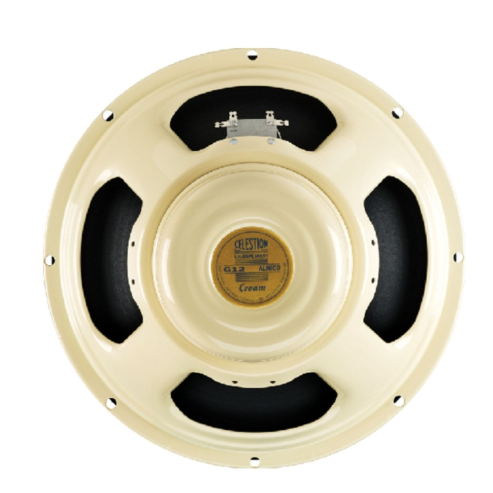 CELESTION Cream Alnico Guitar Speaker Specifications : Nominal diameter : 305mm / 12in || Nominal power rating : 90W || Rated impedance : 8Ω || Sensitivity : 100dB || Frequency range : 75-5000Hz || Resonance frequency, Fs : 75Hz || DC resistance, Re : 6.7Ω & 13.1Ω || Voice coil diameter : 1.75in / 44mm || Chassis type : Pressed steel || Magnet type : Alnico || Voice coil material : Round copper Mounting Information : Unit weight : 4.2kg / 9.3lb || Magnet structure diameter : 128mm / 5.0in || Mounting hole dimensions (mm) : 7.9mm || Mounting hole dimensions (in) : 0.31in || Mounting hole PCD (mm) : 297mm || Mounting hole PCD (in) : 11.7in || Number of mounting holes : 8 || Overall depth : 165mm / 6.5in || Cut-out diameter (mm) : 283mm || Cut-out diameter (in) : 11.1in With a 90-watt power rating the Celestion Cream is purpose-built for vintage tones whatever kind of amp you use. By applying new technologies and manufacturing methods developed during the creation of our Creamback speakers we’ve been able to deliver a higher power rating while preserving the very essence of an alnico guitar speaker. Delivering a glorious laid-back attack the Cream exudes warm lows and a brilliant bell-like chime. It has smooth and organic mids further characterised by a fine-grained detail that adds a high-definition quality to the vocal range. The Cream has been specially created to bring alnico class to all kinds of amps from 1-watt to 90-watts. It conveys a satisfying warmth detailed expressiveness and exceptional musicality even at low power levels.