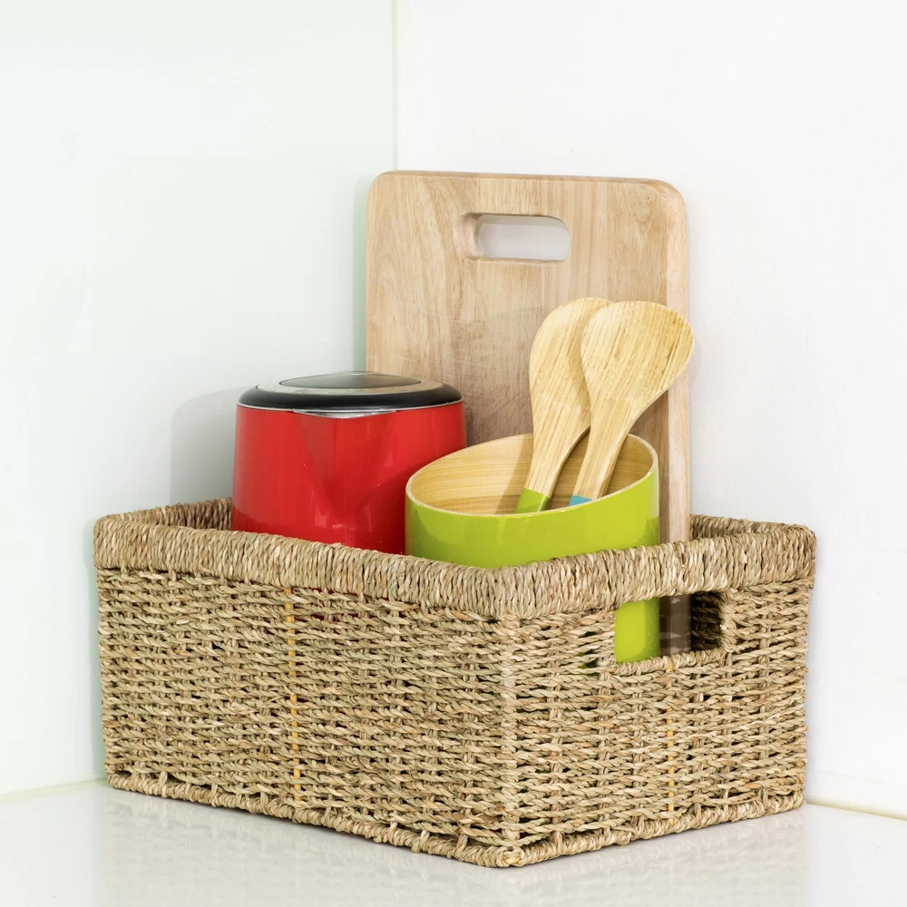 Large Basket 14 x 10 x 6.4 inches Woven by hand from natural seagrass over an iron frame in Vietnam Used as a storage basket for fruit, books, magazines, newspapers, games, pet toys, media, towels, clothes, toilet paper, or others Perfect for organization and storage with closets, shelves, racks, drawers, desks, pantries, bar counters, coffee tables, and more The basket is a great choice to decorate and organize your living space such as home, kitchen, office, restaurant, hotel, or garden Our open rectangle baskets are easy for organizing with insert handles. They can be used the same as containers, holders, trays, bins, or boxes anywhere in your home like in the living room, bedroom, bathroom, playroom, laundry room, and kitchen. Our weaving baskets are mainly handmade of all-natural and easily renewable materials like bamboo, rattan, wicker, straw, jute, seagrass, and water hyacinth with metal wire frames inside. We are proud to be the brand that has been supporting the local craftsmen and introducing their products to the world.