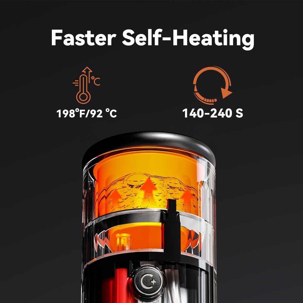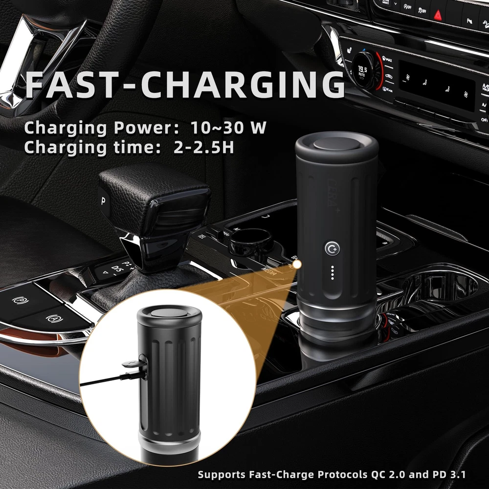8 HOT CUPS PER CHARGE (1.7oz/50 ml each) – With 77°F/25°C, a full charge heats and brews up to 8 espressos using this portable espresso maker from CERA+. Results vary with water temperature/volume; many portable coffee maker options yield only 3–4 cups per charge. 【8 HOT CUPS PER CHARGE (1.7oz/50 ml each)】 With 77°F/25°C, a full charge heats and brews up to 8 espressos using this portable espresso maker from CERA+. Results vary with water temperature/volume; many portable coffee maker options yield only 3–4 cups per charge. 【ULTRA-FAST USB-C RECHARGE】 13,500 mAh battery supports 10–30 W USB-C PD/QC input and fully recharges in ~2–2.5 hours from wall, car, or power bank—ideal for daily carry, road trips, travel (carry-on safe) as your travel espresso maker / portable electric coffee maker. 【TRUE SELF-HEATING IN ~140 s】 Heats 1.7 oz (50 ml) from 77°F to 198°F (25 to 92 °C) in about 140 seconds—no kettle needed. Using preheated water, you can brew 500+ shots on a full charge with this electric espresso maker. Great as a travel coffee maker, coffee maker for car, or battery coffee maker for camping. 【20-BAR EXTRACTION | 2-IN-1 BREWER – Crema-rich espresso using NS-compatible】 capsules or espresso-grade ground coffee—works as an espresso machine with pods / espresso pod machine or a small espresso maker. A true portable espresso machine for home or travel. 【COMPACT, DURABLE, TRAVEL-READY – Food-contact-safe materials】 travel carry-on safe; Weight only at 730 g, 2.76 × 2.76 × 9.06 in. Leak-resistant and heat-protected—perfect portable coffee machine / mini espresso machine for camping, hiking, fishing, skiing, RVs, office breaks, and portable espresso on the go. A small espresso machine that fits anywhere. 【ONE-BUTTON OPERATION & SUPPORT – Not App-Compatible / No Smartphone Pairing】 Simple one-button control: press 2 s to heat-and-brew, or double-click to brew with hot water. This model does NOT support App control, smartphone pairing, Bluetooth, or Wi-Fi connectivity. It is a standalone, non-App-compatible portable espresso maker designed for users who prefer a fully independent device with no phone required or supported. Includes a 12-month warranty and responsive customer support.