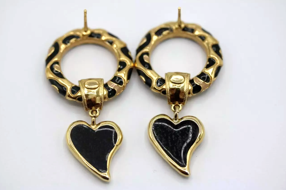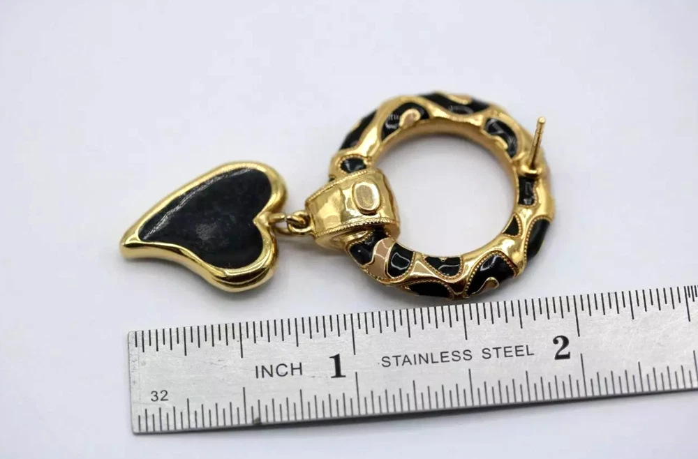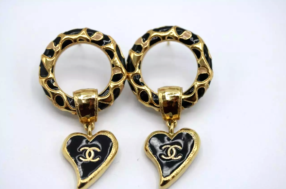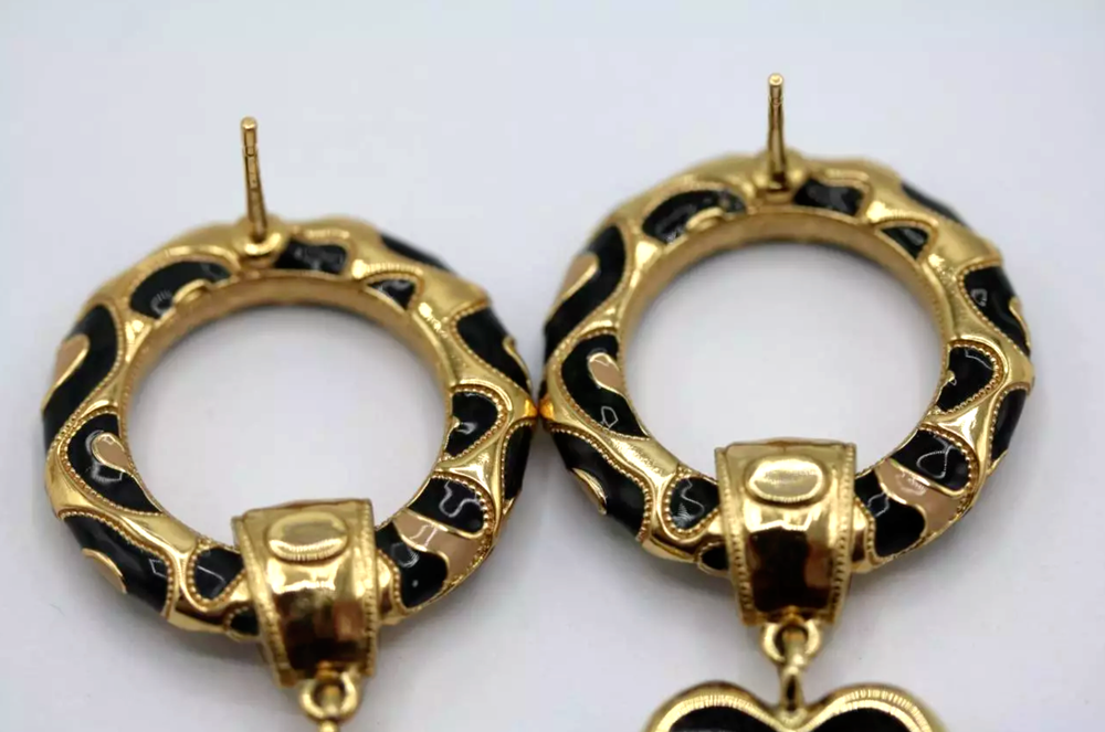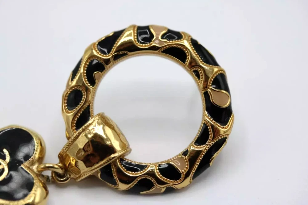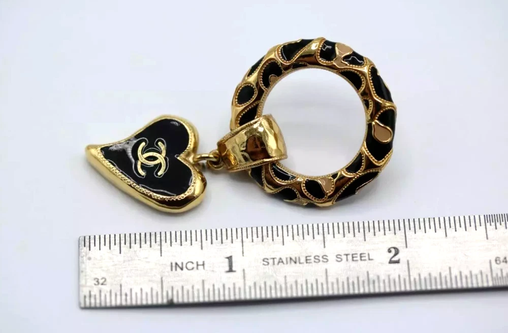 CHANEL 2022 Icon Goldtone Black/Beige Enamel Circle Dangling Heart Earrings Part of the Chanel 2022 spring summer collection. Features goldtone metal with black and beige enamel design. Earrings have a ring shape at the top with a dangling Heart on the bottom with CC logo. Black/Beige enamel Goldtone metal Ring has a 32mm diameter Earrings have a 2 inch drop Made in France Code: A22 P Should you have any further questions please feel free to e-mail. Thank you!