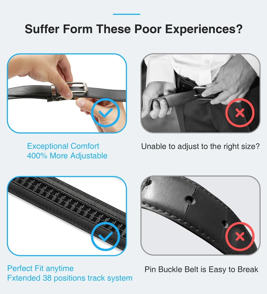 FOR EXACT FIT - Ratchet belt allows for up to 1/4" adjustments for perfect fit everywhere. The buckley belts for men features an easily removable buckle that allows you to cut the men's belt to your ideal size. EASY TO USE - Slide the mens dress belt into the sliding buckle, and the holeless belt auto-locks. Lift the automatic buckle, and pull the comfort click belt to release. Simple, smooth, and sleek! MAXIMUM DURABILITY - Mens belts for jeans with genuine leather, presenting a high texture refined look, High-density stylish buckle is lighter and SCRATCH RESISTANT which is made to last. EXQUISITE PACKAGING - Luxury packaging comes as standard! A Fashion Design track belt will meet almost any occasion and outfit.Choosing CHAOREN buckley belt,let your friends and family experience this comfort and stylish. NO RISK ORDERS - We are committed to making our customers satisfied. If there is any problem with the product, contact us without hesitation.