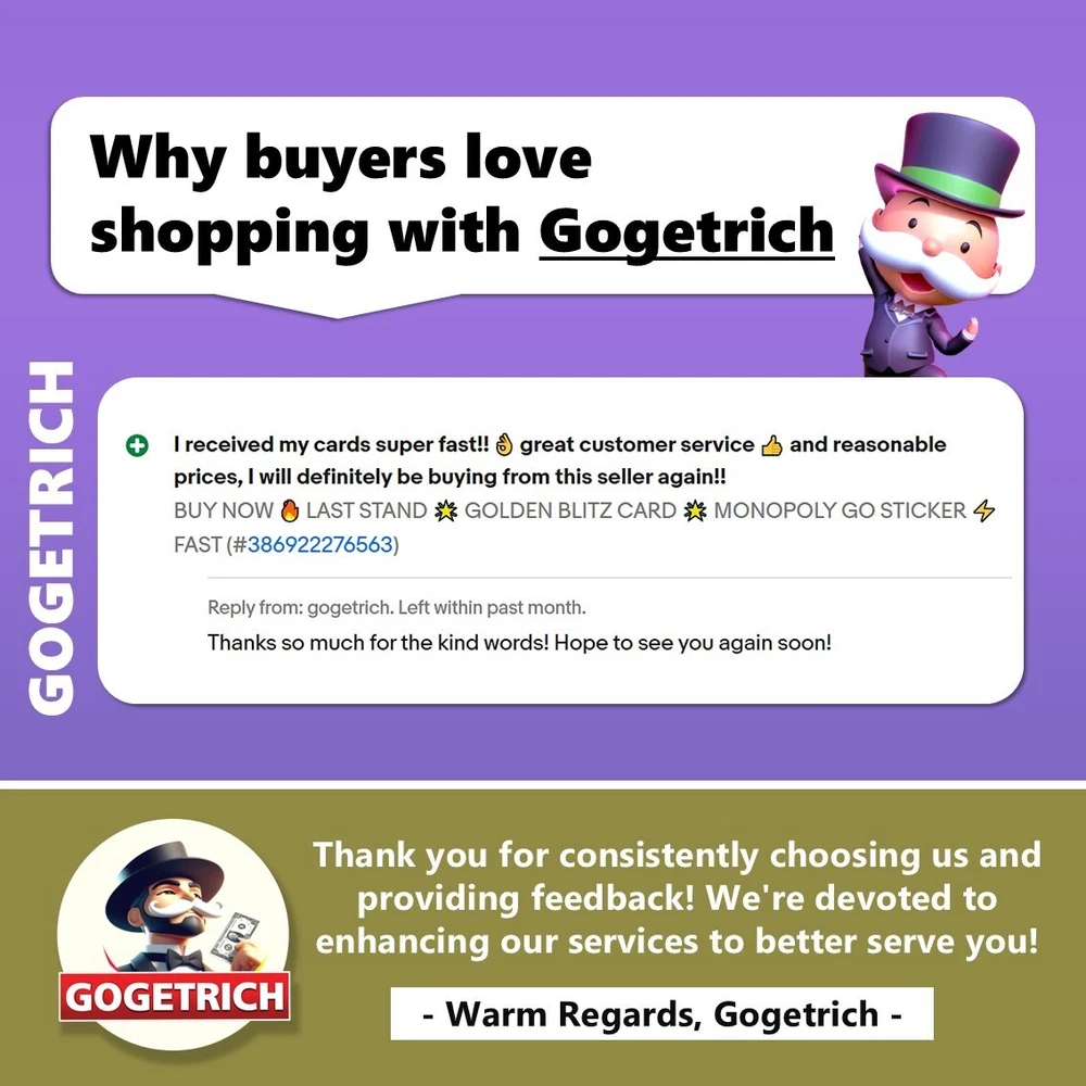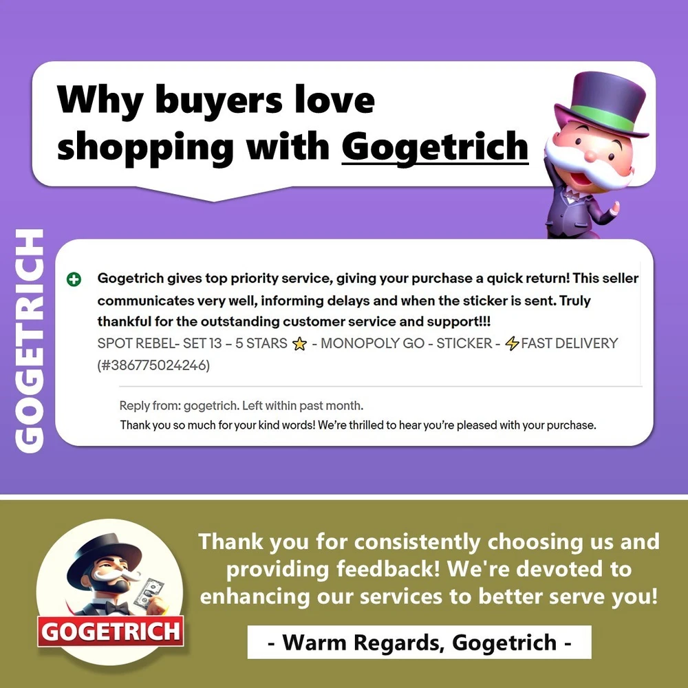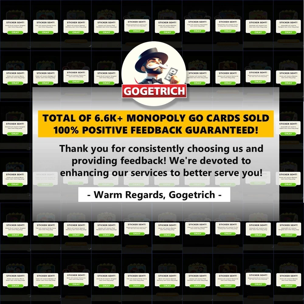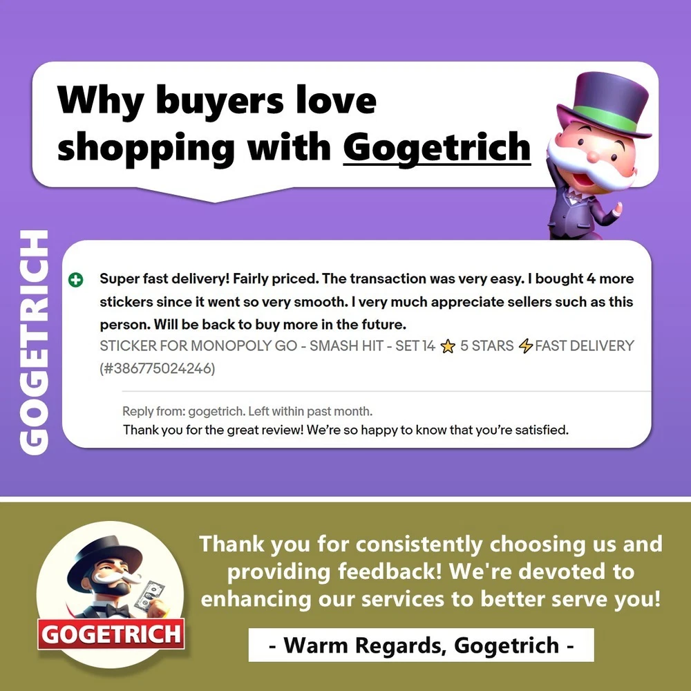 Welcome to gogetrich, here you will find all the stickers you need! You can choose your Sticker on Sticker List! Please read the description below: 🌟 Once the sticker has been paid for, please send me your Monopoly invite link and username. I will send the screenshot during the sticker sending process, and once the process is complete. 🌟 Stickers will usually be sent IMMEDIATELY unless I'm offline. Items will be sent within 5-10 minutes. 🌟 I'm from Indonesia, not the USA, so expect a 12-hour time difference. However, sending stickers typically takes less than 24 hours, so no worries. ✅ After receiving the stickers, please take a screenshot and confirm them via message as proof. ✅ Need other stickers? Message me, and I'll promptly update you on the availability of Monopoly Go stickers. Note: This is just digital currency in the mobile game Monopoly GO! All items in this listing are the sole digital property of Hasbro. I do not own anything, and you are just paying me for my time to give you an online gaming virtual item. Thank you and Happy shopping! --------------------------------------------------- Monopoly go Monopoly go sticker Monopoly go card Jingle Joy Monopoly Go Monopoly Go Jingle Joy Monopoly go Set 1- Frosty Freight (⭐️) Monopoly go Set 1 - Onward Tracks (⭐️) Monopoly go Set 1 - Sound the Horn (⭐️) Monopoly go Set 1 - The Village (⭐️) Monopoly go Set 1 - Santa's Bag (⭐️) Monopoly go Set 1 - Festive Crossing (⭐️) Monopoly go Set 1 - Swipe!(⭐️) Monopoly go Set 1 - Fond Farewell (⭐️) Monopoly go Set 1 - Toy Trains (⭐️) Set 2 - Final Touch (⭐️) Set 2 - Troublemaker (⭐️) Set 2 - Tycoon Tears (⭐️) Set 2 - Ruff Day (⭐️) Set 2 - Clever Dog (⭐️) Set 2 - Paw-tastic (⭐️) Set 2 - Surprise (⭐️) Set 2 - What Is It?! (⭐️⭐️) Set 2 - Fur-ever! (⭐️⭐️) Set 3 - Furry Couture (⭐️) Set 3 - Whirlwind (⭐️) Set 3 - Faux Paw (⭐️) Set 3 - Santa Paws (⭐️) Set 3 - Dogues (⭐️) Set 3 - Short Measure (⭐️) Set 3 - Pup Strut (⭐️⭐️) Set 3 - Little Helper (⭐️⭐️) Set 3 - Last Bow (⭐️⭐️⭐️) Set 4 - Knead Love (⭐️) Set 4 - Lebkuchen (⭐️) Set 4 - Tamal-lalala (⭐️) Set 4 - Festive Feast (⭐️) Set 4 - Stuffed Squash (⭐️⭐️) Set 4 - Dough-lightful (⭐️⭐️) Set 4 - Beiglicious (⭐️⭐️) Set 4 - Doro Wat (⭐️⭐️⭐️) Set 4 - Yes Yule! (⭐️⭐️⭐️) Set 5 - Perfection (⭐️) Set 5 - Behold! (⭐️) Set 5 - Shopping Spree (⭐️) Set 5 - Now We're Talking (⭐️) Set 5 - The Tea (⭐️⭐️) Set 5 - Top This! (⭐️⭐️) Set 5 - Sweet Standoff (⭐️⭐️⭐️) Set 5 - Tycoon Tie (⭐️⭐️⭐️) Set 5 - Electric Bill (⭐️⭐️⭐️⭐️) Set 6 - Opening Night (⭐️) Set 6 - Prop Painter (⭐️⭐️) Set 6 - Dancing Santa (⭐️⭐️) Set 6 - Elf Can-Can (⭐️⭐️) Set 6 - Glowing Review (⭐️⭐️) Set 6 - Grand Solo (⭐️⭐️) Set 6 - Snow Jon (⭐️⭐️⭐️) Set 6 - Feliz Navidad (⭐️⭐️⭐️) Set 6 - Curtain Call (⭐️⭐️⭐️⭐️) Set 7 - Brush Up (⭐️⭐️) Set 7 - Fresh Plans (⭐️⭐️) Set 7 - Puzzler (⭐️⭐️) Set 7 - Snow Mansion (⭐️⭐️) Set 7 - Hot Cocoa (⭐️⭐️) Set 7 - Le Artist (⭐️⭐️⭐️) Set 7 - Masterpiece (⭐️⭐️⭐️) Set 7 - Fortitude! (⭐️⭐️⭐️⭐️) Set 7 - Puzzling Piece (⭐️⭐️⭐️⭐️) Set 8 - Gift Exchange (⭐️⭐️) Set 8 - Setup (⭐️⭐️) Set 8 - Eyes on the Prize (⭐️⭐️) Set 8 - Grand Fantasies (⭐️⭐️⭐️) Set 8 - Detective Work (⭐️⭐️⭐️) Set 8 - Gift Stealer (⭐️⭐️⭐️) Set 8 - Bribery (⭐️⭐️⭐️) Set 8 - The Reveal (⭐️⭐️⭐️⭐️) Set 9 - Wrecking Bauble (⭐️⭐️) Set 9 - Prized Acorn (⭐️⭐️) Set 9 - Making Biscuits (⭐️⭐️) Set 9 - Ear-resistible (⭐️⭐️⭐️) Set 9 - Beary Cute (⭐️⭐️⭐️) Set 9 - Hedgy (⭐️⭐️⭐️) Set 9 - A Bit Husky (⭐️⭐️⭐️⭐️) Set 9 - Meowy Globe (⭐️⭐️⭐️⭐️⭐️) Set 10 - Festive Fun (⭐️⭐️) Set 10 - Woodcarver (⭐️⭐️) Set 10 - What's Crackin? (⭐️⭐️⭐️) Set 10 - Bavarian Pyramid (⭐️⭐️⭐️) Set 10 - Peg-E On Ice (⭐️⭐️⭐️) Set 10 - Cocoa Clink (⭐️⭐️⭐️) Set 10 - Merry Krampus (⭐️⭐️⭐️⭐️) Set 10 - Going Nuts! (⭐️⭐️⭐️⭐️⭐️) Set 11 - Grand Goat (⭐️⭐️) Set 11 - Superstition (⭐️⭐️⭐️) Set 11 - Jolly Trolley (⭐️⭐️⭐️) Set 11 - As Janeiras (⭐️⭐️⭐️) Set 11 - Hogmanay (⭐️⭐️⭐️) Set 11 - Saxy Santa (⭐️⭐️⭐️⭐️) Set 11 - Julebord (⭐️⭐️⭐️⭐️⭐️) Set 11 - Lucky Grapes (⭐️⭐️⭐️⭐️⭐️) Set 12 - Jackpot (⭐️⭐️⭐️) Set 12 - Santa Snack (⭐️⭐️⭐️) Set 12 - Master Plan (⭐️⭐️⭐️) Set 12 - Loose End (⭐️⭐️⭐️) Set 12 - Tucked In!(⭐️⭐️⭐️⭐️) Set 12 - Unexpected Gifts (⭐️⭐️⭐️⭐️⭐️) Set 12 - Happy Thieves (⭐️⭐️⭐️⭐️⭐️) Set 13 - Final Countdown (⭐️⭐️⭐️) Set 13 - Blown Away (⭐️⭐️⭐️) Set 13 - Make Some Noise (⭐️⭐️⭐️⭐️) Set 13 - New Year's Glam (⭐️⭐️⭐️⭐️) Set 13 - Midnight Vibes (⭐️⭐️⭐️⭐️⭐️) Set 13 - 3, 2, 1! (⭐️⭐️⭐️⭐️⭐️) Set 14 - Tree Hugger (⭐️⭐️⭐️⭐️) Set 14 - The Advent (⭐️⭐️⭐️⭐️) Set 14 - Time to Move On (⭐️⭐️⭐️⭐️⭐️) Set 14 - Weeks Later (⭐️⭐️⭐️⭐️⭐️) Set 15 - The Letter (⭐️⭐️⭐️⭐️) Set 15 - Detoured! (⭐️⭐️⭐️⭐️⭐️) Set 15 - Seagull Save (⭐️⭐️⭐️⭐️⭐️) Set 16 - Jump! (⭐️⭐️⭐️⭐️⭐️) Set 16 - 12 Round Fruits (⭐️⭐️⭐️⭐️⭐️) Set 16 - Midnight Mayhem (⭐️⭐️⭐️⭐️⭐️) Monopoly go 5 star Monopoly go 4 star Monop