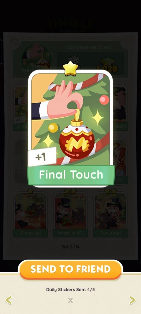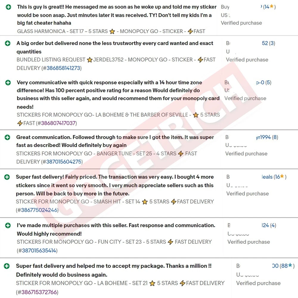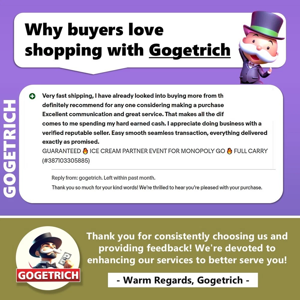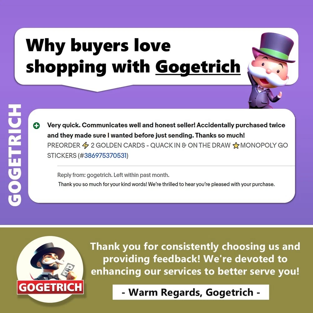 Welcome to gogetrich, here you will find all the stickers you need! You can choose your Sticker on Sticker List! Please read the description below: 🌟 Once the sticker has been paid for, please send me your Monopoly invite link and username. I will send the screenshot during the sticker sending process, and once the process is complete. 🌟 Stickers will usually be sent IMMEDIATELY unless I'm offline. Items will be sent within 5-10 minutes. 🌟 I'm from Indonesia, not the USA, so expect a 12-hour time difference. However, sending stickers typically takes less than 24 hours, so no worries. ✅ After receiving the stickers, please take a screenshot and confirm them via message as proof. ✅ Need other stickers? Message me, and I'll promptly update you on the availability of Monopoly Go stickers. Note: This is just digital currency in the mobile game Monopoly GO! All items in this listing are the sole digital property of Hasbro. I do not own anything, and you are just paying me for my time to give you an online gaming virtual item. Thank you and Happy shopping! --------------------------------------------------- Monopoly go Monopoly go sticker Monopoly go card Jingle Joy Monopoly Go Monopoly Go Jingle Joy Monopoly go Set 1- Frosty Freight (⭐️) Monopoly go Set 1 - Onward Tracks (⭐️) Monopoly go Set 1 - Sound the Horn (⭐️) Monopoly go Set 1 - The Village (⭐️) Monopoly go Set 1 - Santa's Bag (⭐️) Monopoly go Set 1 - Festive Crossing (⭐️) Monopoly go Set 1 - Swipe!(⭐️) Monopoly go Set 1 - Fond Farewell (⭐️) Monopoly go Set 1 - Toy Trains (⭐️) Set 2 - Final Touch (⭐️) Set 2 - Troublemaker (⭐️) Set 2 - Tycoon Tears (⭐️) Set 2 - Ruff Day (⭐️) Set 2 - Clever Dog (⭐️) Set 2 - Paw-tastic (⭐️) Set 2 - Surprise (⭐️) Set 2 - What Is It?! (⭐️⭐️) Set 2 - Fur-ever! (⭐️⭐️) Set 3 - Furry Couture (⭐️) Set 3 - Whirlwind (⭐️) Set 3 - Faux Paw (⭐️) Set 3 - Santa Paws (⭐️) Set 3 - Dogues (⭐️) Set 3 - Short Measure (⭐️) Set 3 - Pup Strut (⭐️⭐️) Set 3 - Little Helper (⭐️⭐️) Set 3 - Last Bow (⭐️⭐️⭐️) Set 4 - Knead Love (⭐️) Set 4 - Lebkuchen (⭐️) Set 4 - Tamal-lalala (⭐️) Set 4 - Festive Feast (⭐️) Set 4 - Stuffed Squash (⭐️⭐️) Set 4 - Dough-lightful (⭐️⭐️) Set 4 - Beiglicious (⭐️⭐️) Set 4 - Doro Wat (⭐️⭐️⭐️) Set 4 - Yes Yule! (⭐️⭐️⭐️) Set 5 - Perfection (⭐️) Set 5 - Behold! (⭐️) Set 5 - Shopping Spree (⭐️) Set 5 - Now We're Talking (⭐️) Set 5 - The Tea (⭐️⭐️) Set 5 - Top This! (⭐️⭐️) Set 5 - Sweet Standoff (⭐️⭐️⭐️) Set 5 - Tycoon Tie (⭐️⭐️⭐️) Set 5 - Electric Bill (⭐️⭐️⭐️⭐️) Set 6 - Opening Night (⭐️) Set 6 - Prop Painter (⭐️⭐️) Set 6 - Dancing Santa (⭐️⭐️) Set 6 - Elf Can-Can (⭐️⭐️) Set 6 - Glowing Review (⭐️⭐️) Set 6 - Grand Solo (⭐️⭐️) Set 6 - Snow Jon (⭐️⭐️⭐️) Set 6 - Feliz Navidad (⭐️⭐️⭐️) Set 6 - Curtain Call (⭐️⭐️⭐️⭐️) Set 7 - Brush Up (⭐️⭐️) Set 7 - Fresh Plans (⭐️⭐️) Set 7 - Puzzler (⭐️⭐️) Set 7 - Snow Mansion (⭐️⭐️) Set 7 - Hot Cocoa (⭐️⭐️) Set 7 - Le Artist (⭐️⭐️⭐️) Set 7 - Masterpiece (⭐️⭐️⭐️) Set 7 - Fortitude! (⭐️⭐️⭐️⭐️) Set 7 - Puzzling Piece (⭐️⭐️⭐️⭐️) Set 8 - Gift Exchange (⭐️⭐️) Set 8 - Setup (⭐️⭐️) Set 8 - Eyes on the Prize (⭐️⭐️) Set 8 - Grand Fantasies (⭐️⭐️⭐️) Set 8 - Detective Work (⭐️⭐️⭐️) Set 8 - Gift Stealer (⭐️⭐️⭐️) Set 8 - Bribery (⭐️⭐️⭐️) Set 8 - The Reveal (⭐️⭐️⭐️⭐️) Set 9 - Wrecking Bauble (⭐️⭐️) Set 9 - Prized Acorn (⭐️⭐️) Set 9 - Making Biscuits (⭐️⭐️) Set 9 - Ear-resistible (⭐️⭐️⭐️) Set 9 - Beary Cute (⭐️⭐️⭐️) Set 9 - Hedgy (⭐️⭐️⭐️) Set 9 - A Bit Husky (⭐️⭐️⭐️⭐️) Set 9 - Meowy Globe (⭐️⭐️⭐️⭐️⭐️) Set 10 - Festive Fun (⭐️⭐️) Set 10 - Woodcarver (⭐️⭐️) Set 10 - What's Crackin? (⭐️⭐️⭐️) Set 10 - Bavarian Pyramid (⭐️⭐️⭐️) Set 10 - Peg-E On Ice (⭐️⭐️⭐️) Set 10 - Cocoa Clink (⭐️⭐️⭐️) Set 10 - Merry Krampus (⭐️⭐️⭐️⭐️) Set 10 - Going Nuts! (⭐️⭐️⭐️⭐️⭐️) Set 11 - Grand Goat (⭐️⭐️) Set 11 - Superstition (⭐️⭐️⭐️) Set 11 - Jolly Trolley (⭐️⭐️⭐️) Set 11 - As Janeiras (⭐️⭐️⭐️) Set 11 - Hogmanay (⭐️⭐️⭐️) Set 11 - Saxy Santa (⭐️⭐️⭐️⭐️) Set 11 - Julebord (⭐️⭐️⭐️⭐️⭐️) Set 11 - Lucky Grapes (⭐️⭐️⭐️⭐️⭐️) Set 12 - Jackpot (⭐️⭐️⭐️) Set 12 - Santa Snack (⭐️⭐️⭐️) Set 12 - Master Plan (⭐️⭐️⭐️) Set 12 - Loose End (⭐️⭐️⭐️) Set 12 - Tucked In!(⭐️⭐️⭐️⭐️) Set 12 - Unexpected Gifts (⭐️⭐️⭐️⭐️⭐️) Set 12 - Happy Thieves (⭐️⭐️⭐️⭐️⭐️) Set 13 - Final Countdown (⭐️⭐️⭐️) Set 13 - Blown Away (⭐️⭐️⭐️) Set 13 - Make Some Noise (⭐️⭐️⭐️⭐️) Set 13 - New Year's Glam (⭐️⭐️⭐️⭐️) Set 13 - Midnight Vibes (⭐️⭐️⭐️⭐️⭐️) Set 13 - 3, 2, 1! (⭐️⭐️⭐️⭐️⭐️) Set 14 - Tree Hugger (⭐️⭐️⭐️⭐️) Set 14 - The Advent (⭐️⭐️⭐️⭐️) Set 14 - Time to Move On (⭐️⭐️⭐️⭐️⭐️) Set 14 - Weeks Later (⭐️⭐️⭐️⭐️⭐️) Set 15 - The Letter (⭐️⭐️⭐️⭐️) Set 15 - Detoured! (⭐️⭐️⭐️⭐️⭐️) Set 15 - Seagull Save (⭐️⭐️⭐️⭐️⭐️) Set 16 - Jump! (⭐️⭐️⭐️⭐️⭐️) Set 16 - 12 Round Fruits (⭐️⭐️⭐️⭐️⭐️) Set 16 - Midnight Mayhem (⭐️⭐️⭐️⭐️⭐️) Monopoly go 5 star Monopoly go 4 star Monop
