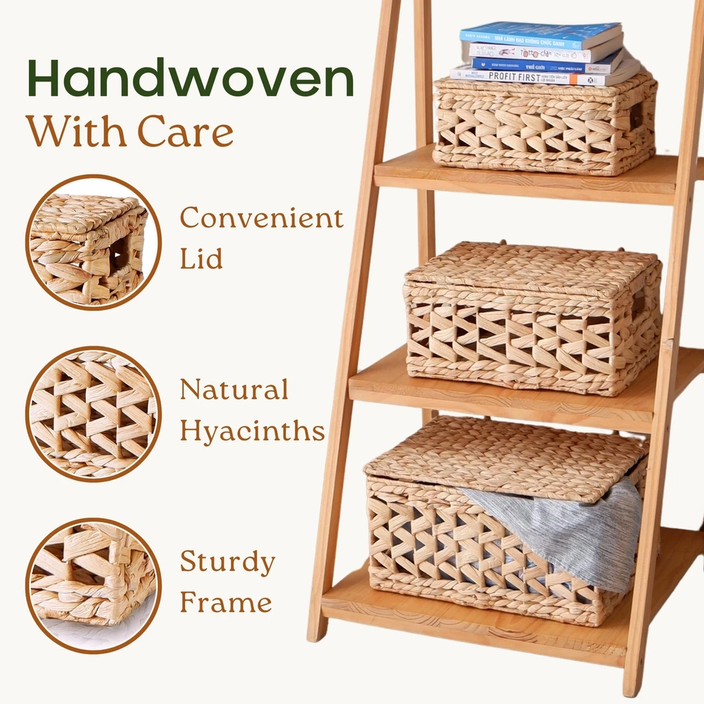 πΏ [πππππππ ππππππππ] Handwoven from water hyacinth, these lidded wicker baskets add a warm atmosphere to your home. Durable fibers and chemical-free, they will accompany your home for a long time! π§‘ [ππππππ πππππππππ πππππππ] Designed with a wavy open-weave pattern, these woven baskets are an irresistible item to mix and match with your furniture. Its appearance is suitable for many home decor styles, from rustic to bohemian. π¦ [ππππππ π πππππ] Our wicker baskets with lids are woven around a sturdy metal wireframe that reinforce their structure under any weight. Not only do they add a touch of style to your home, their flexible strands with steel frame can reliably withstand everyday use. Store up to 12 pounds in the large-size basket! π― [ππππππππ ππππππππ] These versatile baskets serve multiple purposes, including closet organization, toy storage π§Έ, bathroom tidying π§», pantry organization πΏ, book & magazine storage π, under-bed storage, and more. π§° [πππππ-ππ πππππππ] With our built-in handles, you can easily move these baskets everywhere in your home. The handles are specially crafted by water hyacinth which is softer than other natural material to make sure that there is no splinter that can piercing your skin. β [ππππ] Each square hyacinth basket is handcrafted, which may result in slight variations in shape, size, and color. This set includes three sizes: L14" x W11" x H7", L12.5" x W9" x H6", and L11" x W8" x H5". Suitable for indoor use only; All new wicker storage baskets have a particular natural smell of fibers that gradually disappears.