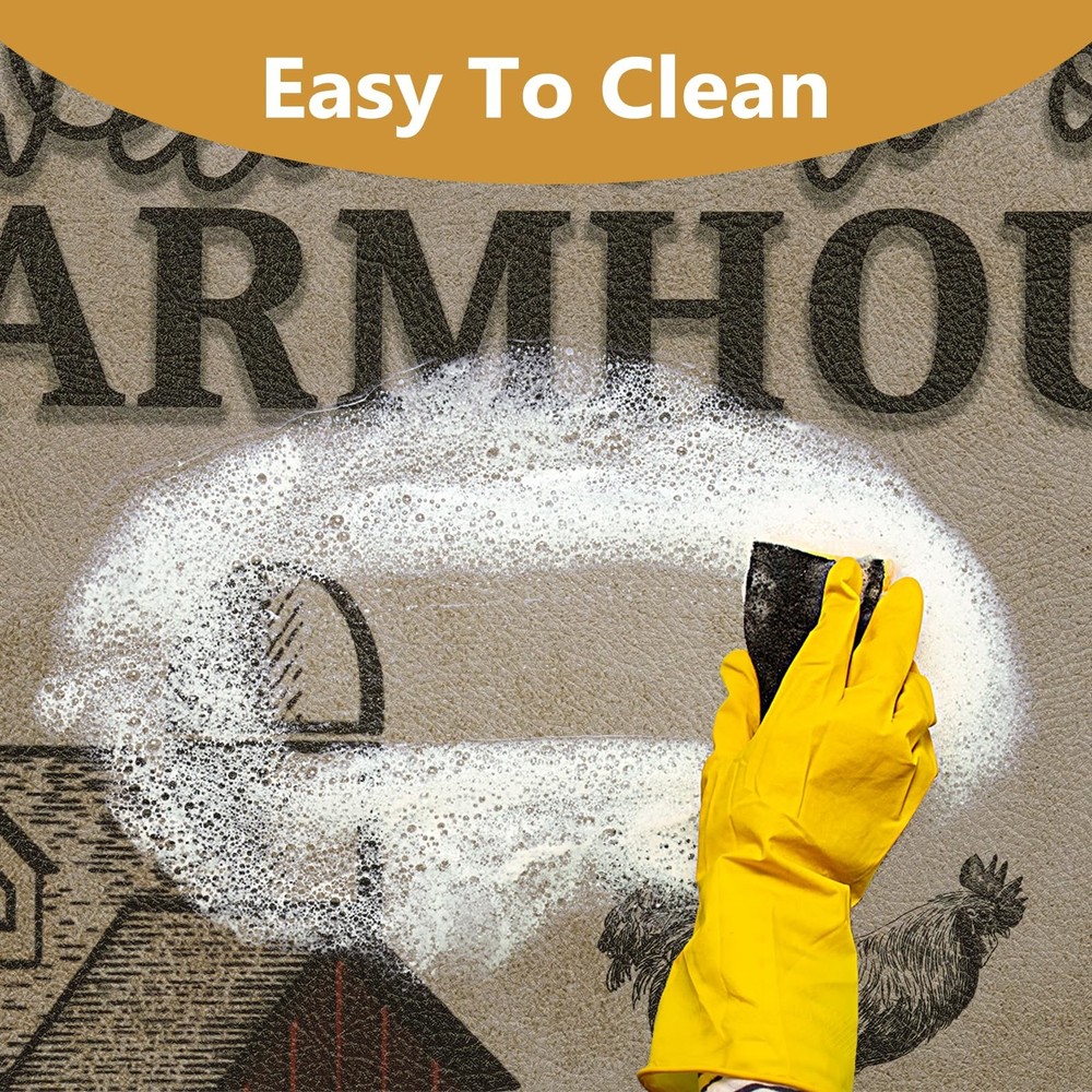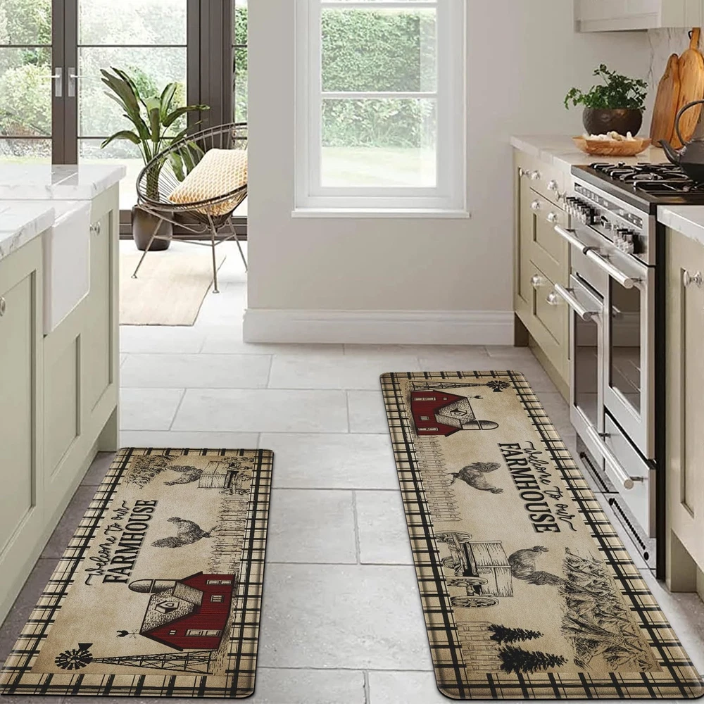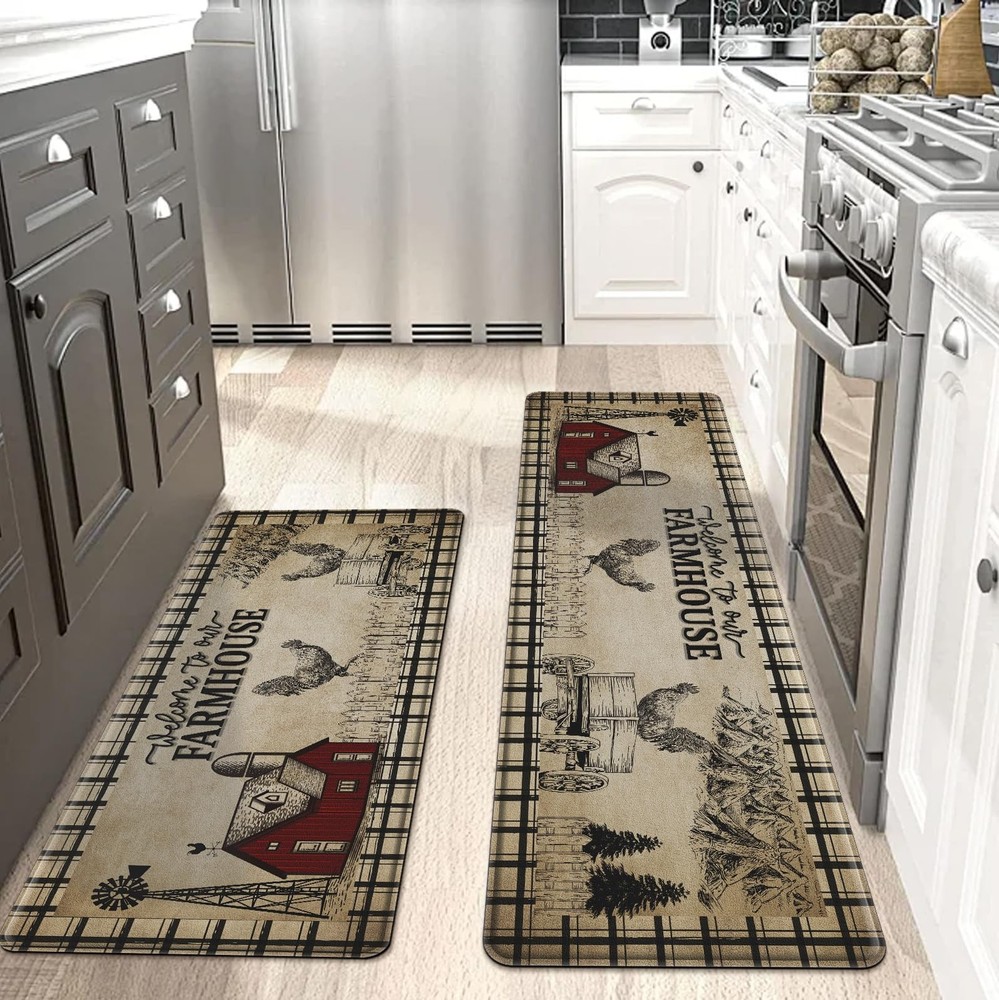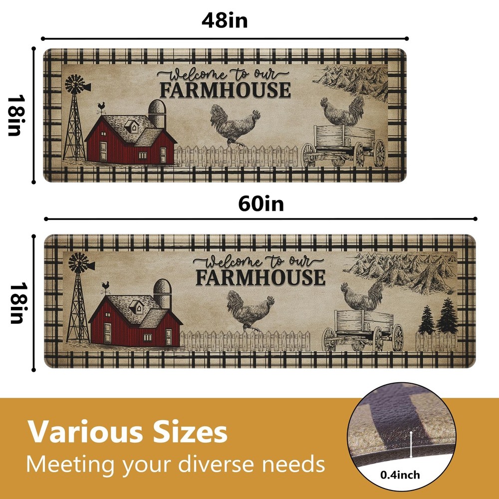 Comfortable and Soft Pressure Reducing Floor Mat π[FIT SIZE]: CHICNOOK Kitchen Floor Mats measure 18" x 48" + 18" x 60" in a set of 2, providing enough coverage while avoiding becoming a stumbling block. Please keep it away from fire and sharp objects for safety and keep the floor dry before use. π[ANTI-FATIGUE]: Our farmhouse style kitchen floor mats are made of high-density PVC foam material with a thickness of 0.4 inches, providing an extra layer of softness for your standing and walking, effectively relieving pressure on your feet and knees. π[NON-SLIP SAFETY]: This rustic style cozy kitchen floor mat is made of high-quality PVC material with memory foam properties, not easy to deform, providing excellent durability and non-slip, ensuring you have a solid and safe surface when working in the kitchen or other areas. π[EASY TO CLEAN]: Our waterproof kitchen floor mats are easy to maintain, simply vacuum the mat to remove dust, or easily wipe up stains with a damp cloth or sponge to easily remove spills and stains. The wrinkle-free design protects your wood floors, dishes and knees. π[MULTIFUNCTIONAL AND MULTI-OCCASION]: This floor mat has a charming farmhouse color design that adds a touch of elegance and style to your kitchen or other areas, making it ideal for a variety of occasions (e.g., kitchen sinks, stoves, bathrooms, etc.)