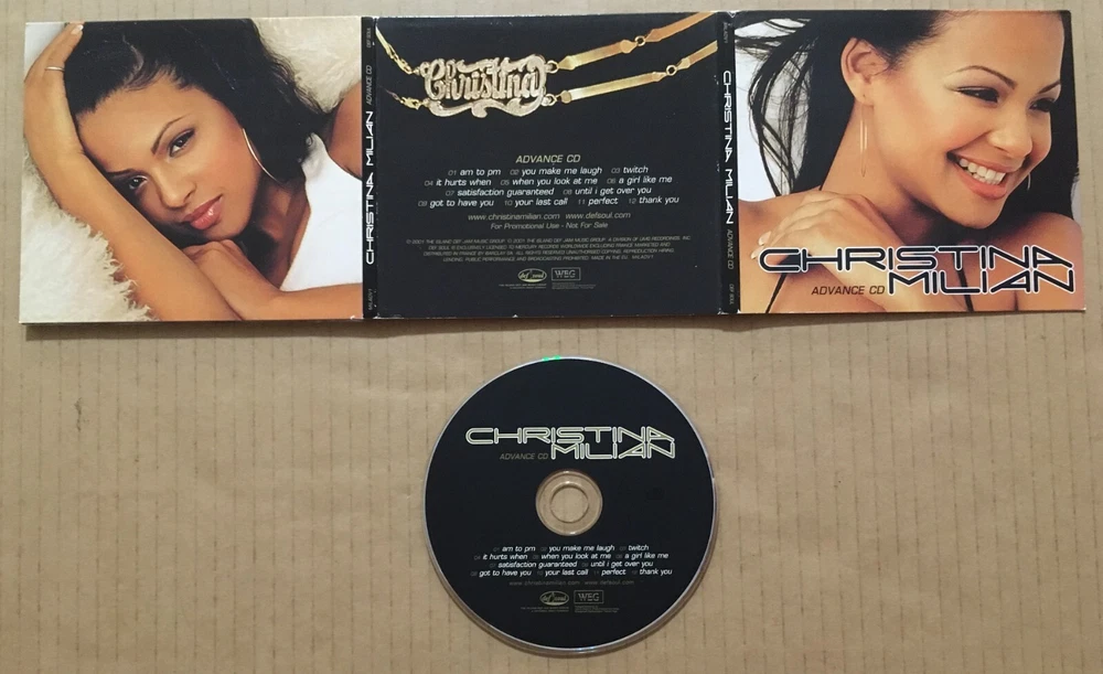 2001 MINT CONDITION CD and NEAR MINT Condition packaging (there is ULTRA LIGHT general wear BUT STILL VERY EXTREMELY NICE SEE SCAN FOR THE ACTUAL ITEM AND THE CD ITSELF IS MINT) THIS WAS MADE IN USA ONLY THIS WAS AN ULTRA LIMITED EDITION PRESSING PROMO CD , THAT WENT TO RETAIL MUSIC INDUSTRY PERSONNEL ONLY THIS PACKAGING AND COVER ARTWORK IS COMPLETELY DIFFERENT THAN THE FINAL RELEASE, when the actual album was RELEASED the package and IMAGE looked MUCH different than this release, . THE OTHER IMPORTANT DIFFERENCE IS THIS CD CONTAINS THE SONG PERFECT WHICH DID NOT MAKE IT ON THE FINAL CD, THIS SONG IS PREVIOUSLY UNRLEASED Made in EUROPE ONLY (it is in English & playable on all devices that play cd’s) THIS WAS MADE IN ULTRA LIMITED QUANTITY The complete track listing is: Am to pm You make me laugh Twitch It hurts when When you look at me A girl like me Satisfaction guaranteed Until I get over you Got to have you Your last call PERFECT (PREVIOUSLY UNRLEASED) Thank you THE PROMO CATALOGUE NUMBER IS: MILADV1 . This CD comes in a thick card stock paper MULTI FOLD OPEN DIGI PACK sleeve . International shipping Available Any qestions please ask PLEASE SEE OUR OTHER ITEMS FOR OTHER RARE ITEMS FROM CHRISTINA MILIAN & OTHER RARE POSTERS/VINYL/CD’s/TAPES/SHIRTS/ FLATS ITEMS & WE DO COMBINE SHIPPPING Sale of this item is specifically allowed under the copyright laws of the United States {17 USC 109(a)} which states that "the owner of a particular copy or phonorecord lawfully made...is entitled, without the authority of the copyright owner, to sell or otherwise dispose of possession of the copy or phonorecord". THIS ITEM IS 100% OFFICIAL AND RELEASED BY THE RECORD LABEL, if you have any questions or concerns about this item please contact us and we can resolve any issue immediately