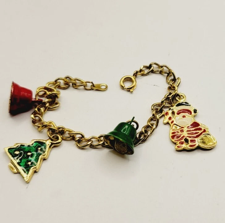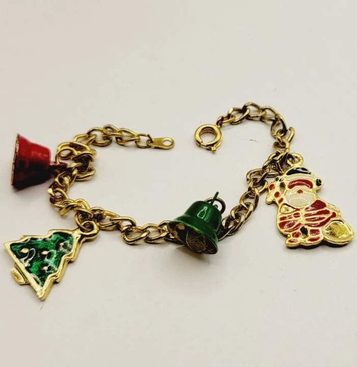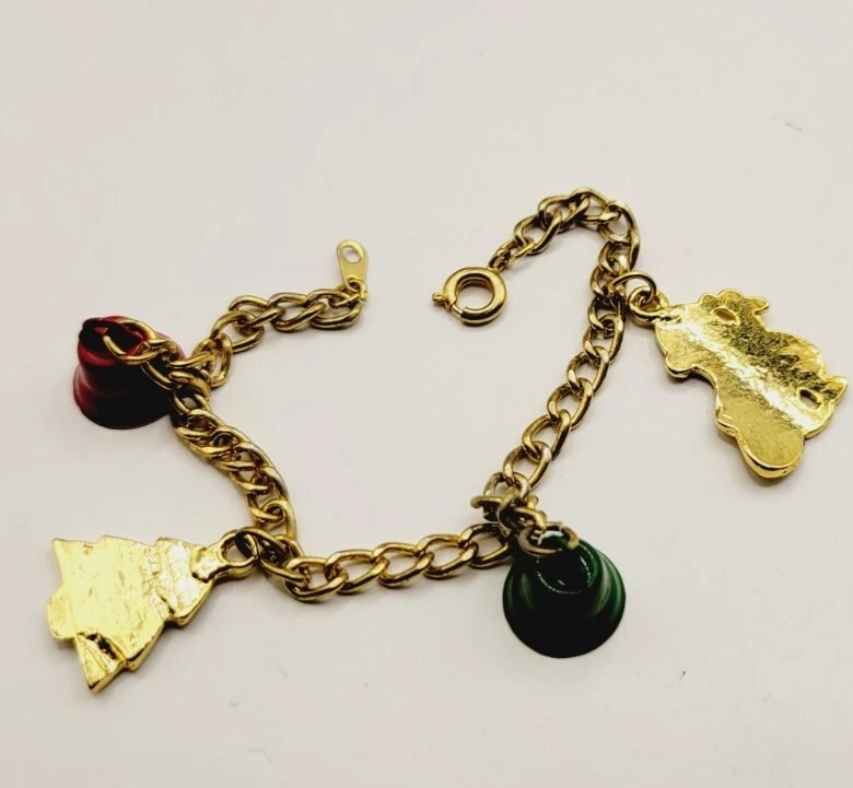 CHRISTMAS CHARM BRACELET Dangle Enamel Gold-Tone 6.75" Bell Snowman #JJ
