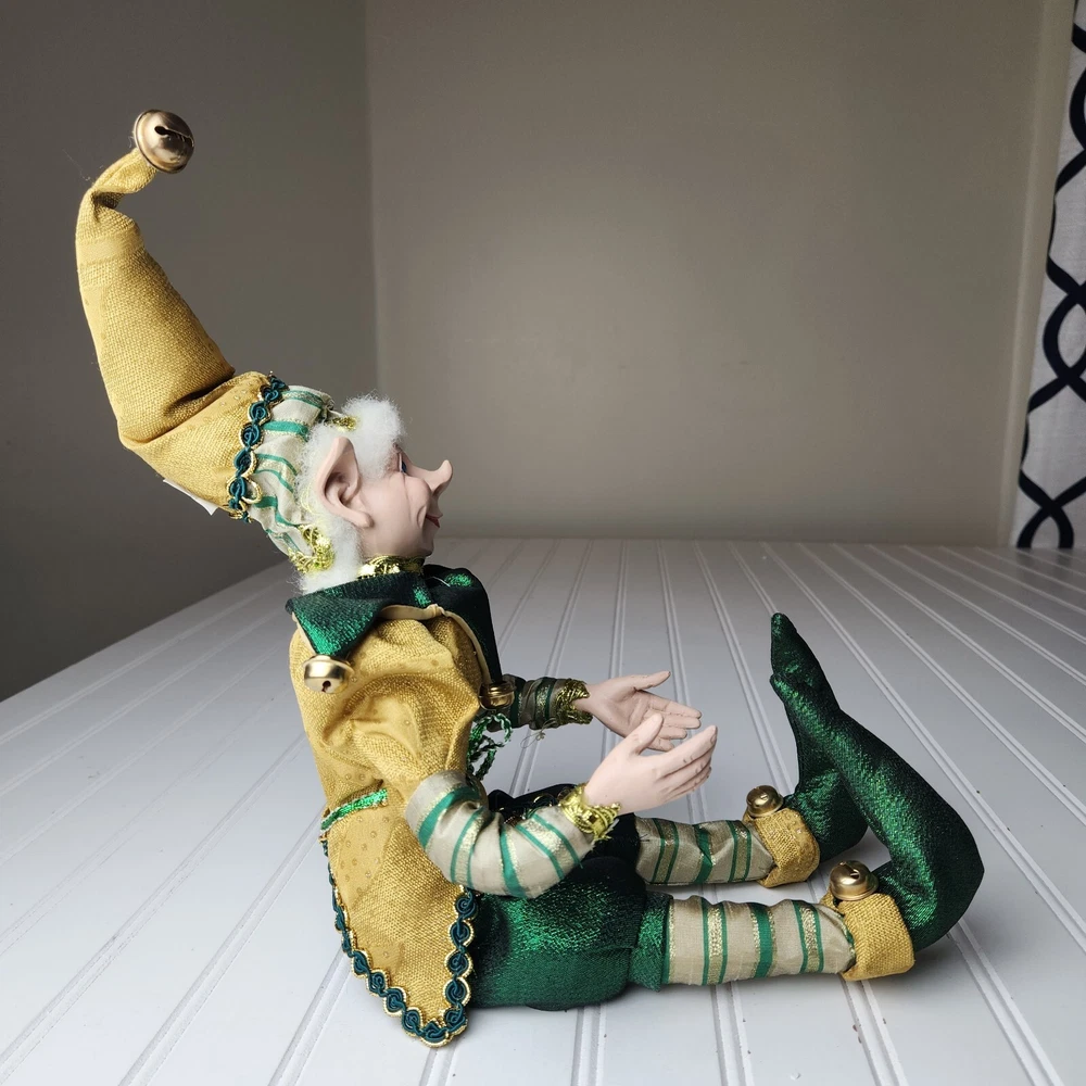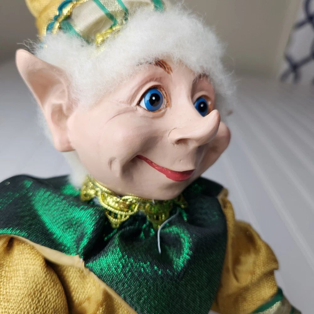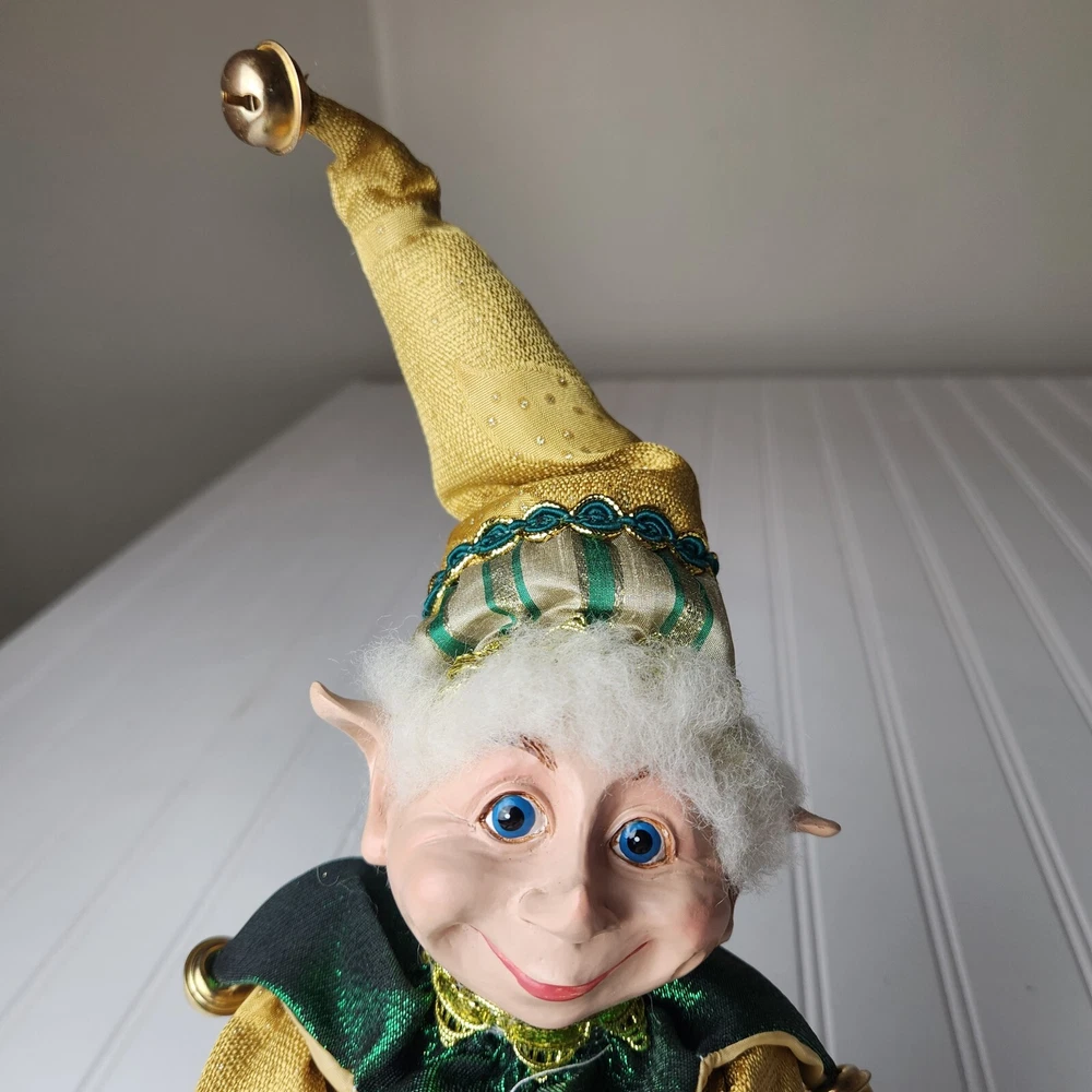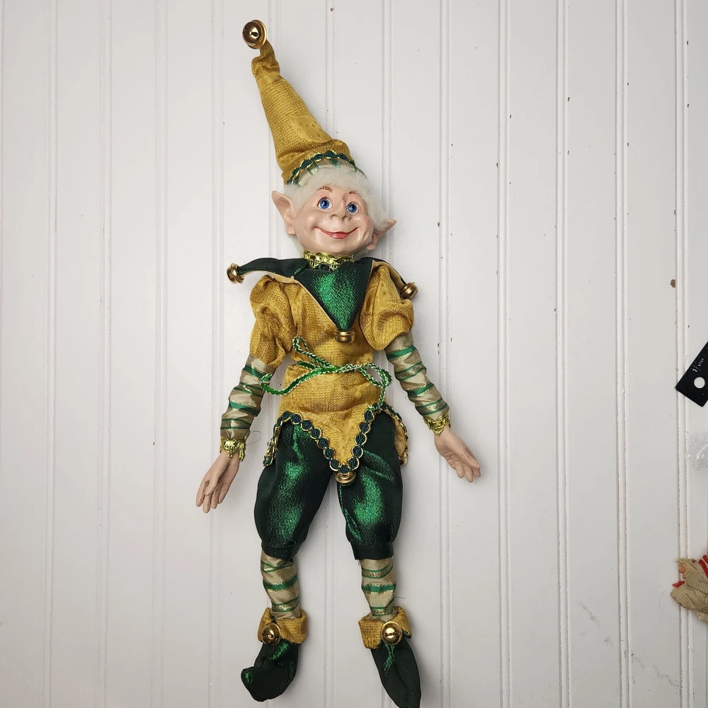 Bring some holiday cheer to your home with this charming 18" (to top of hair) posable elf doll from Raz Imports???. With its gold and green outfit and wire frame, this elf doll is perfect for Christmas decorating. The elf doll is bendable, making it perfect for creating unique and fun poses. Made with a mix of materials, this elf doll is a great addition to any collection. It features a multicolor design and is perfect for adults who love seasonal and elf fairy dolls. This elf doll is a must-have for anyone who loves collecting unique and fun holiday decorations. Great preowned condition. Maybe a few small stray marks. Will be shipped bent at the waist. Beautiful!