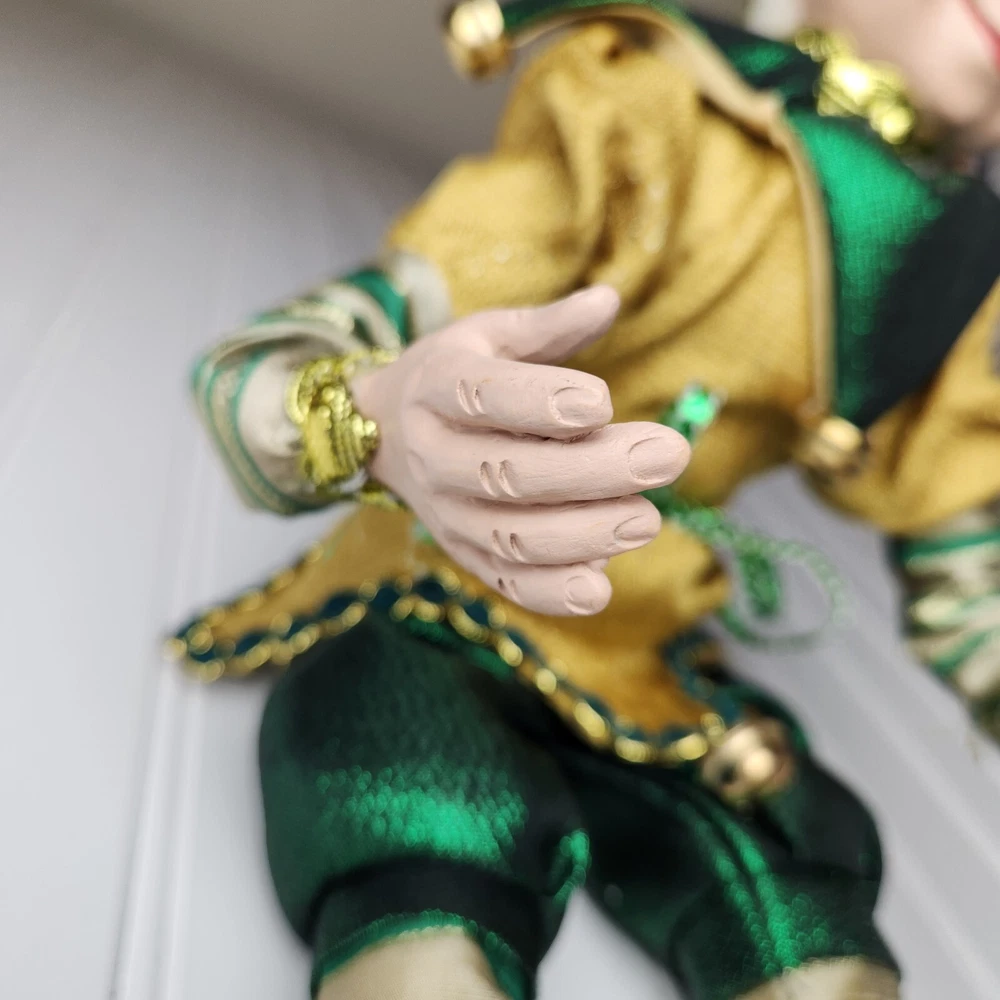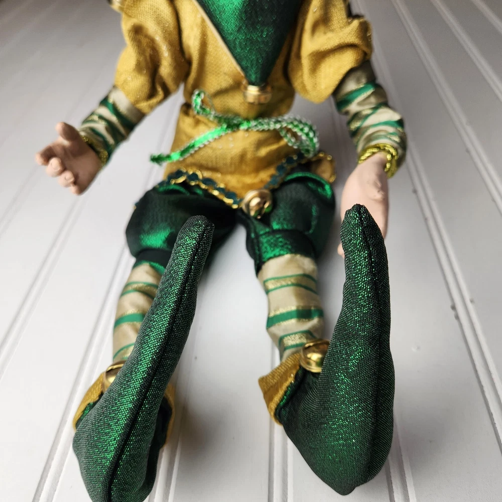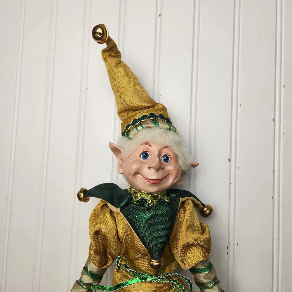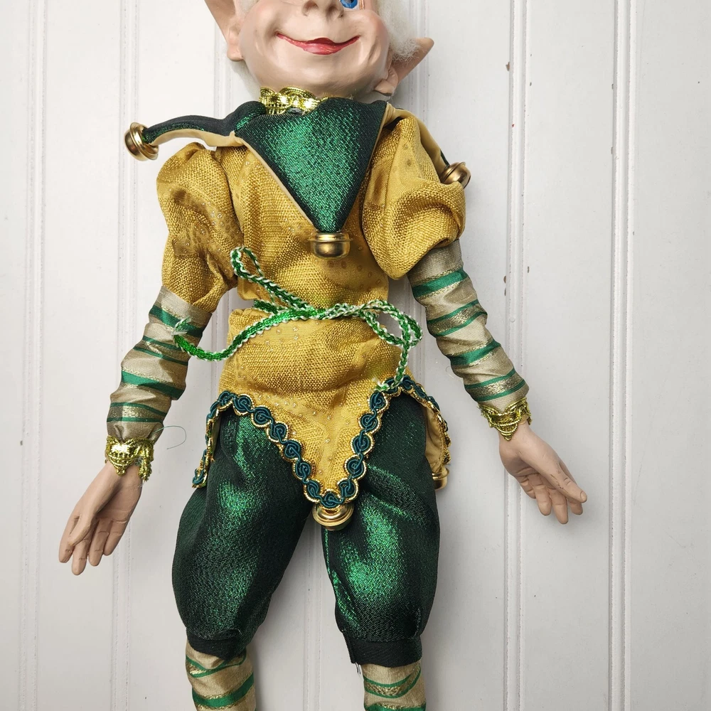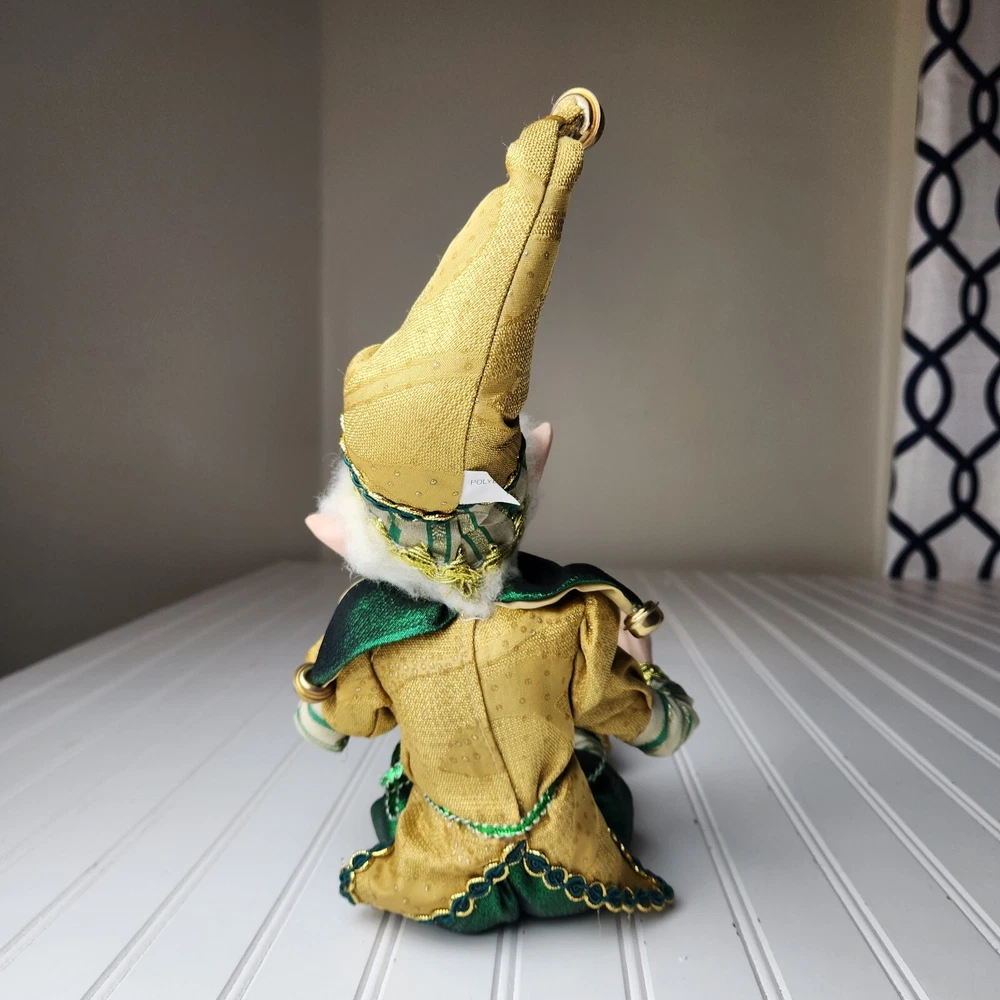 Bring some holiday cheer to your home with this charming 18" (to top of hair) posable elf doll from Raz Imports???. With its gold and green outfit and wire frame, this elf doll is perfect for Christmas decorating. The elf doll is bendable, making it perfect for creating unique and fun poses. Made with a mix of materials, this elf doll is a great addition to any collection. It features a multicolor design and is perfect for adults who love seasonal and elf fairy dolls. This elf doll is a must-have for anyone who loves collecting unique and fun holiday decorations. Great preowned condition. Maybe a few small stray marks. Will be shipped bent at the waist. Beautiful!