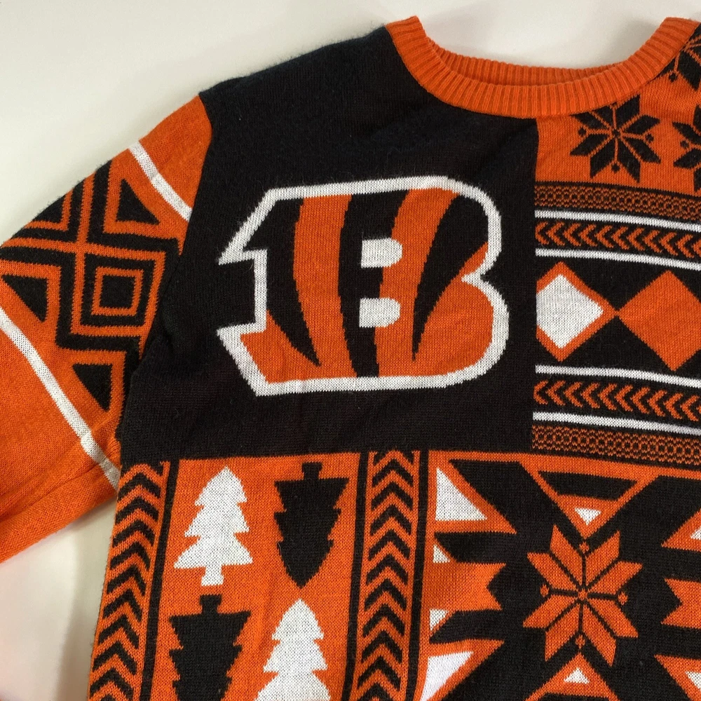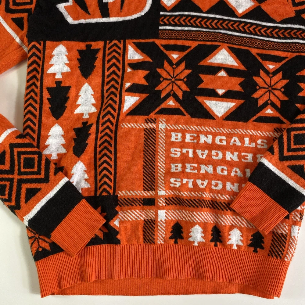 Show off your love for the Cincinnati Bengals with this officially licensed NFL Team Apparel sweater. Perfect for the holiday season, this unisex adult sweater features the team's iconic orange color and is available in size large. The sweater is made for football fans and carries the team's logo prominently on the front, making it a must-have for any fan. Celebrate Christmas in style with this comfortable and stylish sweater. It is perfect for both adults and teens and is a great addition to any sports fan's wardrobe. Get ready to cheer on your favorite team in the National Football League (NFL) and show off your love for the Cincinnati Bengals with this awesome sweater.