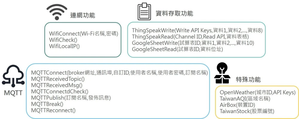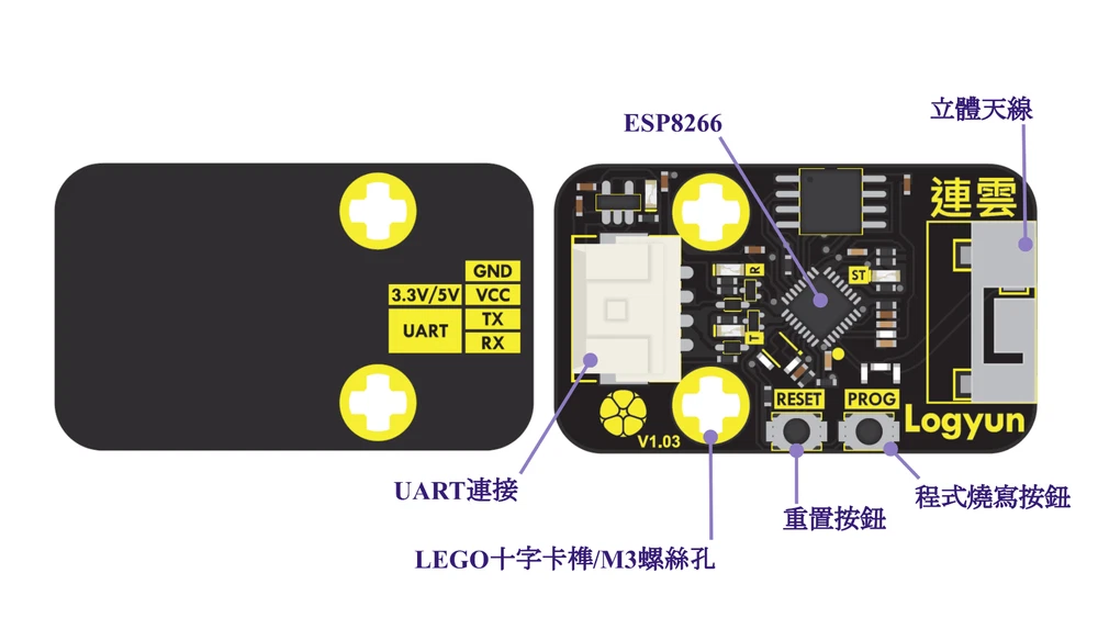 Description Logyun by CIRCUS Pi is a Wi-Fi module designed for IoT projects. It is user-friendly, the built-in functions with various microcontrollers. Good for educational program, expedite the development process for projects. it is suitable for beginners, Logyun is compatible with BBC micro:bit, and it provides expanded building blocks and sample programs that can be used in MakeCode For advanced users, we also provide examples and programs for Raspberry Pi Pico and Arduino, the user also could customize the cloud connection function. You will be able to create your own by the programming language that you often use. built-in restore function allows you to try as many time as you want. Type: Wi-Fi Module Voltage: 3.3V/5V interface: UART redevelope:yes command: WifiConnect(Wi-Fi ID, password) WifiCheck WifiLocalIP ThingSpeakWrite(Write API Keys,index1,index2,...,index8) ThingSpeakRead(Channel ID,Read API,column) GoogleSheetWrite(worksheetID,index1,index2,...,index10) GoogleSheetRead(worksheetID,index address) MQTTConnect(broker address,port,option ID,userPassword,session vid) MQTTReceivedTopic MQTTReceivedMsg MQTTConnectdCheck MQTTPublish(Topic, message) MQTTBreak MQTTReconnect OpenWeather(CityID,API Keys) TaiwanAQI(region name) AirBox(deviceID) TaiwanStock(stock number)