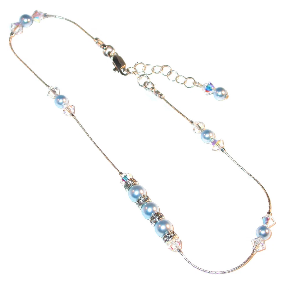 CLEAR AB Crystal & BLUE Pearl Anklet Sterling Silver Bridal Swarovski Elements SWAROVSKI CRYSTAL ELEMENTS STERLING SILVER ANKLE BRACELET Colors: Light Blue Pearls, Clear AB Crystals Choose Your Length: See Size Guide Below Made of: 100% genuine Swarovski Crystal & Pearl Elements Metal: .925 Sterling Silver Perfect for the BRIDE who wants "SOMETHING BLUE" This Anklet is designed with genuine Swarovski Crystal & Pearl Elements, accented with sparkling Swarovski clear crystal silver-plated rondelles. All other silver parts are .925 Sterling Silver. The multi-faceted crystals catch the light and sparkle beautifully. It can be made in 3 sizes, each with a 1" extender that allows it to be fastened for maximum comfort. The extender ends with a dainty dangling crystal charm that hangs down from on the end. Hand-crafted in the USA. SIZE GUIDE SMALL Ankle: 8.5" to 9.5" AVERAGE Ankle: 9.5" to 10.5" LARGE Ankle: 10.5" to 11.5" To measure your ankle, use a string. Put it around your ankle where you would like it to be. Make sure to give a little room for walking comfort. Then lay the string along a ruler to find your size. An Original Design by Tina Kincaid Brand New and Made for you! This item comes gift-boxed. Sets are boxed together, unless otherwise requested at checkout. CREATE A SET!! There are matching pieces available right now in my Ebay store to be purchased separately. Just CLICK ON THE CAPTION to open the listing in a separate page to take a closer look: LIGHT BLUE Pearl Pendant Drop Dangle Swarovski Crystal Elements Sterling Silver LIGHT BLUE Pearl Bracelet Sterling Silver Handcrafted Beaded Swarovski Elements More options LIGHT BLUE Pearl Pendant & Chain Sterling Silver Drop Swarovski Crystal Element More options LIGHT BLUE Pearl Necklace Bridal Bridesmaid Sterling Silver Swarovski Elements CHANGE THE COLOR! We stock most Swarovski crystal colors, all which are equally as beautiful in this design. You are welcome to email special requests or color combinations and check for availability. To view a complete lists of color samples, CLICK HERE to see our COLOR COMPARISON CHARTS! Check out my other items ! Be sure to add me to your favorites list ! INTERNATIONAL BUYERS.... PLEASE NOTE! Import duties, taxes and charges are not included in the item price or shipping cost. These charges cannot be determined by me and may be imposed by your country and are the buyer's responsibility. Please check with your country's customs office to determine what, if any, these additional costs will be prior to bidding or buying.