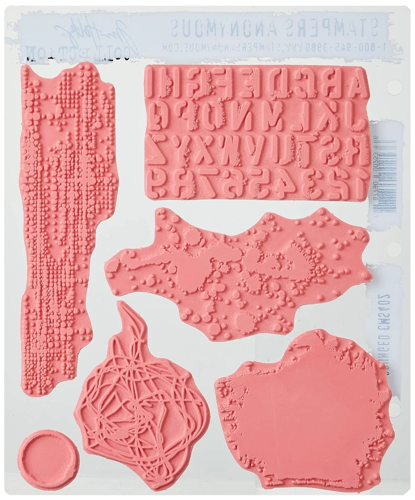 These red rubber stamps come mounted on cling foam so you can use them with any acrylic block (sold separately). Great for using with Tim's signature distressing techniques! Stamps come on a 3-hole punched sheet for easy storage in the Tim Holtz Stamp Storage Binder (also sold separately). This package contains an assortment of cling rubber stamps mounted on an 7x8. 5 inch backing sheet. Comes in a variety of designs. Each sold separately. Made in USA. These red rubber stamps come mounted on cling foam so you can use them with any acrylic block (sold separately) Great for using with Tim's signature distressing techniques! Stamps come on a 3-hole punched sheet for easy storage in the Tim Holtz Stamp Storage Binder (also sold separately) This package contains an assortment of cling rubber stamps mounted on an 7x8. 5 inch backing sheet Comes in a variety of designs Each sold separately. Made in USA.