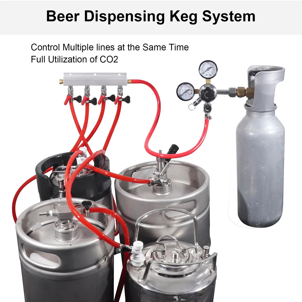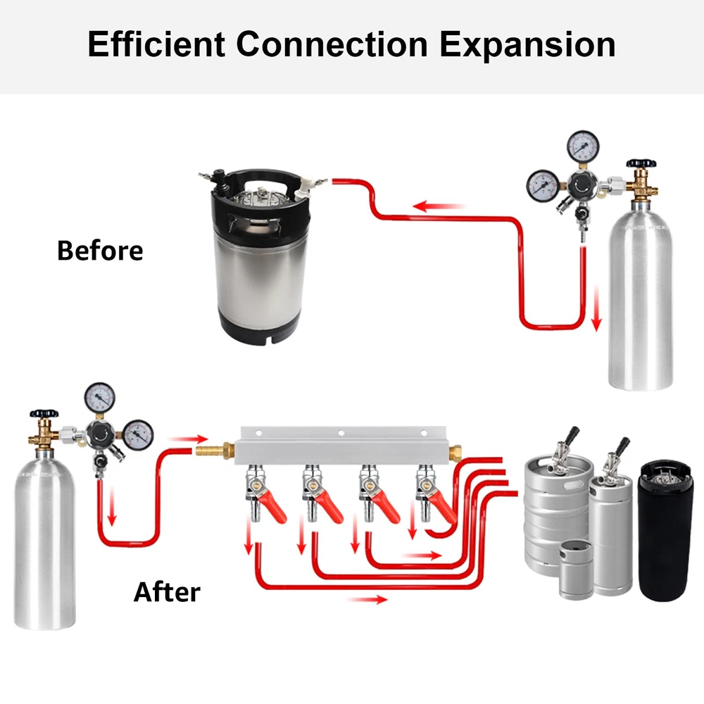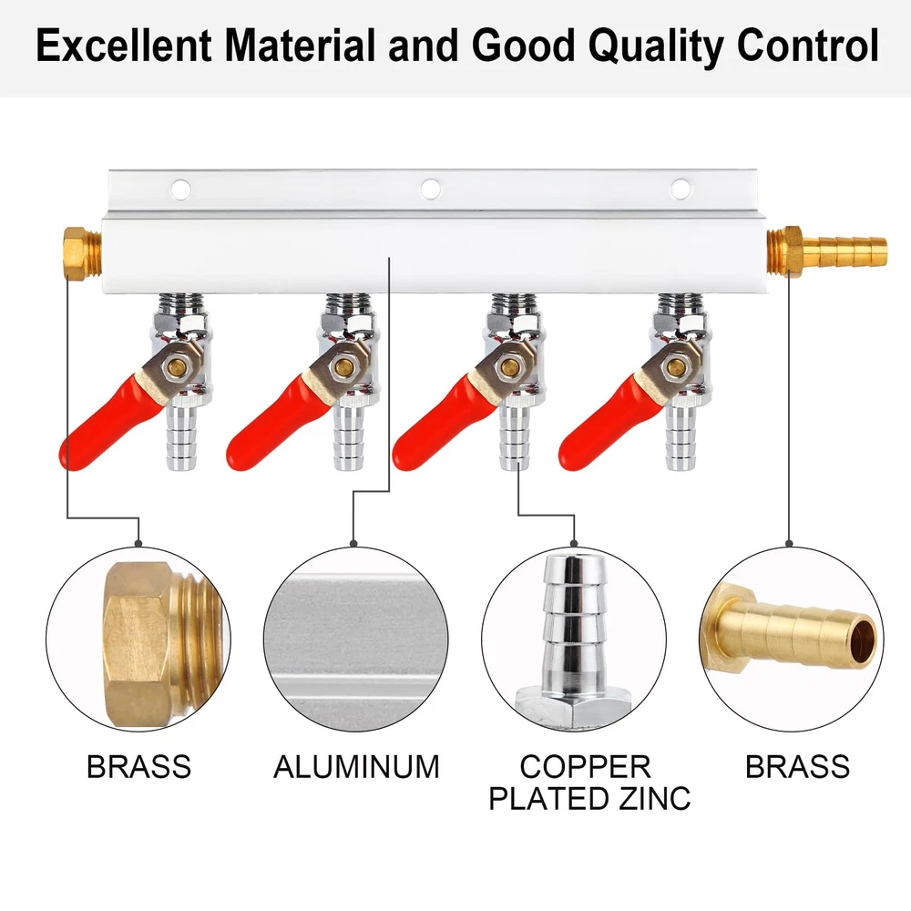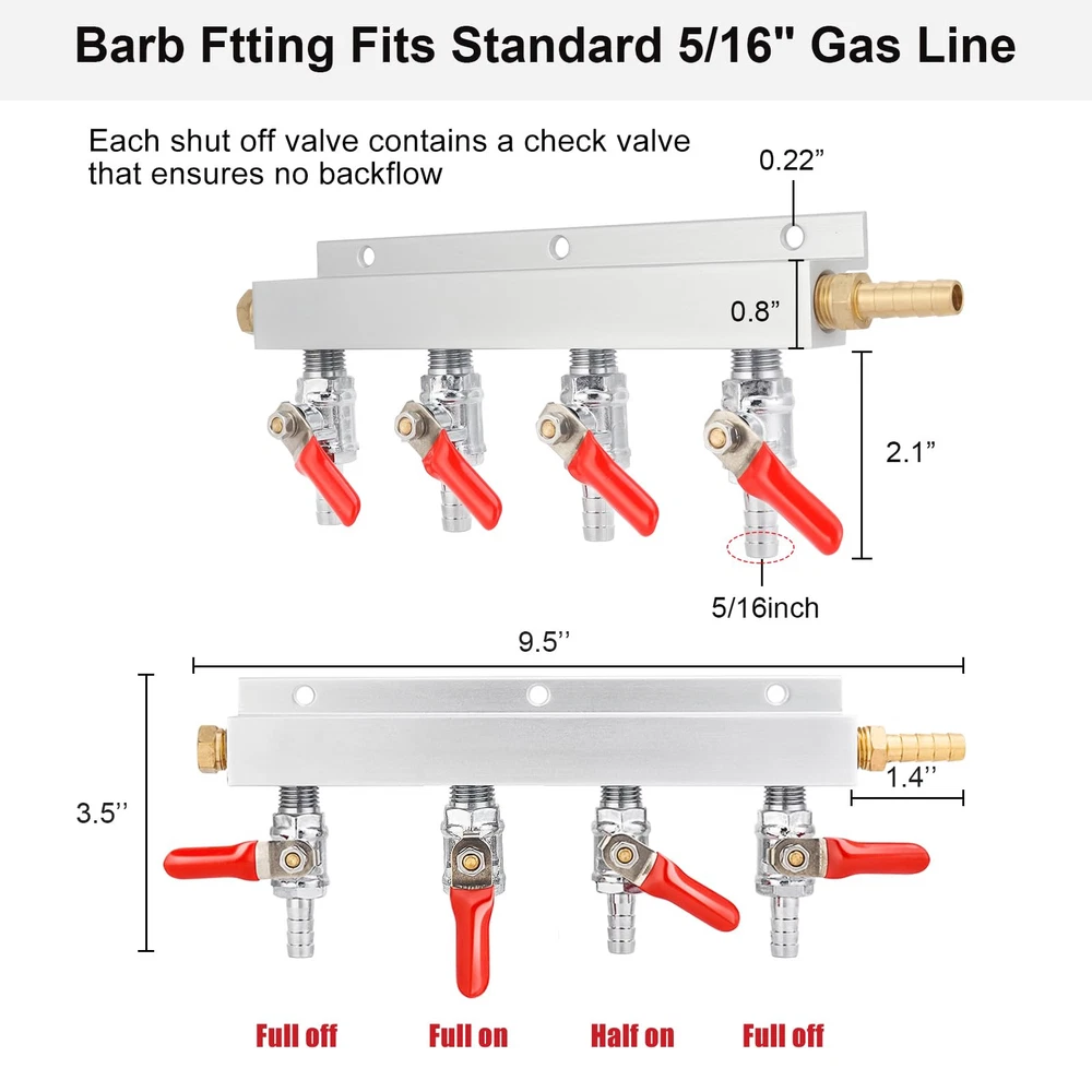 Efficience & Low Cost:The homebrew CO2 gas manifold has four O.D 5/16"barb fitting output, which allows you to dispense beer from four kegs simultaneously using CO2 gas cylinder. Connect multiple regulators at low cost Independent Shut Off & Built-in Check Valve: Each gas tubing line can be turned off individually without affecting the flow transferred to other kegs. Each shut-off valve contains a built-in check valve to ensure that CO2 carbonation beer will not flow back into the gas line if the brewing keg pressure value is high Quick and Stable Gas Dispensing Device: The 4-way manifold for the kegerator is installed to create a draft dispensing system that will enable you to quickly serve your beer or other carbonated beverages. A keg gas manifold can divide gas transferring into sections while maintaining equal pressure from your keg regulator to all beer taps Premium & No Leakage: This gas manifold is It is made of quality aluminum,which is strongly against rust, corrosion and easy to clean, healthy parts will not produce any odors to your brewing beer. we also provide 5 hose clamps to prevent any leaking between the CO2 gas line and barb fitting Wide Application: You can use this 4-way gas manifold for brewing CO2 regulator, Sankey coupler keg tap, ball lock keg, pin lock keg, counter pressure bottling keg to create multi-kegging systems for dispensing beer fast and conveniently at home or on travel. if you encounter any problems, we will do our best to help you solve them