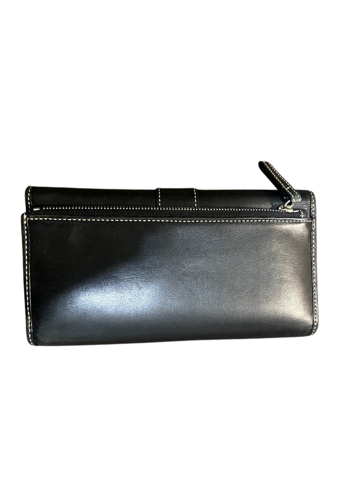 Experience the blend of sophistication and functionality with this COACH Black Leather Wallet. A versatile accessory designed to keep your essentials organized, this trifold wallet folds smoothly, revealing a neat arrangement of credit card slots, a coin compartment, a pen holder, an ID card window, and a checkbook area. Accented with a sleek zipper detail, the wallet's checkered pattern exudes a timeless elegance. Crafted from premium leather, the wallet measures 8 inches in length and 4.5 inches in width, making it an ideal size for everyday use without being bulky. Its classic black color ensures it matches any outfit, making it a must-have for those who appreciate both style and practicality in their accessories.