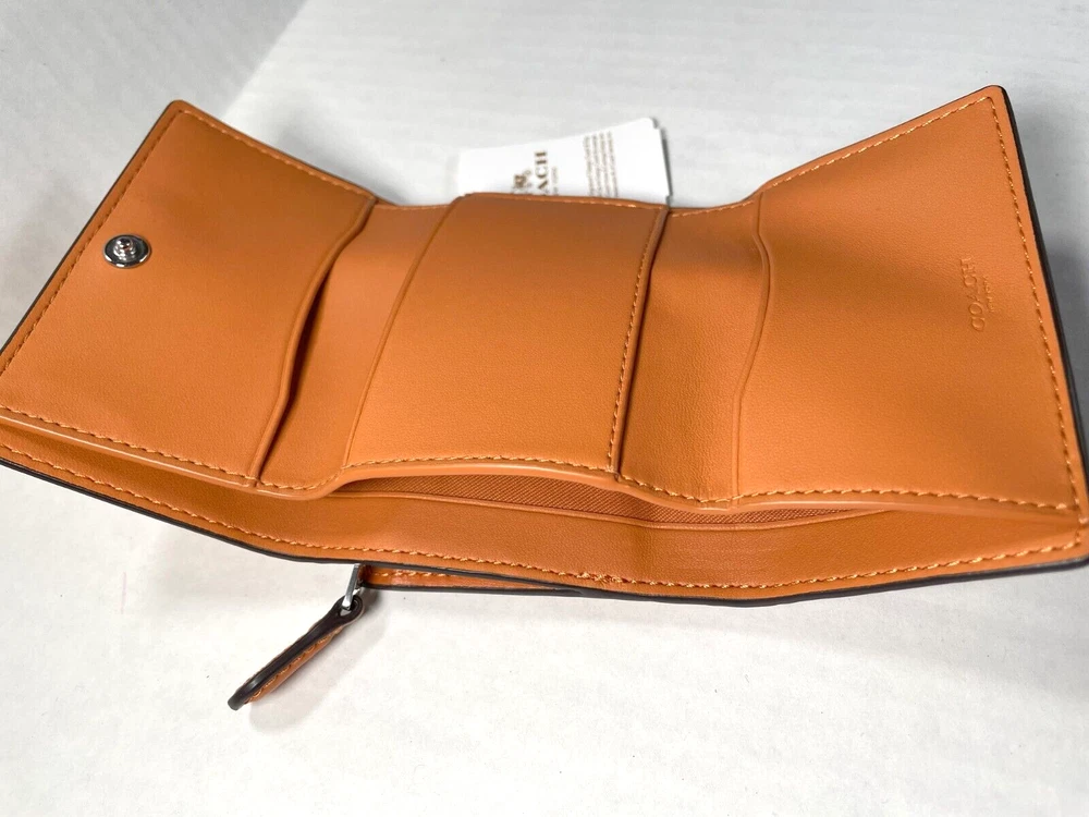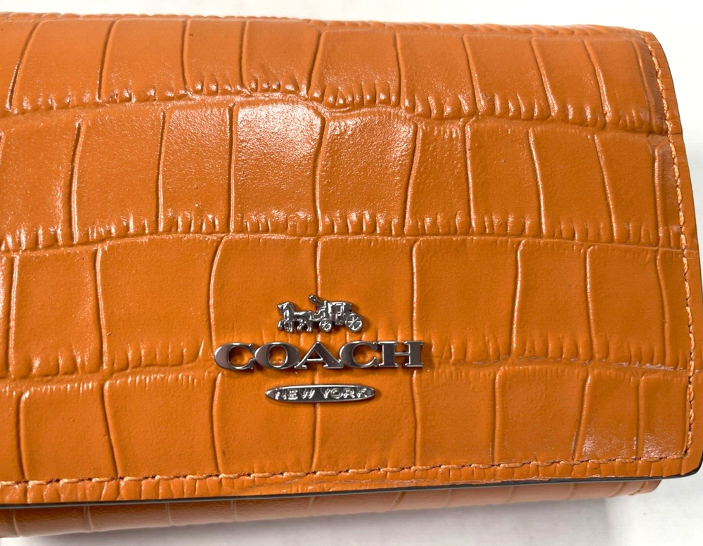 COACH CU914 Crocodile-embossed Leather Micro Wallet New with original price tag Absolutely Authentic! MSRP: $218.00 Color: Washed Orange Style: CU914 Description: Crocodile-embossed leather and smooth leather Front logo metal, in silver tone Snap closure Zip coin pocket Three credit card slots Full-length bill compartment Length: 4 inches Height: 3 inches Width: 1.25 inch Please let me know if you have any questions. Comes from a smoke free house. -------------------------------------------------------------------------------------------------------------- Your purchase will be shipped in 24 hours once payment is received and verified. You will be notified of the shipping date via E-Mail -------------------------------------------------------------------------------------------------------------
