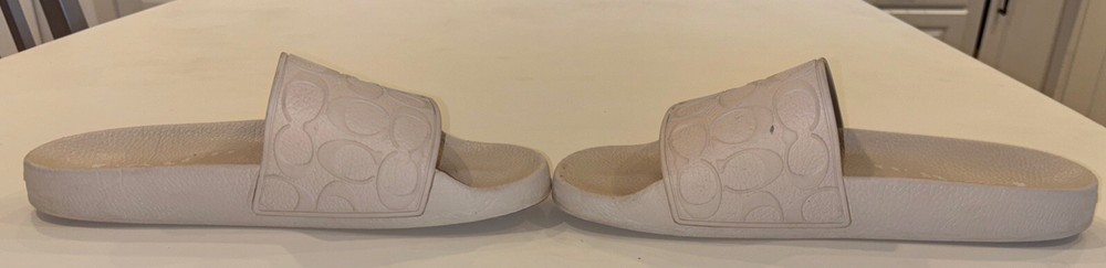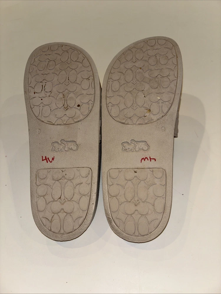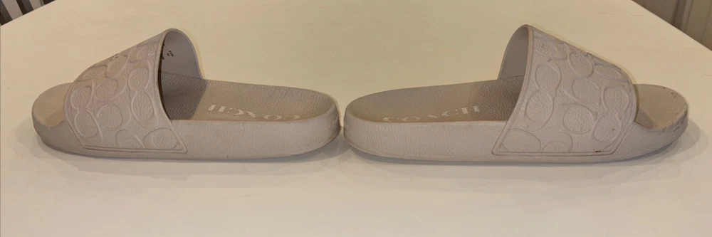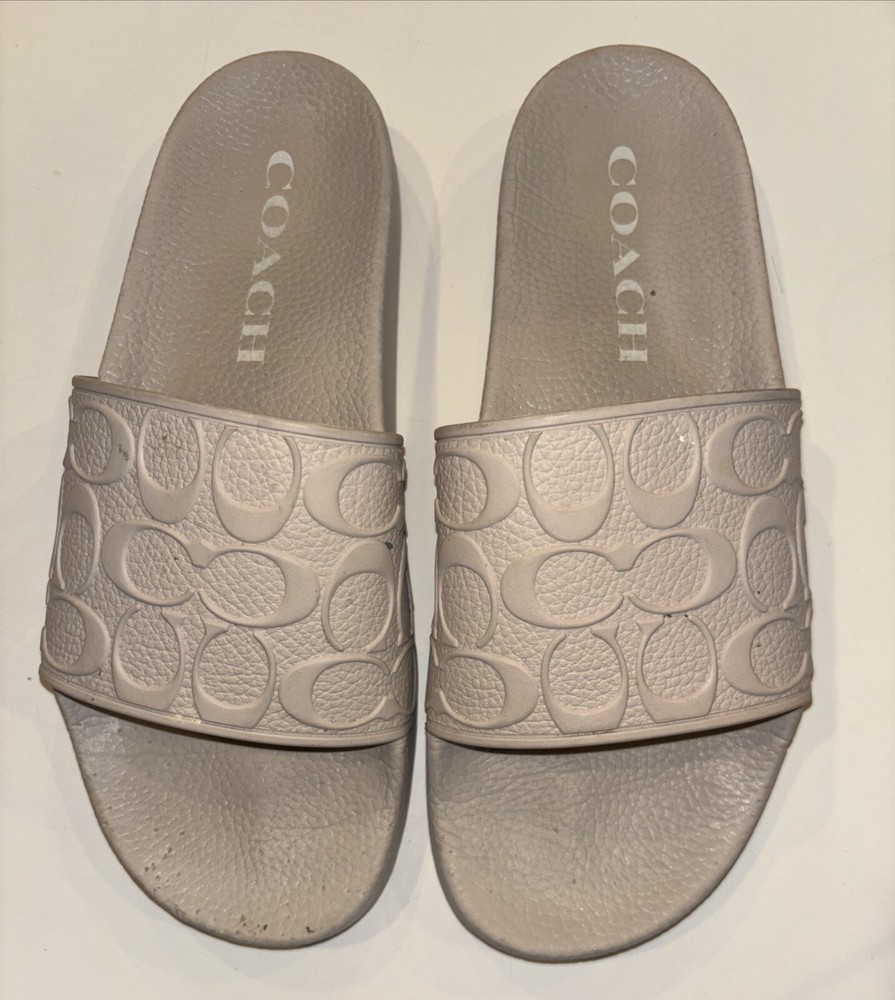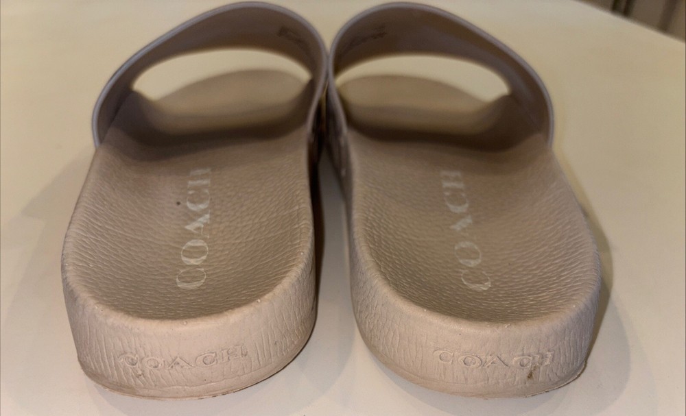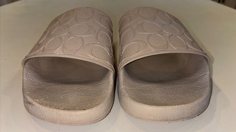 The COACH POOL Slide Cushion Sandal is a men's slip-on sandal in a size 9 US (EU 42). Designed for travel and casual wear, the beige sandal features a rubber outsole and cushioned insole for comfort. The Coach Signature logo accents the solid patterned upper made of rubber material, making it suitable for outdoor and sports-themed occasions in the summer, fall, and spring seasons. Ideal for medium width feet, this versatile slide is a stylish and practical choice for everyday wear.