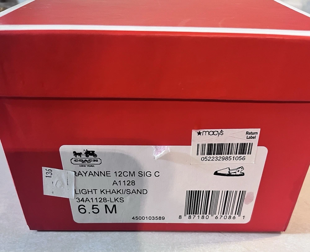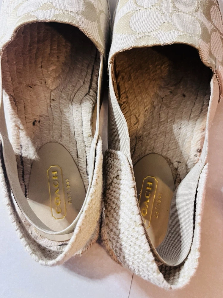 Elevate your style with these Coach Rayanne 12CM Signature C Espadrille in Khaki. These flats are perfect for casual occasions and feature a slip-on closure for added comfort. The buckle and canvas upper material add a touch of sophistication to these loafers. Very clean. See pictures
