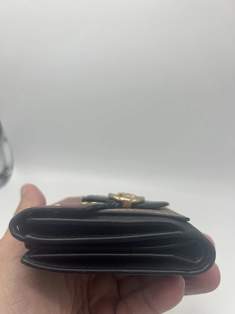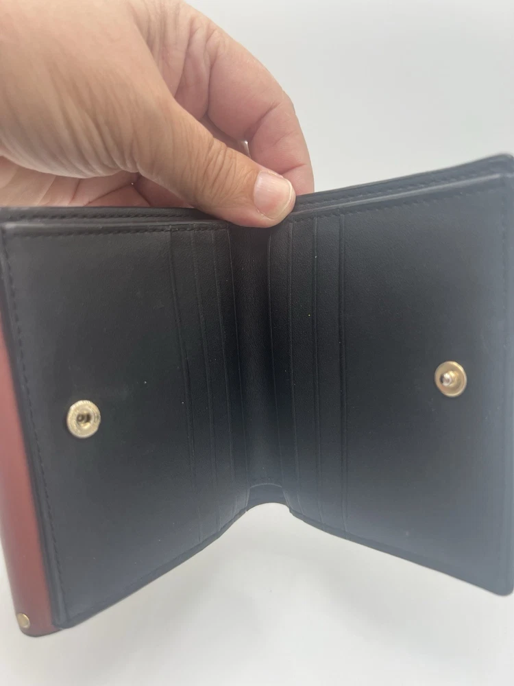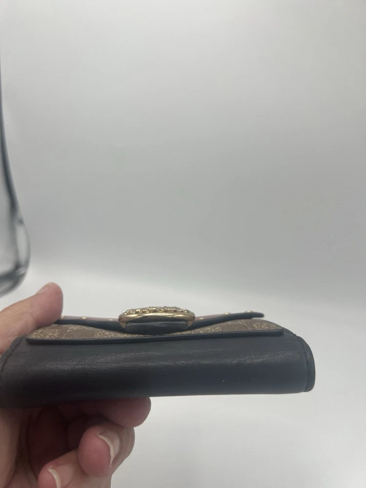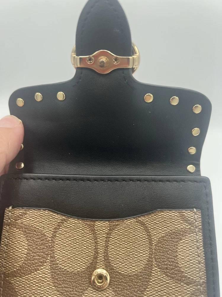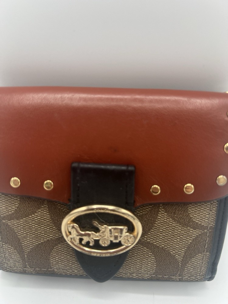 This Coach wallet is a must-have for any fashion-forward woman. With its colorful and vibrant design, it is perfect for adding a pop of color to your accessory collection. Made from high-quality leather, this wallet is durable and built to last. Featuring a two-fold design, this wallet is perfect for storing all of your essentials, including your cash, credit cards. The rivet accents add a touch of edginess to the overall design, making it perfect for a woman who wants to make a statement. Whether you're running errands or going out for a night on the town, this wallet is sure to become your go-to accessory.