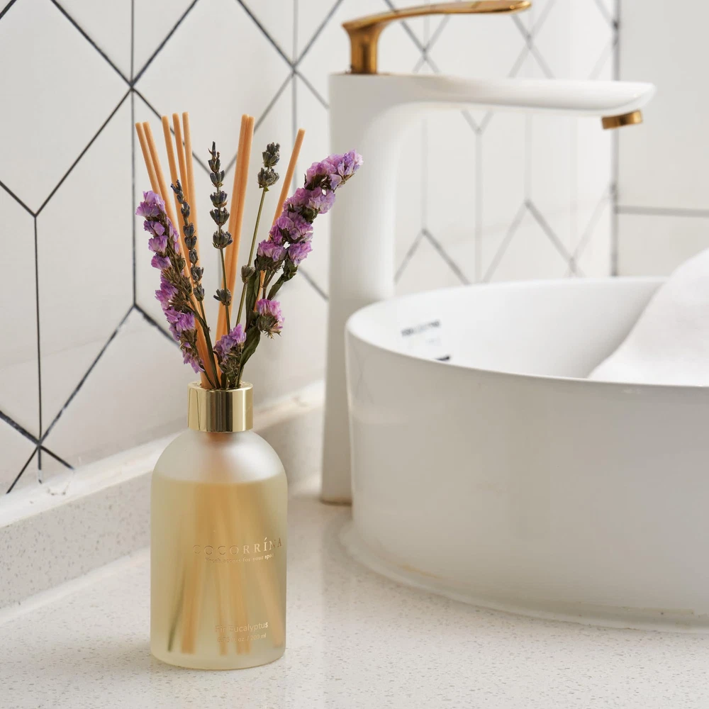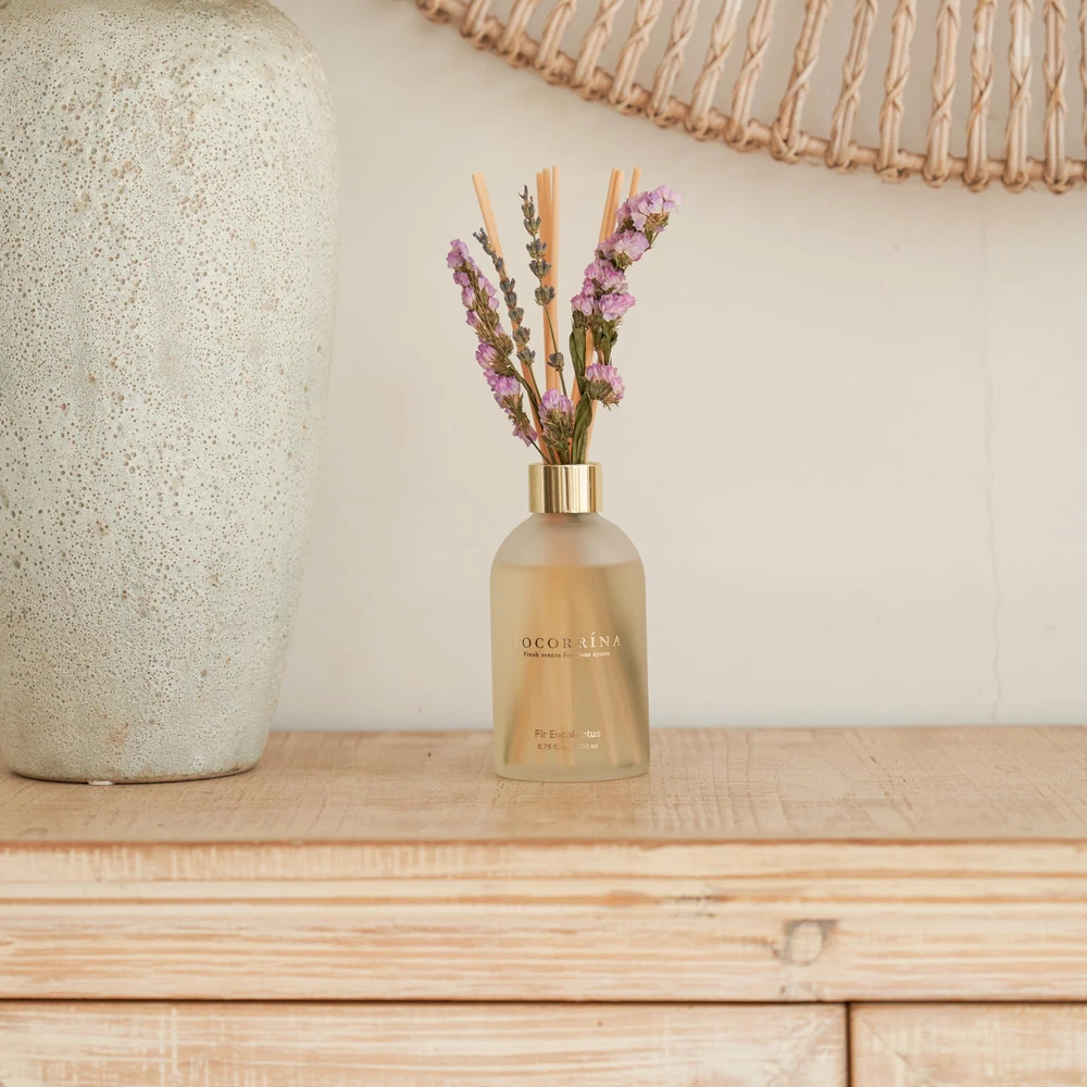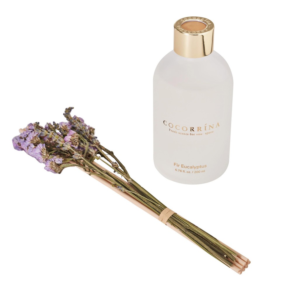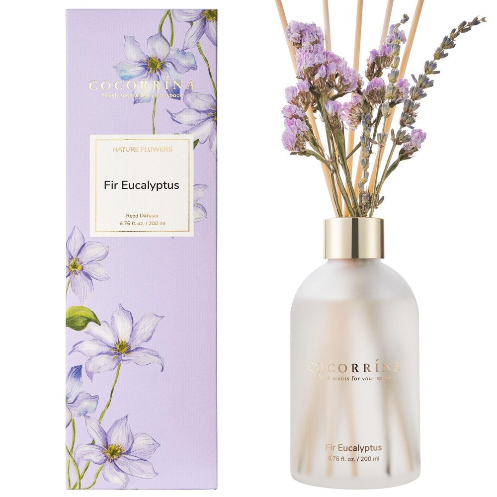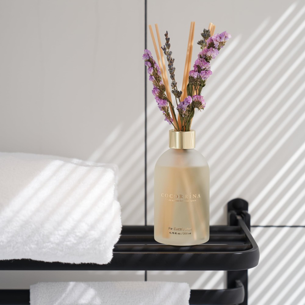 Scent: Fir Eucalyptus. The green air from nature is as fresh as a breeze. The bright and powerful eucalyptus leaves and fir fragrance are refreshing, giving people an association of sterilization, safe and healthy. Long-lasting fragrance: Enjoy the refreshing scent of fresh flowers in your home for an extended period, as the COCORRÍNA Flower Reed Diffuser is designed to slowly release the fragrance without overwhelming the space. Easy to use: Simply place the reed sticks into the bottle, and they will effortlessly draw the fragrance up, releasing it gently into the room. No need for any plugs or batteries. Versatile placement: The compact size of the COCORRINA New Flower Reed Diffuser allows you to place it on various surfaces, such as shelves, coffee tables, or bathroom countertops, bringing a touch of freshness wherever you desire. Ideal Gifts: The reed diffuser makes a thoughtful and elegant gift for birthdays, housewarmings, anniversaries, or any special occasion, allowing your loved ones to indulge in a luxurious and aromatic experience at home.
