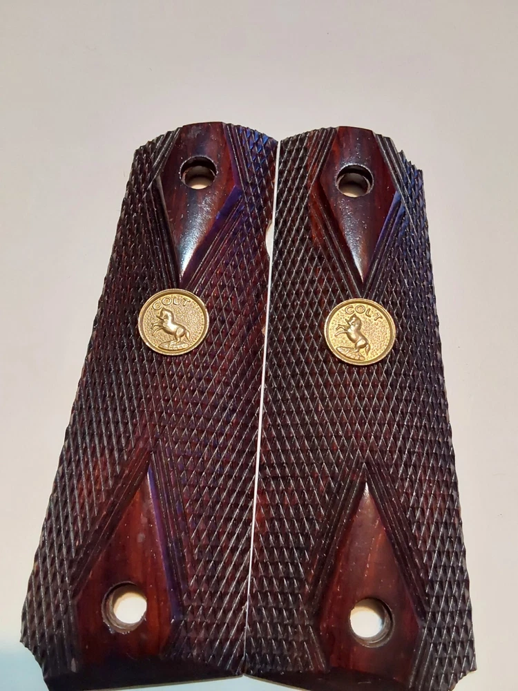 COLT FACTORY 1911 WOOD GRIPS IN EXCELLENT CONDITION, I BELIEVE THEY CAME OF A 1990 SERIES 80 GOLD CUP PISTOL, BECAUSE THEY WERE IN THE BOX WHICH I HAVE LISTED ALSO. SHIPPED USPS GROUND ADVANTAGE IN CARDBOARD BOX