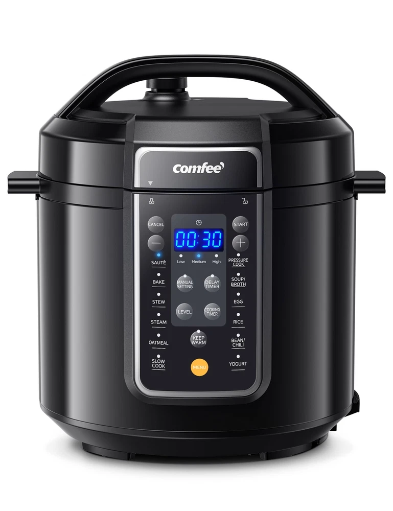 COMFEE’ 9-in-1 Electric Pressure Cooker, 14 Presets Instant Multi Cooker Olla de Presion Non-Stick Pot Yogurt Maker Rice Cooker Slow Cooker Sauté Steamer 6 Quarts Black 9 IN 1 MULTI PRESSURE COOKER: Work as pressure cooker, slow cooker, rice cooker, steamer, Sauté, yogurt maker, cake maker, egg maker and food warmer 14 PRESETS SATISFY ALL YOUR COOKING NEED: This versatile pressure cooker has 14 programmable preset functions, allows you to cook various gourmet dishes like meat, broth, bean, oatmeal, etc. with just a few steps PROFESSIONAL SAFETY FEATURES: Equipped with 10 safety features to guarantee easier and securer cooking, including overheat protection, auto pressure release and lid-safety lock system, etc INTELLIGENT DELAY TIMER: 24h delay timer function enables you to set your desired recipes in advance and enjoy gourmet dishes whenever you want ABUNDANT ACCESSORIES: COMFEE’ Pressure cooker comes with 6 helpful components: Spoon*1, Ladel*1, Condensation Cup*1, Measuring Cup*1, Steam Rack*1, Power cord*1