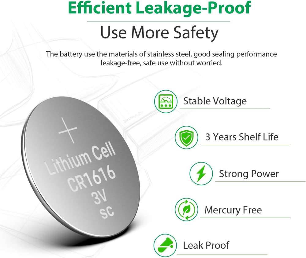 SAFE AND RELIABLE: LiCB Since 2006,Specialize in Battery 12 Years. CR1616 Button Coin Cell Tested under Strict Quality Control Standards. CE and ROHS Certified. Grade A cells CR1616 Ensure Longer Battery Life and Long Lasting Power. Long-Lasting AND COST-SAVING:Get the 20 PCS Exact Fresh CR1616 Battery, Have Full 3 Volts Charge, 3 Years Shelf Life. Safety AND LEAK FREE -- Zero Mercury LiCB CR1616 Batteries Offer Premium Performance in a Variety of Devices. LiCB Batteries are Designed not to Leak in Devices During Their Usage and for up to 3 Years after They are Left in a Device. MULTIPLE COMPATIBILITY : Equivalent to other Brand Models, Like 1616 CR1616 DL1616 ECR1616 BR1616 and Works Perfect for Remote Control, Watch, Calculator,Electronic Notebook,Thermometer, Mobile game. What You Get: 20 PCS CR1616 Batteries in Exact Blister Pack.18-month Warranty and Friendly Customer Service. LiCB CR1616 Battery,Long-Lasting & High Capacity CR1616 Lithium Batteries,3 Volt Coin & Button Cell ( 20-Pack)