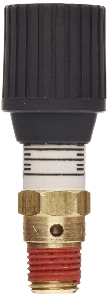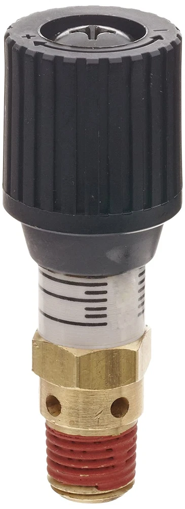 Relief pressure adjustable from 0 to 100 psi 1/4" male NPT threaded inlet connection Brass construction and stainless steel spring for corrosion resistance Silicon O-ring provides leak-proof seal to within 10 percent of set pressure Micrometer-style nylon knob for pressure relief adjustment This Control Devices CR25-100 pressure relief valve has a brass body, an adjustable relief pressure, a 1/4" male NPT threaded inlet connection, and a fluorocarbon O-ring. The valve's brass body, brass valve seat, and the stainless steel poppet resist corrosion and can be used in operating temperatures up to 250 degrees F. The valve can be adjusted to open between 0 and 100 psi using the micrometer-style nylon knob. This safety valve has an 6 standard cubic feet per minute (SCFM) flow rate and is suitable for low flow pressure relief applications such as in tankless air compressors. Relief valves remove excess pressure or vacuum from a system. The valve openings allow fluids or gases to escape to decrease pressure, and then close once the valve reaches the reseating pressure limit. They also relieve excess vacuum by opening to release a gas into the system and then closing after it reaches its low-pressure limit. Some relief valves have an adjustment mechanism to set the pressure where the valve opens, making it suitable for various applications. Relief valves are rated according to the volume of liquid or gas that can flow through them and the material that the valve is constructed from must be suitable for the fluid or gas, which may be corrosive or at an extreme temperature, in which it operates. Relief valves are used in a variety of applications, such as air compressors, petrochemical and chemical manufacturing, natural gas processing, and power generation. Control Devices manufactures valves and other flow control devices. The company, founded in 1963, is headquartered in Fenton, MO.