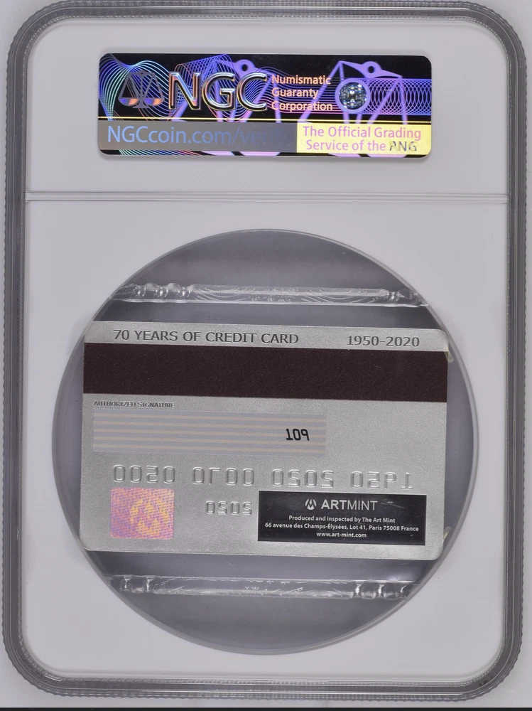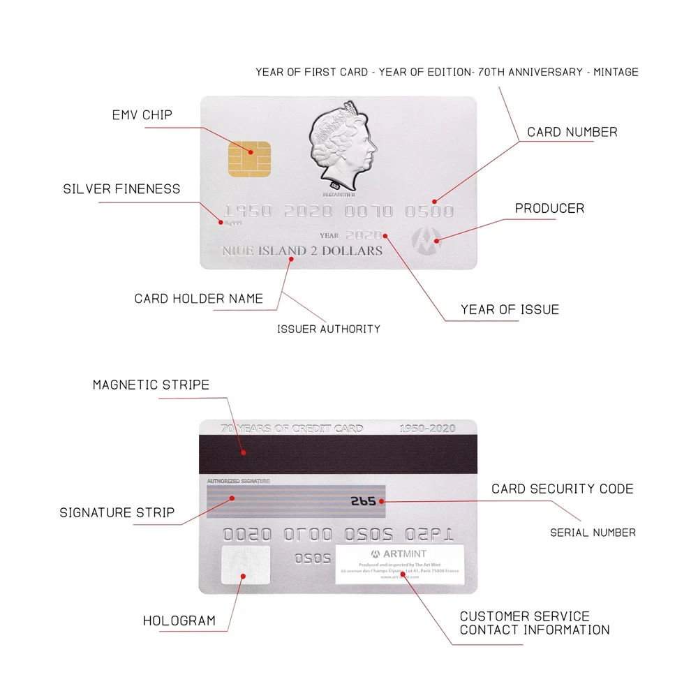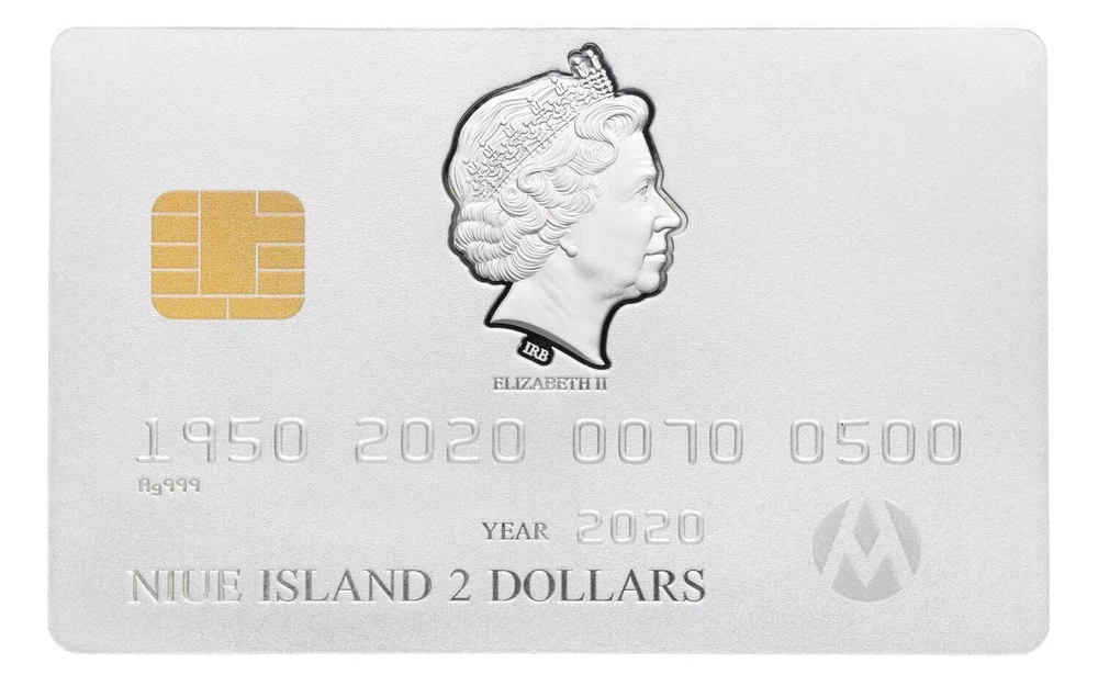 CREDIT CARD 2020 NIUE 1 1/2 oz SILVER COIN $2 NGC PF 69 MATTE FIRST RELEASE Over the years, credit cards have evolved. Magnetic strips were added, then EMV chips. More than 70% of adults now own at least one credit card, adding up to around 2.8 billion active cards worldwide.This year we celebrate the 70th anniversary of this revolutionary invention by offering an exquisite coin imitating a real life credit card. With exact measurements conforming to the ISO/IEC 7810 ID-1 it contains every important element - including a magnetic stripe, security hologram, imitation chip and a signature field. Each coin is marked by its individual serial number, ensuring its authenticity. The coin itself is enclosed in an elegant box, including the Certificate. NGC CERTIFIED PF 69 MATTE FIRST RELEASE RARE Credit card shape Security hologram Magnetic stripe Signature stripe Serial number Year: 2020 Quality: Inverse proof Denomination: 2 Dollars Metal Content: 1.5 Troy Ounces (46.46 Grams) Purity: .999 Mintage: 500 Manufacturer: Art-Mint Dimensions: 85.60 X 64.00 mm Presentation Case, Certificate of Authenticity Over the years, credit cards have evolved. Magnetic strips were added, then EMV chips. More than 70% of adults now own at least one credit card, adding up to around 2.8 billion active cards worldwide.