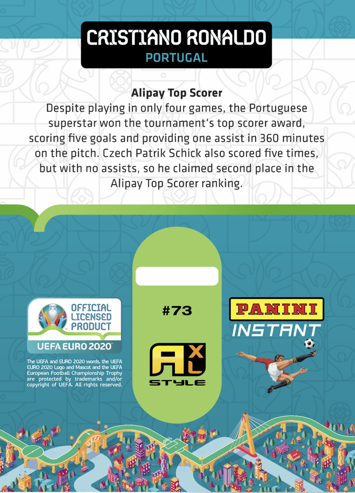 CRISTIANO RONALDO EURO 2020 PANINI INSTANT 2021 CARD #73 Ready for immediate shipment Last few available! Offered here are brand new Panini Instant one-day limited print run of 3379 cards for PORTUGAL - CRISTIANO RONALDO - EURO SUPERHERO - 2021 . Please note that photos 1 & 2 are Panini stock images. Each purchase receives one brand new mint/near mint card packed by Panini in a plastic penny sleeve and placed inside a toploader. Ships in a bubble mailer via USPS First Class Parcel. Visit My eBay Store: Ottofield Sports Sign up for my email newsletters by adding my eBay Store to your Favorites