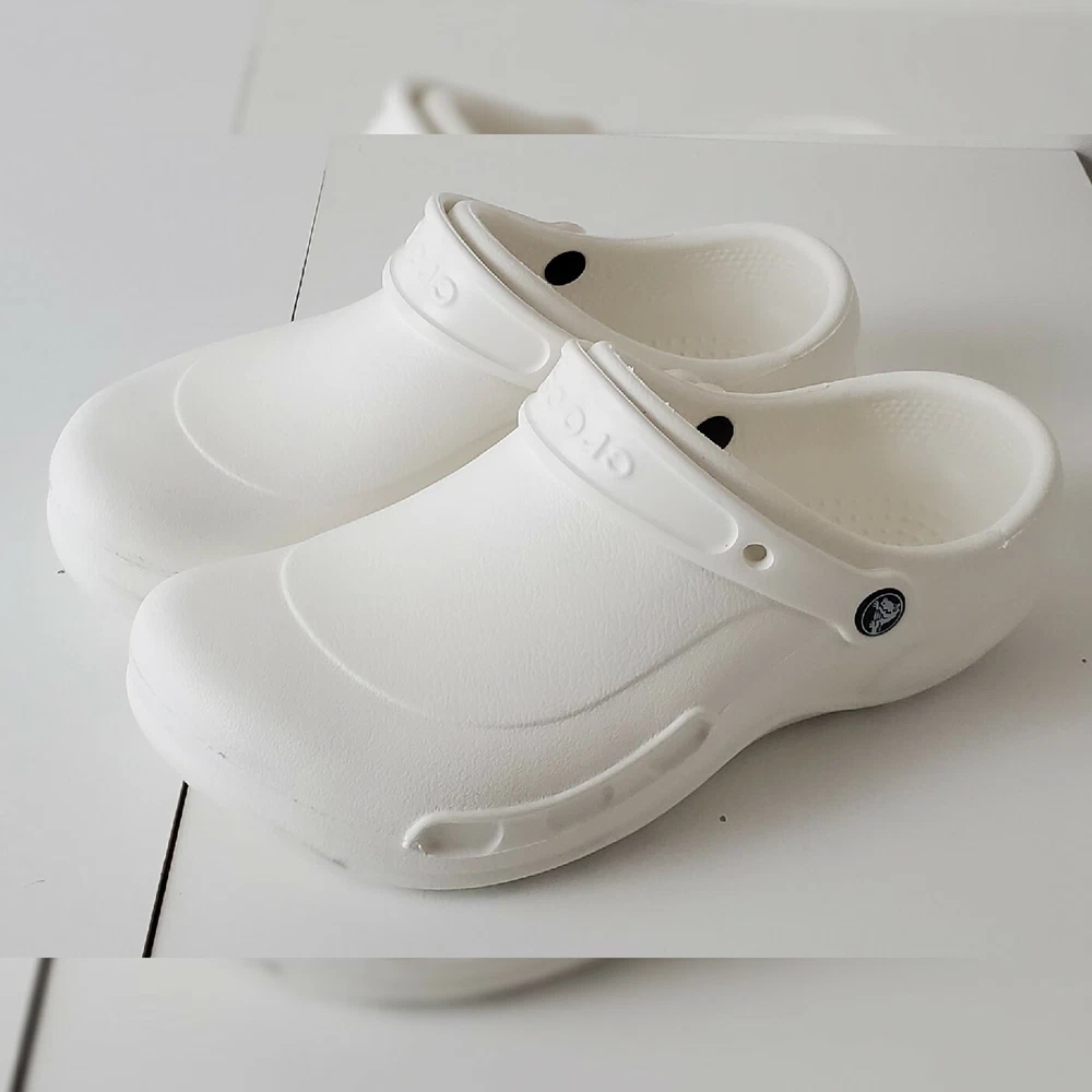 CROCS AUTHENTIC AT WORK ESPECIALIST CLOG SHOES SANDALS MEN'S WOMEN'S CERTIFIABLY COMFORTABLE SIZE M8 W10 WHITE LIGHTWEIGHT NEW WITH TAGS. The Crocs™ Specialist CLOGS, work shoes that let your feet breathe. With an increased metatarsal area, this clog offers additional protection for the top of your foot. A croslite™ footbed, closed heel and raised edging around the portals make this the perfect shoe for work. New professional styling creates the ultimate comfort shoe for the workplace. Designed to meet workplace standards with a closed heel. Exclusive croslite™ material conforms to foot creating a custom fit. Supportive arch and footbed circulation nubs ensure all-day comfort. Side ventilation ports promote airflow and are inset to protect foot from spills. Thicker metatarsal area helps protect the top of the foot. Loose fit allows foot to bend and expand naturally. Odor resistant and bacteriostatic. Simply sterilize and clean in water and bleach.FEATURES EVA upper Slip-on with pivoting strap Round toe Croslite™ foam contoured EVA footbed EVA sole Imported