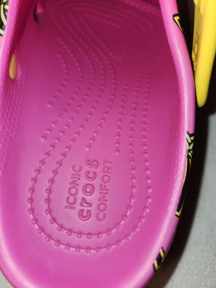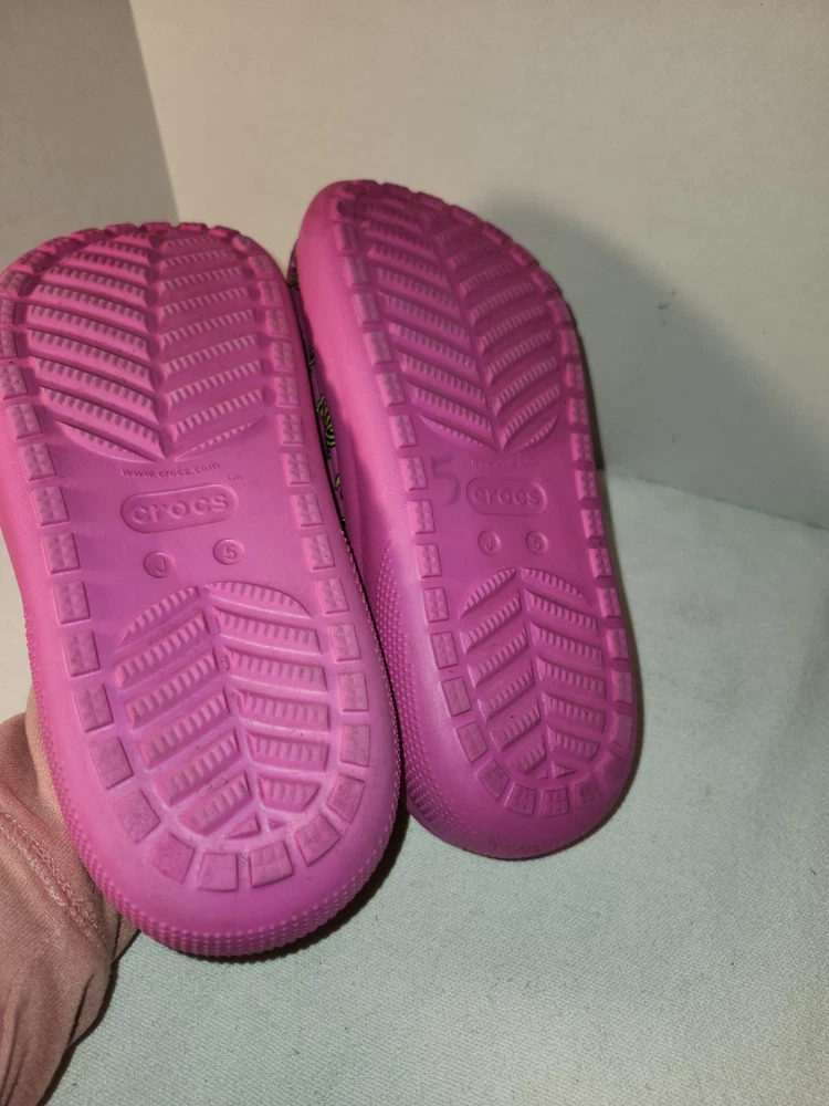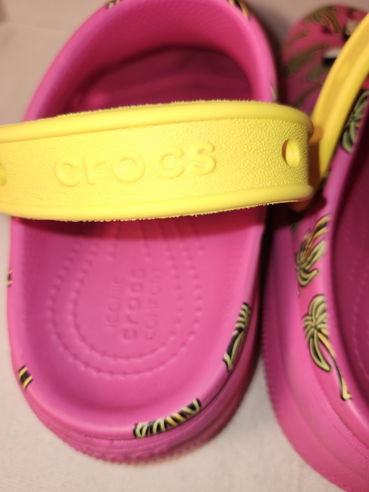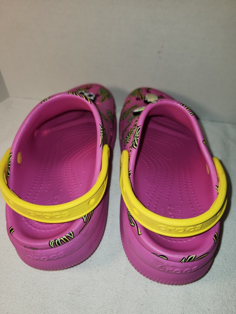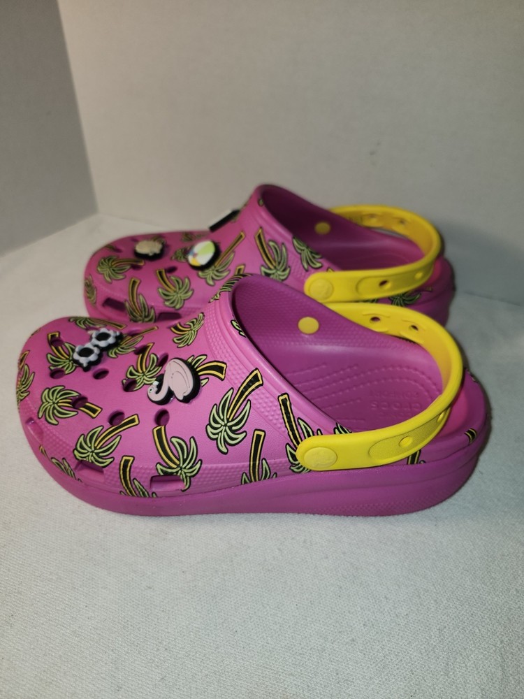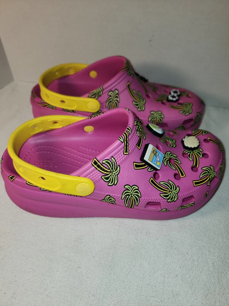 The CROCS Cutie Crush Spring Break Clog in Pink is a stylish and comfortable shoe for junior girls in size J 5. With a round toe shape, slip-on closure, and mid heel height, these clogs are perfect for travel and casual occasions. The floral pattern and logo accents add a fun touch, while the rubber outsole and cushioning provide durability and support. Whether at the beach or out for a day of adventure, these Crocs shoes are sure to make a cute and fashionable statement.