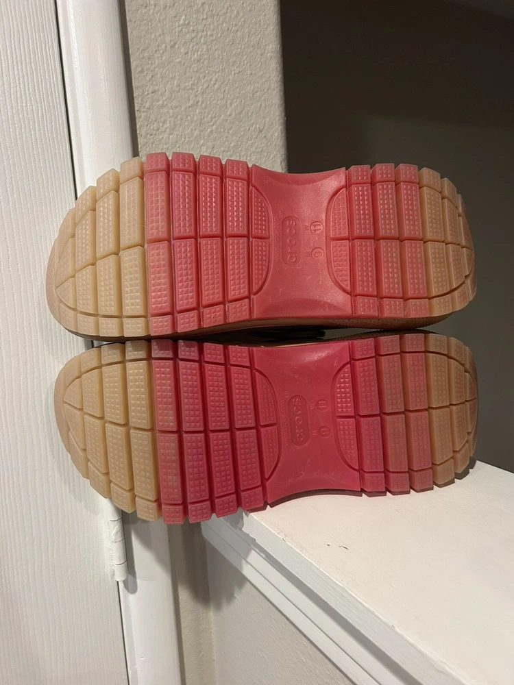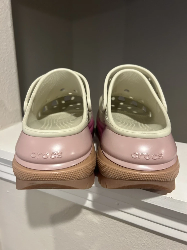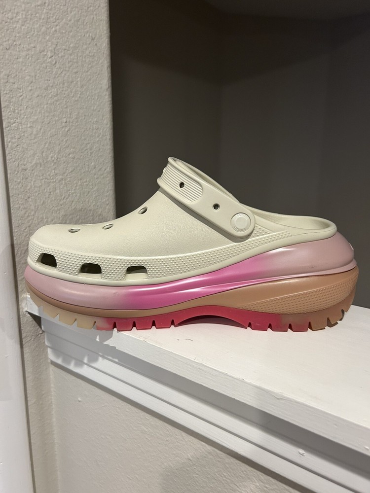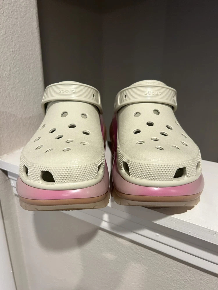These Crocs Mega Crush Platform Clogs in Bone color are a limited edition women's size 11. They feature a slip-on style with a solid pattern and a lightweight design. The synthetic resin upper and lining material offer comfort and durability, while the eva outsole provides traction. These clogs have a classic clog style with a platform heel, making them a stylish and practical choice for everyday wear.