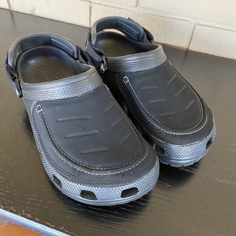 The CROCS Men's Classic Yukon Vista II Clog Sandal in Black is perfect for any casual or outdoor activity. The slip-on style and hook & loop closure make them easy to wear and the synthetic leather upper material provides a comfortable fit. The rubber outsole and synthetic lining material ensure durability and breathability, making them suitable for beach, hiking, or travel occasions. These sandals also feature an adjustable and rugged design with a classic solid pattern and logo accents. The medium shoe width and rubber insole material add to the overall comfort of the shoe. The Yukon Vista product line and crocs brand name provide a reliable and stylish addition to any wardrobe.