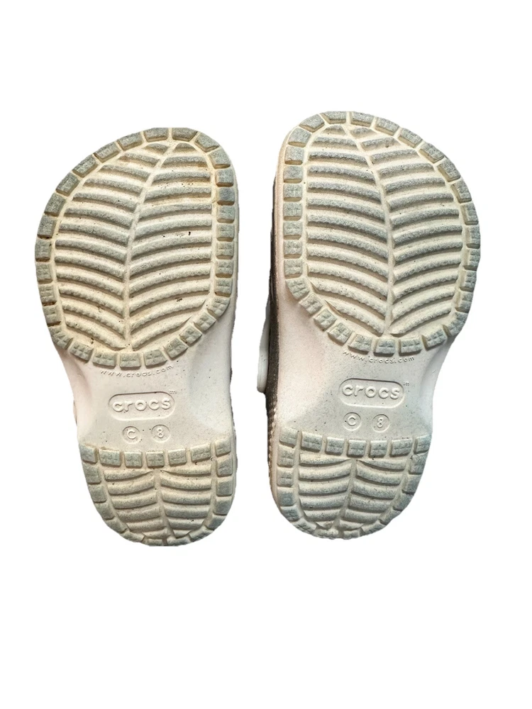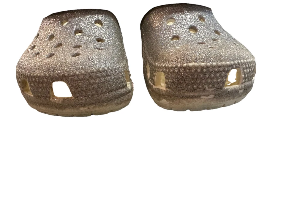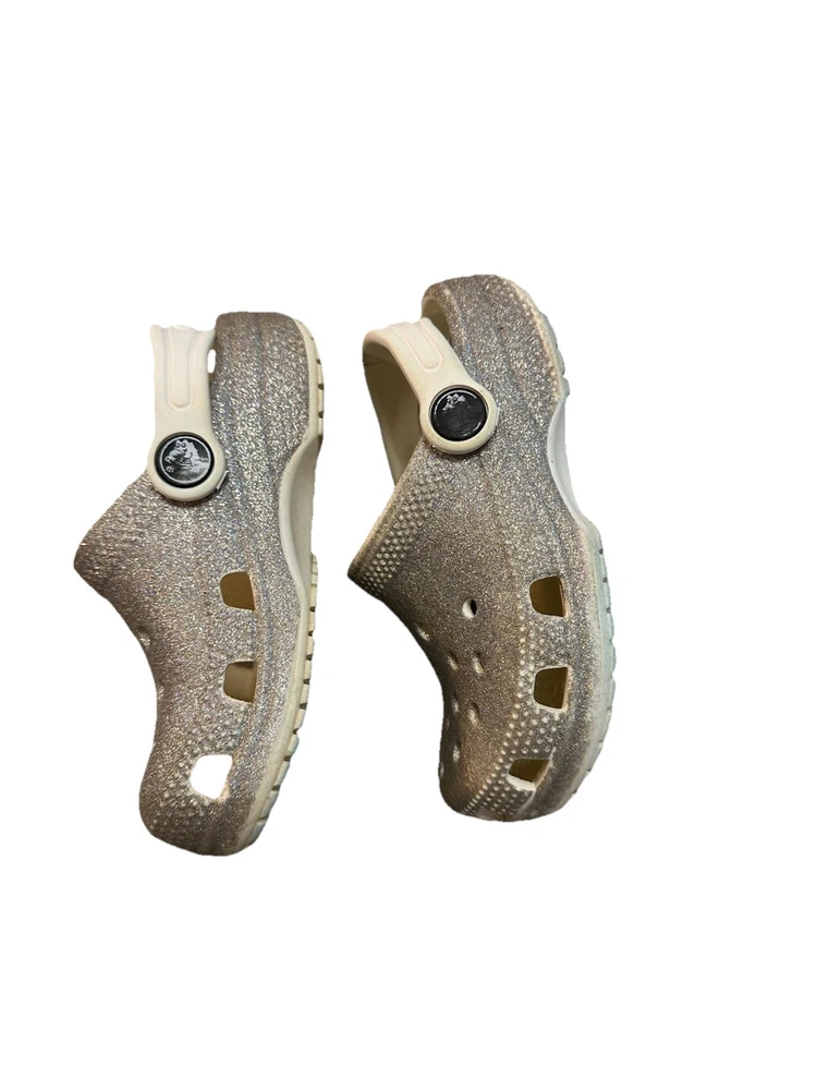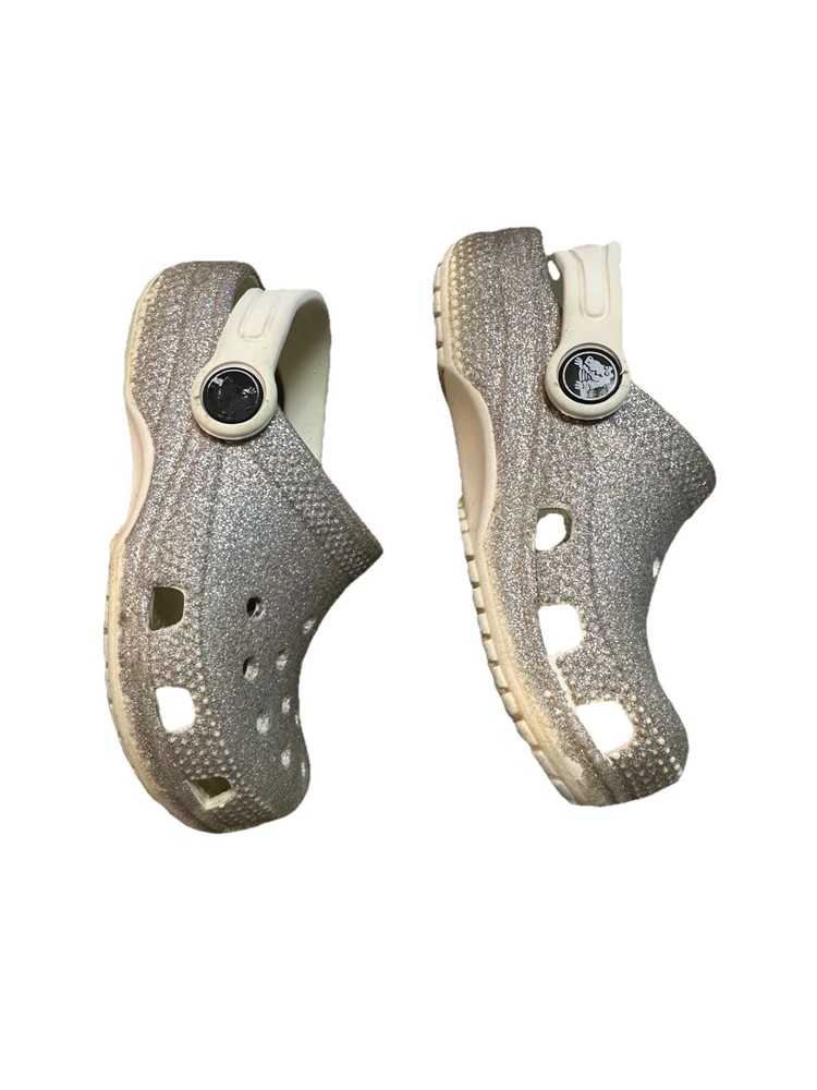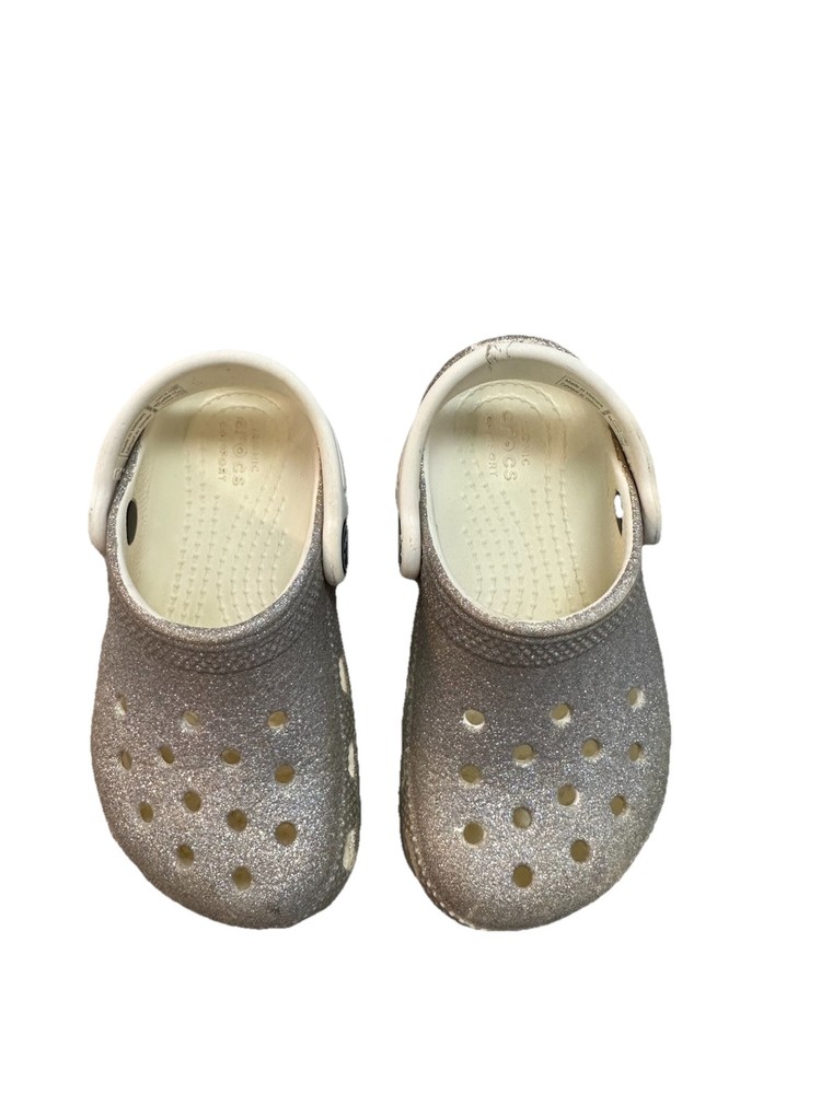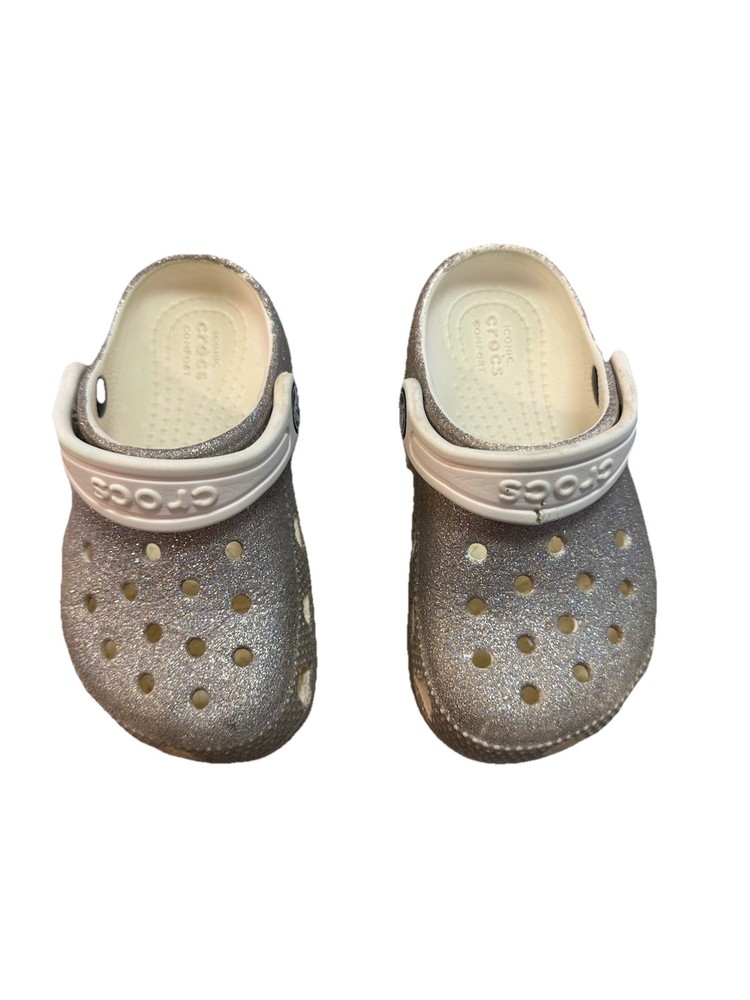 These are Crocs Toddler Classic Glitter Clogs in silver, size 8 for kids. They are slip-on sandals ideal for casual wear, travel, and various activities. The synthetic upper material features glitter accents, perfect for walking, playing, beach outings, and school. Suitable for summer, fall, and spring seasons, these clogs offer comfort and style for young girls. These Crocs are in good used condition. Only major flaw is the split in the strap of the left shoe. It splits about 1/3 of the width of the strap, so strap is still functional! These shoes have lots of life left!